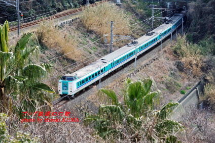 シュロの木と381系特急「くろしお」昨日ご覧いただいた海辺の場所では、列車はこのあとトンネルに入るのでございます。これまで何度もこのポイントで撮影をしてまいりましたが、トンネルを抜けた反対側がどうなっているのかは確認したことがありませんでした。撮影できるのかどうか分かりませんが、折角ですから、ロケハンをしてみましょう。なるほど。車が通れる道からも線路を臨むことはできますが、手前の木や架線柱の位置などが納得できません。しばらく周囲をウロウロしていたのでありますが、少し海側に移動すると、手前にシュロの木が生えていて、トンネルとトンネルの間で列車を捉えられる場所を見つけました。編成の後部はトンネルの中に入ったままになるでしょうが、それもよしといたしましょう。常緑のシュロの緑が目に鮮やかで、いかにも南国らしいカットに仕上がりました。少し早いですが、撮影はこれまでとし、海をはさんで向こう側に見える和歌山マリーナシティの黒潮市場にでも寄って、お買いものツアーといたしましょうか。撮影地:紀勢本線加茂郷~冷水浦今日3月29日は、マリモの日、八百屋お七忌、肉の日だそうです。