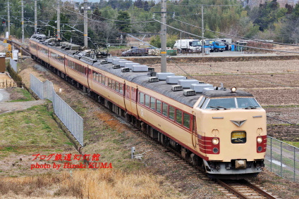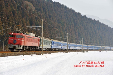 雪が残る湯尾のカーブを駆け抜ける寝台特急「日本海」ついにダイヤ改正までのラストウィークとなりましたね。残念ながら昨日(11日)は最後の日曜で、かつ午前中、大阪方面は晴れましたのに、どうしても外せない予定が入っていたため、泣く泣く撮影をあきらめました。でも先週は、その前の週から10連勤となって、さすがに疲労困憊してきたため、予定の入っていない平日に休みを取らせていただき、「日本海」から国鉄色183系まで、一まとめに撮影すべく、近畿を駆けまわってまいりました。全然休養になってないやん、というツッコミが聞こえそうですが、肉体的にはオフにならなくても、しっかり鉄分が補給できましたので、精神的には十分リフレッシュできたのであります。払暁5時に自宅を走りだし、向かったのは北陸本線南条~湯尾のお立ち台でございます。湖西道路を走っているころから夜が明け始め、穏やかな来光を見ると、このあとに控えている「日本海」との出会いに、いやがうえでも期待が高まってくるのでございました。7時半前、現地に到着しましたが、すでに30人ほどのファンがカメラの砲列を敷いて待ち構えております。おいおい、今日は平日やろ、とツッコミたくなりますが、それはそのまま、わたくしに帰ってまいりますので黙っておきましょう(笑)。きちんとした服装の方も混じっているところを見ると、出勤前の朝練なのでありますね。その熱意たるや、良し。頭が下がるのでございます。定刻、前夜から長駆してきた「日本海」はローピンのパーイチを先頭に姿を現しました。大阪では予想もしなかった雪とローピンの組み合わせに、このところの連続勤務に対してご褒美をもらったような気がいたしました。撮影地:北陸本線南条~湯尾今日3月12日は、サイフの日、パンの日、豆腐の日だそうです。