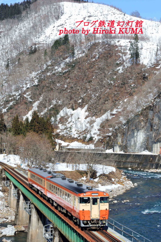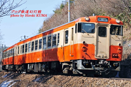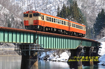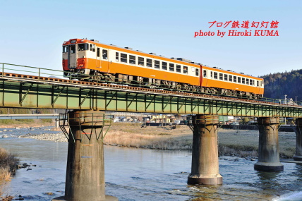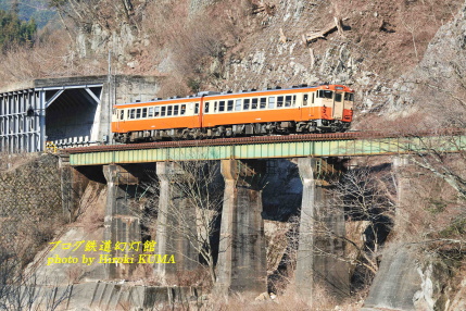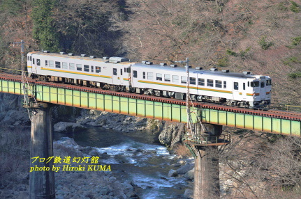 輝く朝日の中でガーダー橋を渡る赤ツートンこの朝の本命の場所は、これ以上望むべくもない光線状況で輝いておりました。願いは通じた!スノーシェルターから出た列車は、6連のガーダー橋を渡るのでありますが、長編成の「ワイドビューひだ」の場合は先頭部分だけを切り取ることになります。しかし、2輌編成の普通列車の場合ならば全く問題なく、橋の上にぴったりと収まるのでございます。シーズン的には錦秋のころが最高に美しいのでありますが、それを今求めても致し方ありますまい。逆に、冬枯れのこの季節は、木々が葉を落として枝だけになるため、直接列車に視線がいき、むしろすっきりと見通すことができるというものであります。やがてスノーシェルターの中を駆け抜ける列車の音が響いてきて、赤ツートンの前照灯が見えてまいりました。そして一瞬ののち、ガーダー橋を渡り始めました。枯れた、茶系統中心の情景の中で、国鉄色の赤ツートンは思いのほかに映えます。まるで模型のジオラマのような景色。これを撮影できただけでも、朝星をついて長駆してきた甲斐がございました。今日4月3日は、いんげん豆の日、日本橋開通記念日、ペルー日本友好の日、神武天皇祭だそうです。