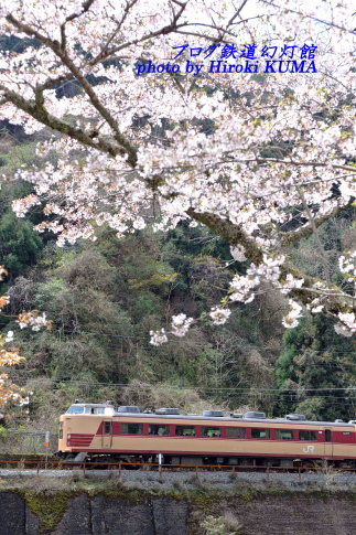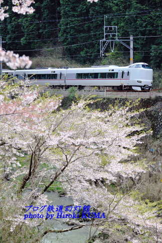 桜咲く渓谷を駆け抜ける287系「こうのとり」去るものがあれば、新たに来るものがあるのが世の定め。183系に代わる287系と桜の組み合わせは、今年からの新しい眺めであります。渓谷の桜と287系の先頭部を切り取ったのが、本日の「思い出の1枚」。この場所の桜はすでに盛りを過ぎ、薄緑の葉が少し芽吹き始めておりますが、来年からは基本的にこの景色になり、これまでの183系との数々の思い出を反芻すると、胸中いささか複雑な想いがするのでございますよ。