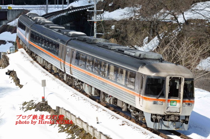 雪景色のカーブを駆け抜ける特急「ワイドビューひだ」観光名所の中心が高山となることもあって、特急「ワイドビューひだ」は定期運転されている11本のスジのうち、富山まで抜けるのは僅かに4本のみ。ほかは高山か、伸びても飛騨古川止まりであります。飛騨古川以北の渓谷区間では、特急も貴重なターゲットとなるのでございます。春は名のみ。むしろ、今なお冬といってよいほど、飛騨古川以北では、それまでと一転して残雪の量が増えてまいりました。お昼前、雪の残る撮影ポイントへ無謀にも車を突っ込んだため、一瞬スタックしかけて焦ったこともあり、特急「ひだ」の撮影では線路を見下ろすカーブからおとなしく俯瞰することにいたしました。あたり一面には雪がしっかりと残っており、この季節以外では、恐らくあれも、これも、という七難を純白の雪がしっかりと隠してくれていました。今日4月7日は、世界保健デー(WHO、1949年)だそうです。