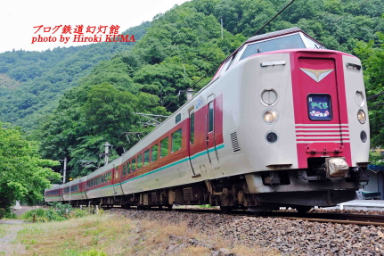 381系「やくも」のパノラマ車撮っては走り、撮っては移動する、の繰り返しは、いつものことでございます。「ブサかわ」381系「やくも」を撮ったあとも少し南下して、次の「やくも」に備えました。紀勢本線の381系「くろしお」同様、伯備線の381系「やくも」にもパノラマ車をつないだ編成がございます。パノラマ車輌は下り列車で先頭となりますので、次はもしかすると、と思っていたら予想どおりの展開でございました。S字カーブの向こうに姿を現し、車体をくねらせながら接近してくるさまを、これまたローアングルから正面土管で狙います。ワイドな前面ガラスが空を写し込んで、結構、格好よろし。撮影地:伯備線備中川面~方谷今日6月14日は、フラッグデー(アメリカ、13邦の星条旗が国旗として制定された日、1777年)だそうです。