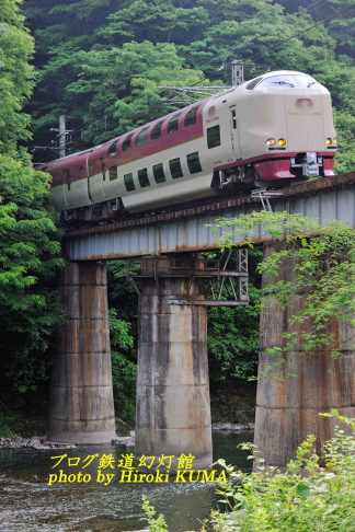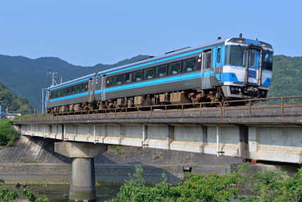 日和佐に向け高速で駆け抜けるキハ185系特急「むろと」妻の実家で1泊した翌日、帰阪の途中、帰りがけの駄賃として、またしてもキハ185系特急「むろと」を撮影することにいたしました。撮影ポイントは初めての所でしたが、以前からそばを何度も通っており、気になっていた場所でございました。鉄橋を渡る列車を、少し低めのアングルから狙う形になります。橋自体が緩やかにカーブしているため、車体を傾けながら通り過ぎていくキハ185系が撮れるはず。しめしめ、なのでございます。キハ185系の唸るようなエンジン音が響いてまいりました。列車接近でございます。次の瞬間、鉄橋の上に姿を現した「むろと」でありますが、は、は、速い!次の停車駅の日和佐まで1km足らずの距離なので、減速してほどほどのスピードで通過するものと思い込んでいました。予想外のスピードに一瞬あせりましたが、列車の動きにあわせてカメラをぶん回し、何とか捉えることができました。ほっ。撮影地:牟岐線北河内~日和佐今日6月8日は、成層圏発見の日、鳴門大橋開通記念日だそうです。
