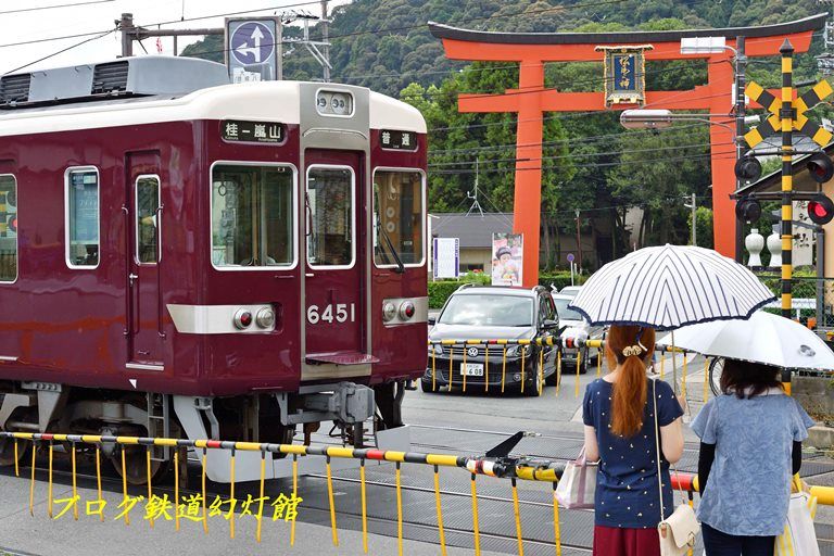 嵐山線の沿線には松尾大社があります。京都市の西部、四条通西端に位置し、東端の八坂神社(祇園社)と対峙して鎮座、東の賀茂神社(賀茂別雷神社・賀茂御祖神社)とともに「東の厳神、西の猛霊」と並び称され、西の王城鎮護社として位置づけられているそうです。また、中世以降は酒の神としても崇められ、現在も醸造家から篤い信仰を受けています。 松尾大社駅のそばから赤い大鳥居が見えますので、それと組み合わせたアングルで列車の到着を待つことにしました。ただ、この場所、撮影するのが結構難しいことに気づきました。道路と信号の関係から、踏切近くまで渋滞の車列が続き、遮断機の向こうに見える車は仕方ないとしても、手前にも停車中の車が入ってしまい、その時間帯が長いのです。う~む、どうしようと思案しているうちに、嵐山からの列車接近を告げる警報が鳴り出しました。 踏切を越えた車列が遮断機のそばまで伸びていますので、とっさに立ち位置を変え、少なくとも手前側に停まっている車が画面に入らないようにした瞬間、パラソルをさした京都マダムが2人、遮断機に沿って反対側の歩道からこちら側へと渡ってきました。あらら。 写真は引き算で、不要なものをできるだけ省くというのが1つの原則ですが、マダムたちが入ったことで踏切の向こう側の猥雑物が隠れましたし、夏の情景ということで季節感も表すことができました。まあ、結果オーライとしましょう。 撮影地:阪急電鉄嵐山~松尾大社 今日9月6日は、黒の日(京都黒染工業協同組合、1989年)、妹の日(妹の日実行委員会、1991年)、墨の日、クロスワードパズルの日だそうです。 KATO 10-941 阪急6300系 京とれいんタイプ 6両セット Nゲージ 動力車入り