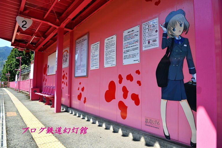 駅舎がピンクだけでなく、至る所にハートマークも描かれています。ハート形の駅名板、初めて見ました。さらに、待ち合いスペースには「鉄道むすめ」も描かれています。その名は「宮本えりお」さん。沿線では宮本武蔵が誕生し、同名の駅がある智頭急行ですから、姓がこれに因むのは当然のことでしょう。智頭急行の車掌として「スーパーはくと」に乗務している設定になっています。