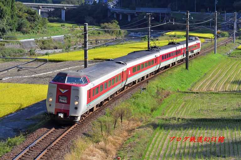手前は刈り取りが終わっていますが、奥は稔りの季節を迎えて黄金色に輝く稲田が広がっています。そのなかを 4 輌編成の 381 系「やくも」が駆け抜けていきます。これが撮れたので十分です。家路を辿ることにいたしましょう。