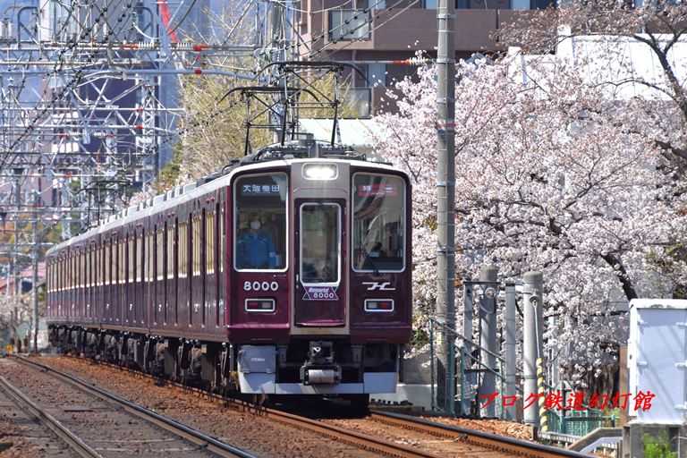 阪急電車にはただ今、春恒例の「さくら」ヘッドマークが掲出されています。デザインは昨年と同じですが、やはりヘッドマークがついているだけで、ああ、今年も桜の季節になったなあ、と感じられます。ところで、「さくら」ヘッドマーク掲出車の前に、デビュー時スタイルの復元装飾( H マーク、旧社章)に独自のヘッドマークをつけた 8000F ( 8000 系車輌誕生 30 周年記念列車)が通り過ぎていました。わたくし的には、こちらのヘッドマークを撮れたことの方がうれしかったりして。