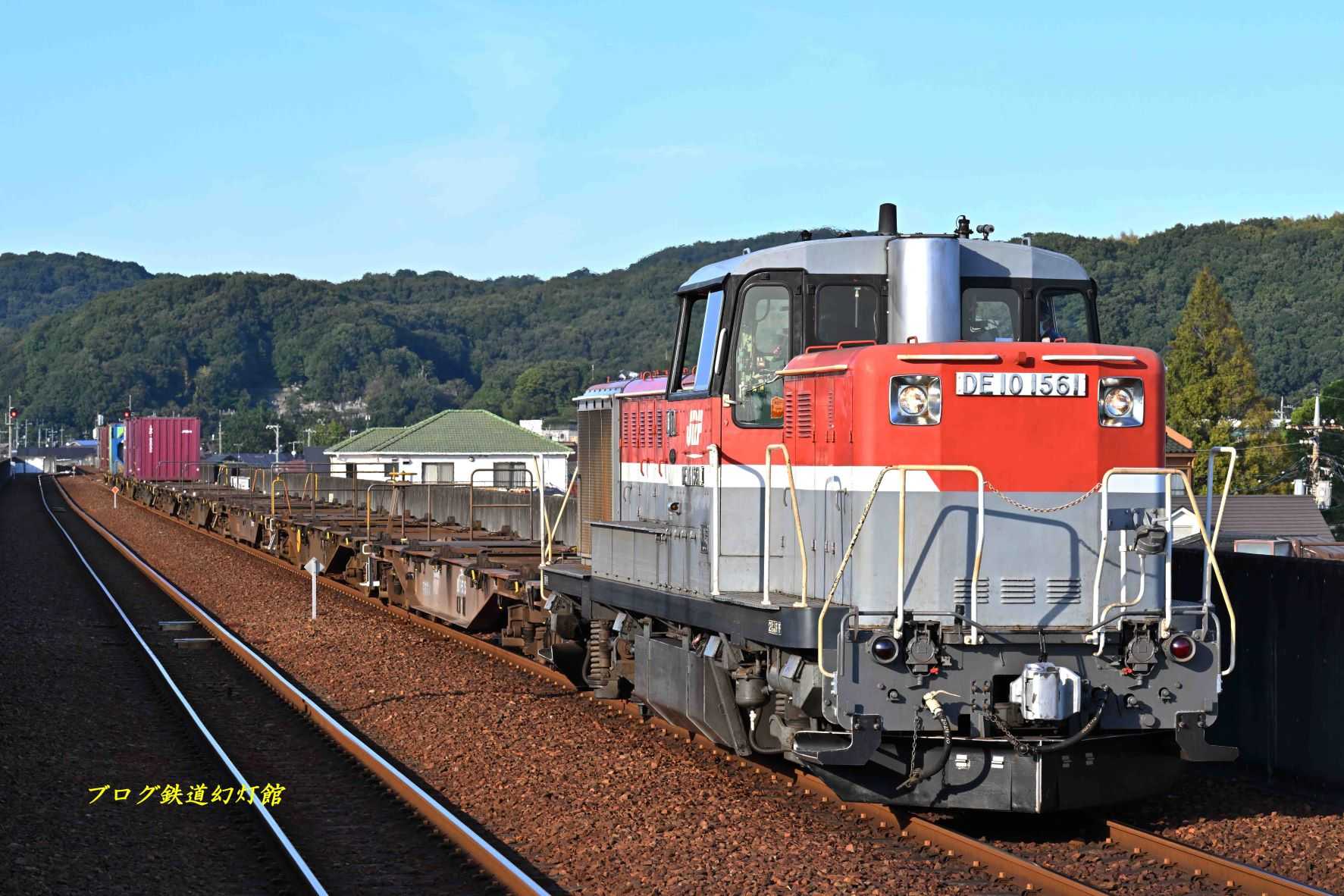 昼食を済ませてスタンバイに入ってからは、十分すぎるほどの予行演習を重ねることができ、その間には DE10 が牽く貨物列車も通過して、心ときめく瞬間を過ごせました。水島臨海の貨物列車を撮影するのは久しぶりです。ベテランさんが「機関車の次位は無積載のコキがつながることが多いです」と言われたとおり、 1 輌どころか、 5 輌ほどが空コキになっていました。日曜だから当然なのかもしれません。