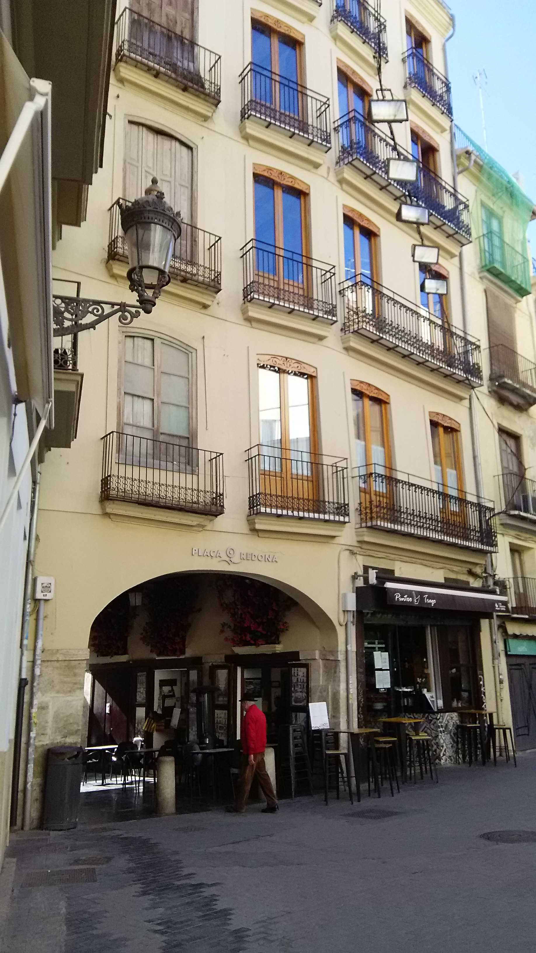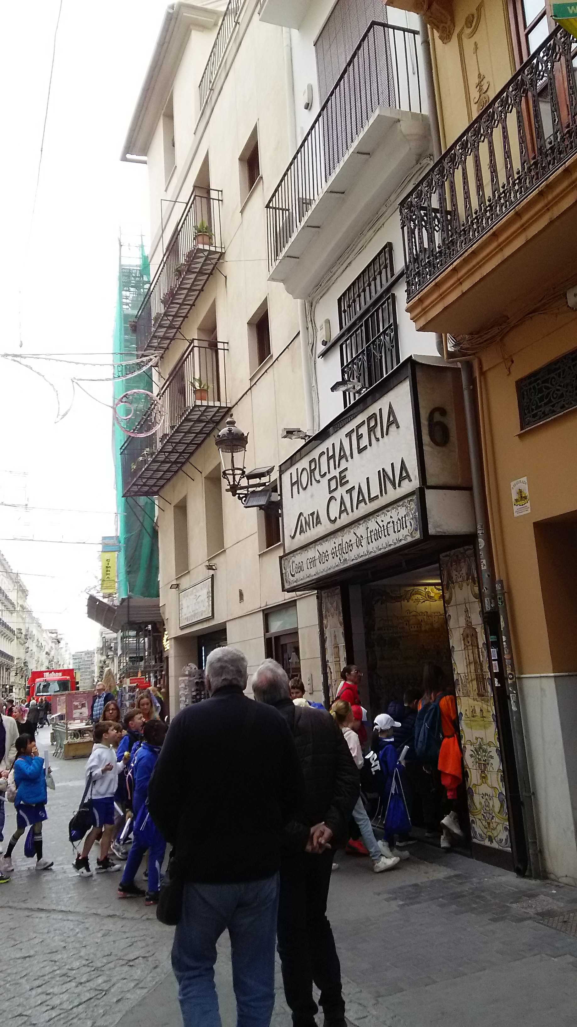 「ラ・ロンハ・デ・ラ・セダ」見学後街歩きを開始です!曇りなのと風があるとちょっと肌寒い感じがしますが、歩いていると汗がにじみ出るくらい暑くなってきて服装に困る気温だったなー。地図に頼らずぶらぶら歩きます。解らなくなってきたら大聖堂か中央市場を目指せば見慣れた道に出るので気にせずあちこち歩きました。方や半袖、方やダウンジャケット。体感温度が人によって違うのはわかりますが半袖の人を見ていると流石にさむそー…火祭りの期間中、白地に青い柄のスカーフを付けた人をよく見かけました。お祭りのシンボル的なものなのかな?チュロスやファルトン、パン等とホットチョコのお店を発見!人気店なのか人だかりが出来ています。この日は別のお店に行くと決めていたので行きませんでした。街歩きをしていたらバレンシア到着の日に来た広場に偶々到着!実は中では隣の建物とつながっていると聞いて「なんだ~」とは思ったもののこれはこれで面白いスペインの伝統的なお菓子を取り扱うお店もちらほらあります。このお店は結構古そうだなーと思っていたら1890年創業とのことでした。レドナ広場へ入る道レストランのテーブルで道が半分埋まってます。似たような状況で通りにくくなっている道があちこちにありました💦