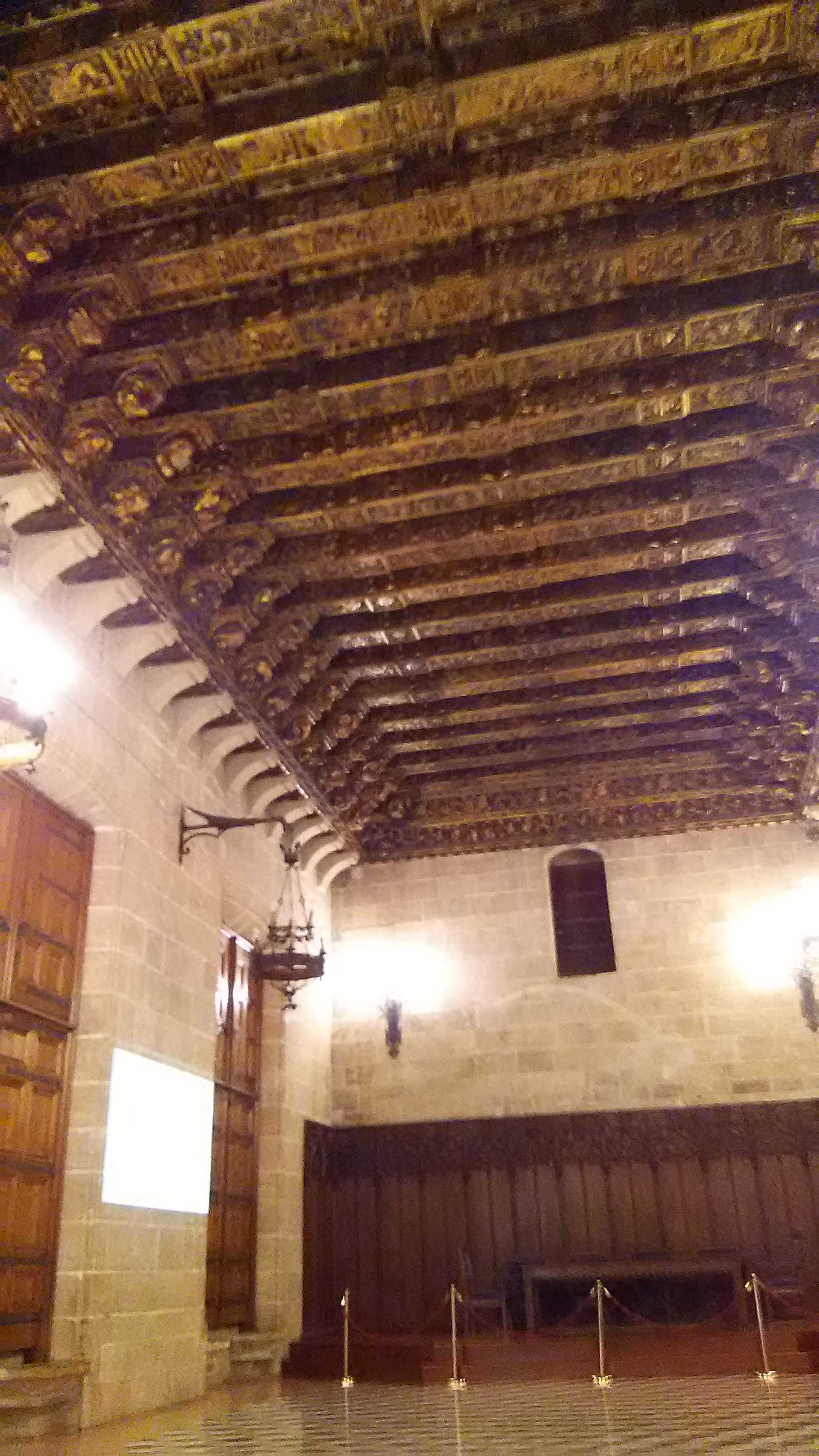 階段を上がった先にあった部屋に関しては説明がスペイン語で解らなかったのですが、重要な取引の話し合いでも行われた部屋なんでしょうか?随分豪華な印象の部屋でした。ここで学生さんの団体が長いこと先生らしき人の説明を聞いていて中々の賑やかさ^^;団体が部屋の中を移動したすきを狙ってパチリしていきました。会議室に見えなくもない天井を見ると貴族の邸宅みたい細かい模様が素敵です…♡学生さんが出入り口付近へ移動したと思ったら同じように待っていたらしい他の観光客の方々が移動してこの賑わい。床の細工がお見事。見ているとやや平衡感覚がおかしくなるのが難点(私は^^;)壁を使ってラ・ロンハ・デ・ラ・セダの紹介ビデオが流されていたのでしばらく見学。ビデオ上映がされているからかこちら側の壁には人が少なめでした。この木の窓を勝手に開けないでねーといった注意があります天井近くに有るこの扉はなんだろう…ガラスで覆われ保護してあったのできっと歴史的な意味のある扉なんだろうと勝手に推測ここでどんな商談があったんだろう…ここは座るのはもちろん触るのも禁止らしいです。天井の細工が見事なので皆さん上を向いています。私も天井ばかり見ていて若干首が疲れました。厳重に保護してあるしサインもあるのでラ・ロンハ・デ・ラ・セダが絹取引所として現役だった頃のものかも。それとも再現されたものかは解りませんが映画やゲームに出てきそうな雰囲気に惹かれます。見学を終えて帰る前にもう一度1階を見ていたらこの先にお部屋がありました。こちらは天井も低めでちょっとこじんまりとした感じですが天井の木の細工は職人芸で見事だし、扉も立派な細工の木製日本の木工細工を思い出します。部屋の広さや雰囲気から、取引関係者が待機する部屋だったのだろうか?それらを説明しているらしいビデオが上映されていましたが…スペイン語なので……お察しください(^o^;)