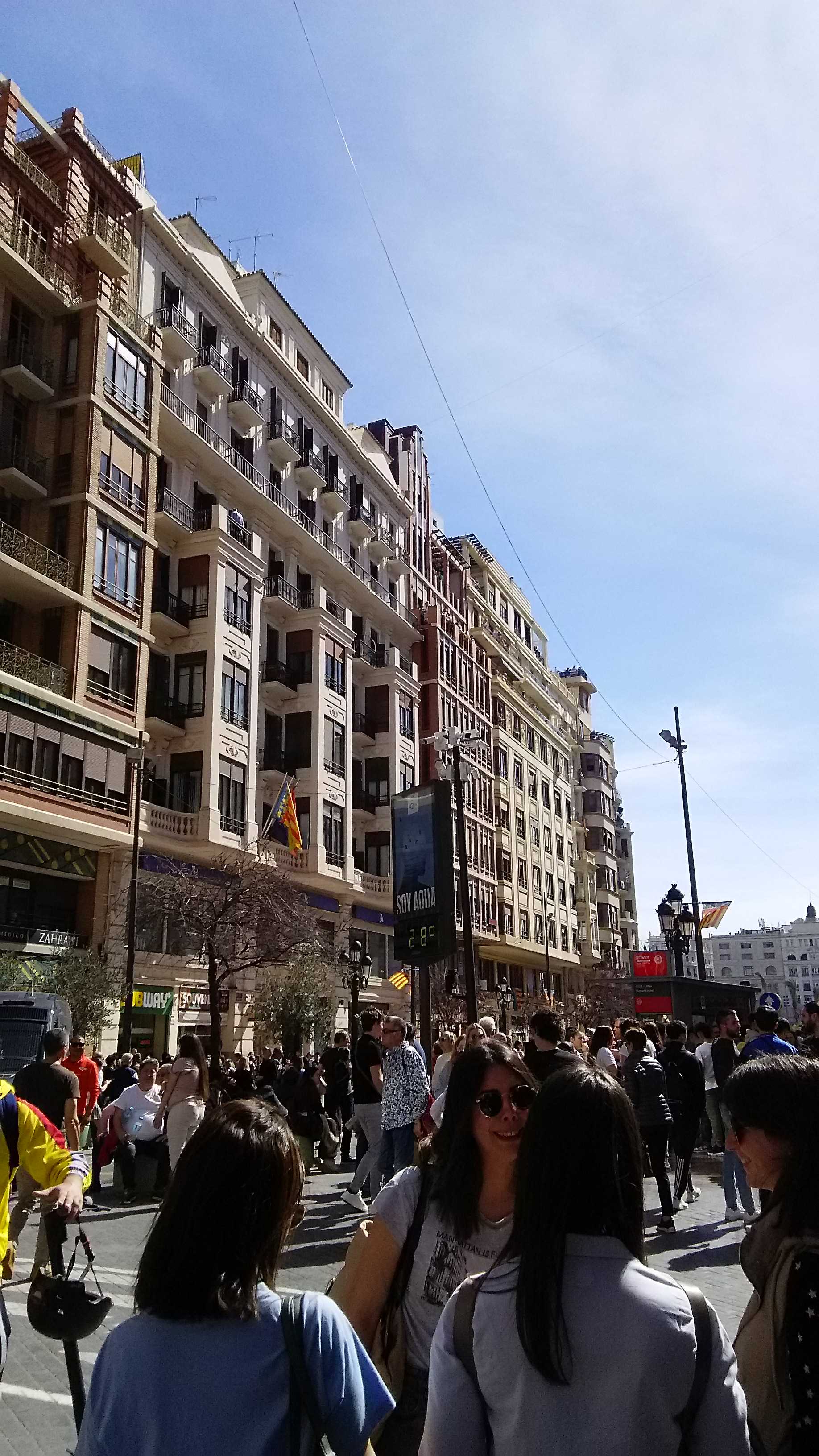 大聖堂の脇を進んで行くとビルヘン広場に到着です火祭りのマリア像(木製)が建てられるところですが、この時には(3/9)まだ何も用意されていませんでした。それでも有名な広場なので観光客でいっぱいです。この時、バレンシアの民族衣装を着た一団が現れ、レイナ広場方面へ進んでいきます。思わず後をつけました(*ノω・*)テヘレイナ広場にて音楽に合わせて皆さん踊っています。楽しそうでつられて踊る観光客の人もいました。いやー本当楽しそう!暫く踊っていた一団が再び移動を開始したのでおっかけます!市庁舎前辺りに到着したのが13:30頃。凄い人だかりでなんだろと思っていましたが14:00から市庁舎前で爆竹&花火のイベント「マスカレータ」が行われることを思い出しました。解りにくいですが既に広場は人でごった返していて進める状況ではありません。パレードの一団はするすると先へ進んでいきますが追っかけはここまでに!ぐあっ、またぼやけてる:(;゙゚'ω゚'):花火と爆竹が始まるまでまだ30分以上ありますがせっかくなので見学していくことにしました。個人旅行だとこういう臨機応変な行動ができるので良いですね近くに銃を携えた警察官がバリケードのように停めた警察車両とともに10人近く立っています。ちょっとどきどきしますがかえって安全かなーと思い見学場所を決定!それでも荷物に十分注意を払いながら開始を待ちます。そうすると近くにやたら周囲を気にする年配の女性がいます。最初は「誰かと待ち合わせかな?」と思ったものの様子がおかしい…目つきも怪しい…しかも何度も目が会いますし微妙にこちらへ近づいてきます…ひょっとして……アレな人かも(゚д゚)!「私はあなたの存在に気がついていますよ」と言わんばかりにその女性をジーーーーーっっと見つめました。そうしたら急にスマホを取り出し、喋りながら(もしくは振り)足早に人混みの中へ消えていきます。やっぱり狙われていた可能性大です(;・∀・)皆さんも国内・海外にかかわらず人の多いところでは十分にご注意くださいませ!!周囲を警戒しつつも待っていたら14:00に「マスカレータ」が始まります!開始の合図がなると周囲が一斉に歓声をあげて盛り上がり始めました!音だけでなく腹に響くくらいの轟音が辺りに鳴り響きます。あまりの轟音に鼓膜が破れないかと心配になりました。辺りが明るいので花火は殆ど見えないのが惜しい…最初は市庁舎前辺りしか漂っていなかった煙がどんどん辺り一帯に広がっていきます。目に染みそう…あまりの煙にむせる人もいるくらいです。途中からマスクを取り出して着用したら少しマシになりましたがそれでも周囲は火薬の匂いと煙で凄まじい状況でした。面白いのがそうなればなるほど周囲が盛り上がっていくところ。14:10の終了時にはより一層大歓声があがり、「マスカレータ」が終わるやいなや人が一気にはけていったのが凄い…メリハリがしっかりついているというかなんというか…