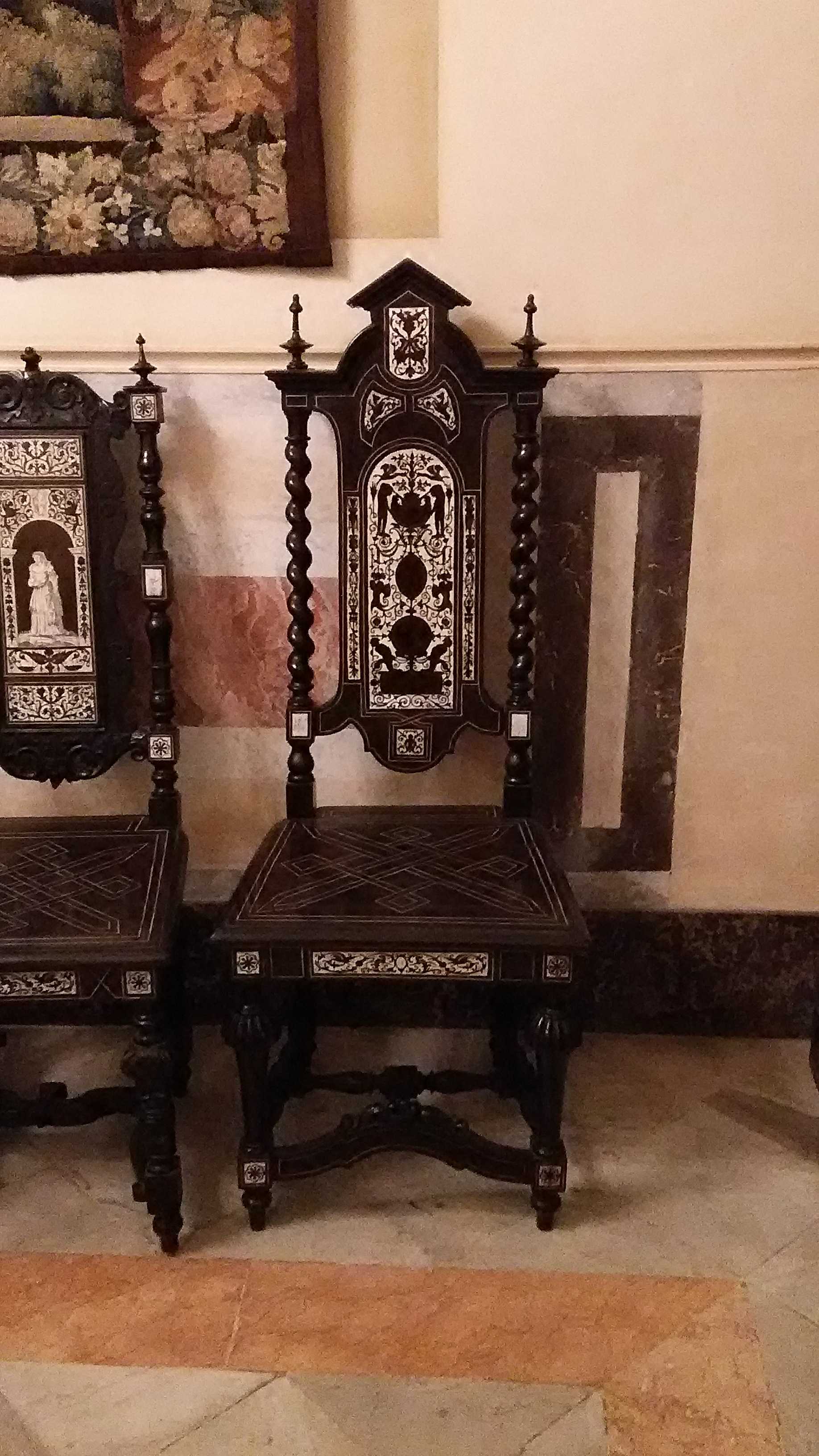 食堂の隣にあった小部屋の椅子。細工が細かくてお見事です!重要なお客さんを案内する部屋なのか財力を自慢したかったのか…座れないようにしてありますがちょっと座って見たかった吹き抜けのホールみたいなところも有りました。礼拝部屋まであります。こういったタイル張りの作品はバレンシア市内でもよく見かけました。廊下も階段も豪華だ…絵画が飾られたスペースも!振り子時計。流石に止まっています。何がはいっていたんだろう?廊下にポツンと置いてあった棚。壁は修復されてピカピカ真っ白だけど窓の部分はそのまま(らしい)長椅子が置いてあってゆっくり鑑賞が出来ます。時間はたっぷりあったので学生さんの団体が先に進むまでじっくり鑑賞させていただきました!