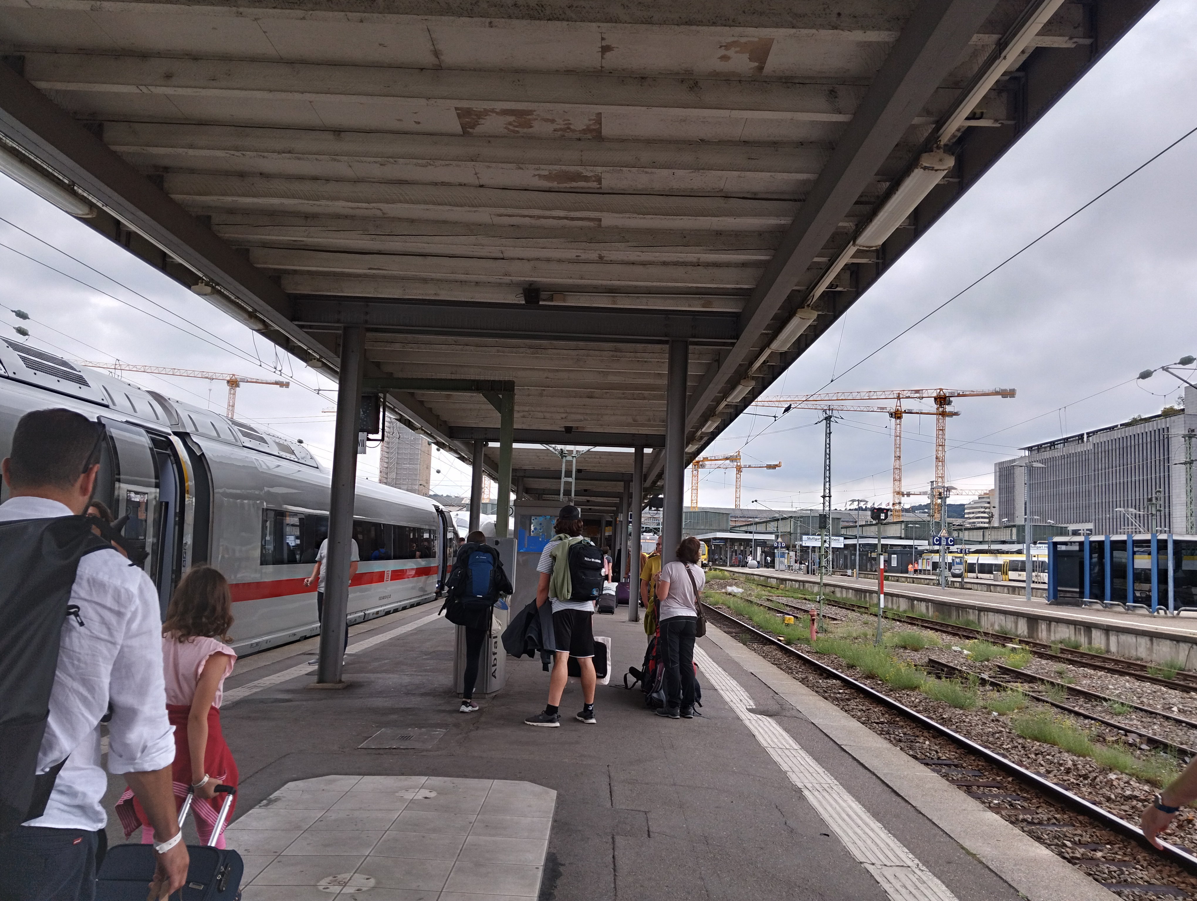 まずホテル・ロイヤルの最寄りSバーン駅からシュトゥットガルト中央駅まで移動。エレベーターとエスカレーターがあったお陰で階段を行ったり来たりせずに済み一安心。シュトゥットガルト中央駅は大工事中で移動ルートが乱れまくり※2025年5月現在どうかは解りませんが今だに工事中の可能性あり通常であればSバーンから出て道路を横断すれば直ぐ中央駅なのに、駅構内へ入るにはめちゃくちゃ遠回りをしなければならずこれが大変でした。信号待ち中に、紙コップを持ってお金を要求してくる女性たちに出会う。一人ではなくそこかしこにいた。私も声をかけられてつきまとわれそうになったがチラ見もせずガン無視結構!!手荷物をガッシリ抱えて「警戒しています」オーラを出しまくっていたら早々にターゲットを他の人に切り替えたらしく去っていった。荷物が重くて一度の青信号で渡りきれず中央にて待つことに…幸い私一人ではなく周りに何人かいたので浮くことは無かった。この後、あまりにもたもたしている私が気になったのか、見かねたのか地元の学生さんたちがスーツケースを段差のないところまで運ぶの手伝ってくれてとても助かりました皆さんありがとう!!中央駅隣のビルや建物内を通り抜けて駅構内を目指す。DB乗り場までのルートを地面に書いてくれているので迷わずに行けて良かった。途中おしゃれなカフェがあって寄ってみたかったが、人でいっぱいだったので止めておいた。駅構内に無事到着して利用予定のDBの出発ホームをチェック。この時点では「9番」。直前にホームが変わることもあるので移動しやすいところをウロウロ。駅構内の売店は殆ど開いていたのでそれらを見学しつつ、車内で食べる用の軽食や飲み物を探した。日本でも見かけるハンバーガー屋さんを見つけて買ってみようかと思うが…一つがかなりでかくてどうやらセットメニューしかないみたいで食べ切れる量ではない。売店では結局飲み物だけ購入。ホームが変わっても移動しやすいあたりのベンチは同じように考える人でいっぱい。スーツケースを並べておき、その上にリュックを乗せて出発時間を待つ。立っていると足元でハトさんがウロウロしている。近くにパンを食べている人がいて、その人がこぼしたパンくずを狙ってわらわらと別のハトさんも集まってきて賑やかだった。ほぼ定刻通り、出発ホームも変更することなく無事出発。荷物台がうまっていたので、空いている座席の隙間にスーツケースを置かせてもらうことに。12:09頃にやっと着席できた。また進行方向と逆だったが仕方がない…街を出ると畑や牧場や森がいっぱい。時々小さな地元の街を通過していく。12:25くらいに検札あり。DBでは49€チケットが使えないので別で予約済。スマホが使えない状況になっていたら大変なので、チケットは紙にプリントしていた。途中、周りに何もないところで急に停車。周りがザワザワする中、放送も何もなく10分近くそのまま停車していた。その後動き出すものの歩いたほうが早いんじゃないかというくらいのノロノロ運転が続く。ノロノロ運転していたかと思うと急にスピードが上がって進んでいく。ちなみに一切説明も何もなかったので理由はわからずじまいだった。