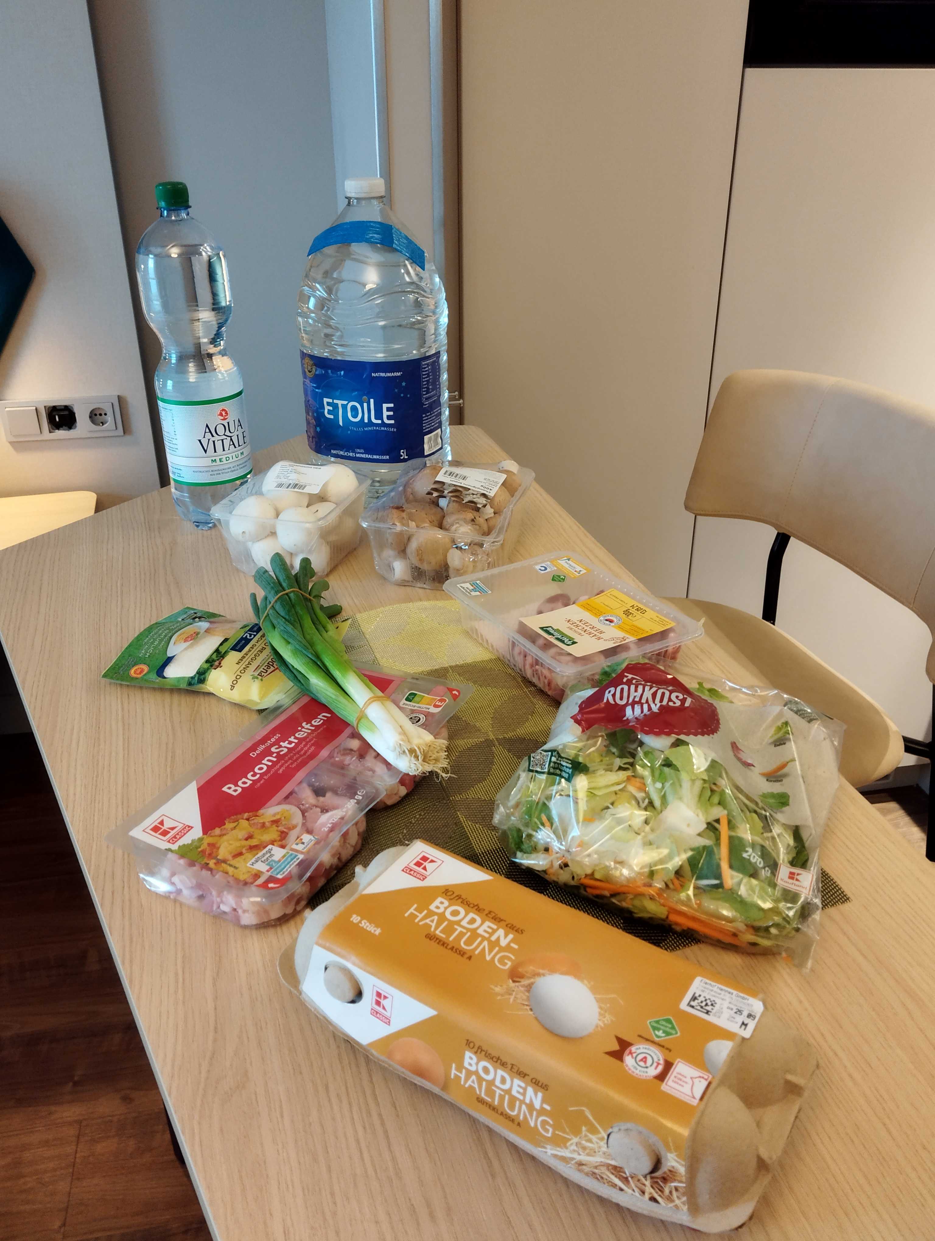 ホテルから徒歩約9分ほどのところにある「Kaufland」というスーパーへ買い出しへ。チェックイン時のトラブルで3時間ほど無駄にしてしまったので、この買い出しをするのがやっとの気力だった。とはいえ、スーパー内に入るとテンションはアップして楽しく過ごせた。ミュンヘン、アウクスブルク、シュトゥットガルトと移動してきたが一番種類が多くて他よりかなりお買い得価格の商品が多いスーパーな印象。陳列が箱ごとど~んと置いてあったり、中には自力で箱を開封して商品を引っ張り出さなければならなかったり新鮮な体験だった。スーパーの入口付近に怪しげな人がうろうろしていたり、金くれさんがいたりで写真を撮れる雰囲気では無かったのが残念。観葉植物や園芸商品まであったのにビックリ。ところどころに商品が入っていた箱やケースが転がっていたりちょっと散らかっていた。乾麺タイプのパスタがかなりお買い得価格で並んでいる。日本でも見かけるメーカーの物もあったがこちらのほうがかなりお得価格!グルテンフリーのパスタもロングパスタとショートパスタそれぞれかなりの種類があってどれもこれも欲しくなる…パン用、パスタ用、ピザ用等々小麦の種類もたくさんあって使い分けしやすいようになっている。カップのパスタ、焼きそば、ラーメンがずらりと並んでいる。ビーガン系も勿論あった。味は似て非なるものだが出前一丁さんのインスタントラーメンも置いてあった。カップの麺類はフォークでひと巻きできるくらいの長さで些かすすりにくい。炭酸系のあま~いジュースの品揃えもかなりのもの!自分で勝手にビニールを破って必要な本数を買うというちょっとワイルドなシステム。ソーセージコーナーが過去1広かった気がする。瓶詰めソーセージ、真空パック等々!これが持って帰れたら最高のお土産になるのに…魚介類はどこのスーパーでもお高め。魚介類コーナーはそこまで多くないがお肉コーナーは広くて広くて選ぶのに悩むくらい。ソーセージやハムといった加工食品は見ているだけで楽しいかなりの種類。日本で見かけたことのないようなものもあって面白い。生肉は牛さん、豚さん、鳥さん系、うさぎさん等々あり。写真に撮るのを躊躇う「まんま」のものもあってビックリさせられた。量り売りが無かったのでなるべく少量パックを選んで購入。牛乳やヨーグルトが常温で置かれているのを始めてみたときは衝撃だったな…小パックがないのも見慣れてきた^^;