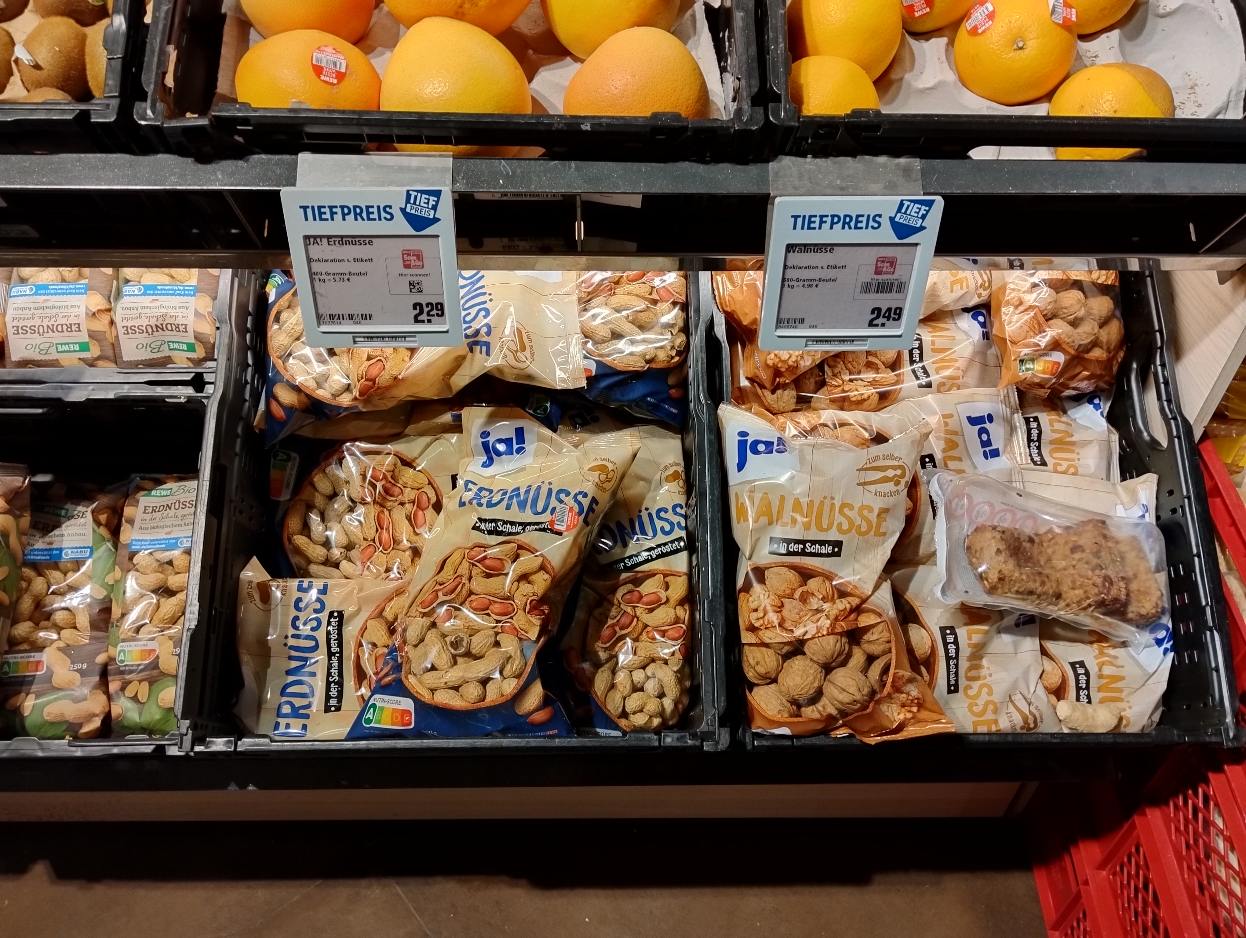 2024年のドイツ旅行中に行ったスーパーの中でもトップクラスに品揃えの多いスーパーで写真撮りまくっていました。写真は撮っていたもののメモは殆ど撮っておらず。ピーナッツや殻付きくるみが日本で買うよりお得だったので買って帰りたかった…我が家でお留守番してくれていたインコちゃんたち用に。ドイツ系パンだけでなく食パンもたくさんあった!5枚入りや6枚入りはなくて業務用並みの枚数入ばかりでしたが^^;サンドイッチを作るのに便利そうな厚さのものが多かった。食べ切れそうにない量が殆ど。菓子パン系もそこそこ有り。ビーガン系やグルテンフリー系もかなりあった。コーヒーの種類が凄まじかった。豆のままからエスプレッソマシン用の粉までズラリ!デカフェもしっかりならんでいてカフェインレス生活をしている人も安心です。ドリップタイプがあまり見かけないのでそこは注意。想像以上に「米🍚」系食品があって次からはお米が恋しくなったらスーパーで買って食べるのもありかも。電子レンジで調理できるものもあった。ただ、気をつけないと行けないのはジャスミンフレーバー等フレーバー付きの商品が多かったこと。後全体的にパサッとしていて日本のような米の食感をイメージしているとがっかりするのでそこも注意が必要。シリアル類の多いこと多いこと!朝食の定番なのかな?ビーガン系、グルテンフリー系、砂糖不使用系等々。選択肢が多すぎるが見ていて楽しい!小さいサイズが無くて業務用かと思うようなビッグサイズばかりなので「ちょっとお試し」ができない💦店だしされず放置状態の商品が通路にド━(゚Д゚)━ン!!パテ類やパンに塗るムース状のソースと言うかジャムと言うか、日本では見かけないような瓶詰め商品もたくさんあった。アジア系食品コーナーで見かけたインスタントラーメン。ドイツで購入して食べたインスタントラーメン類は全体的にあっさりしすぎてちょっと物足りない…これはこれで美味しいのかもしれないけれど、「ラーメン」を想像して食べると…(´ε`;)ウーン…お味はコンソメスープに弾力の弱い麺が入っている感じ(個人的乾燥ですが)。