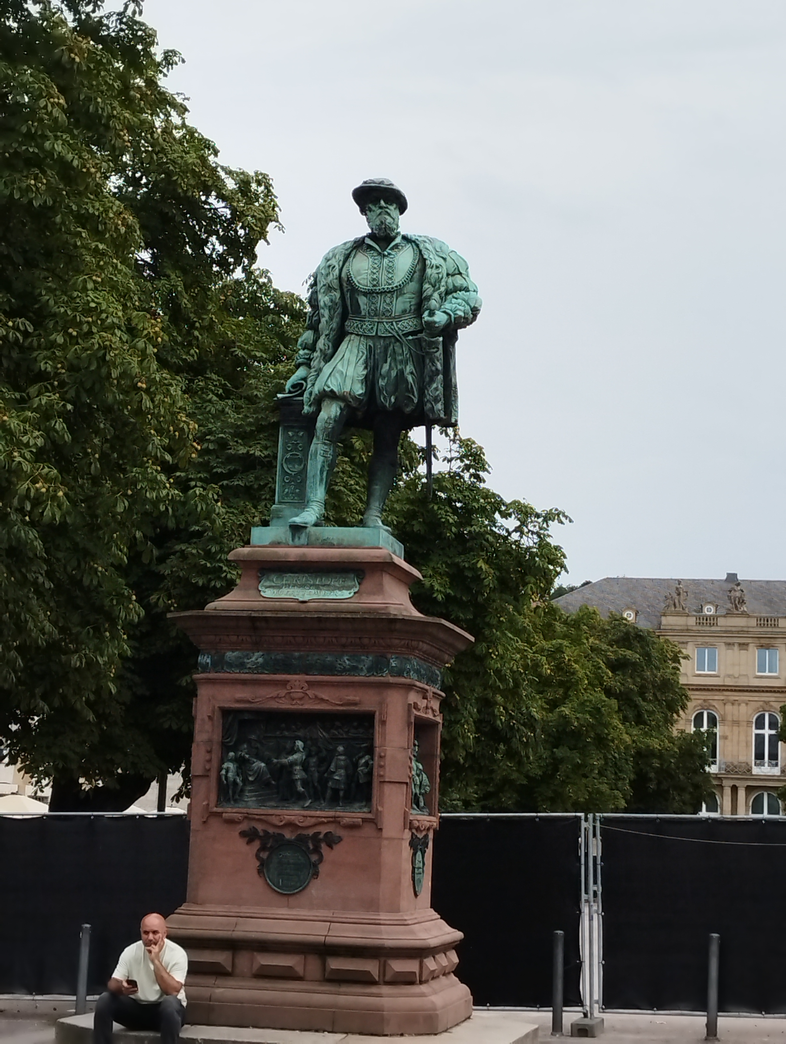 シュトゥットガルト二日目の朝。早朝から起きて荷物整理をしてシュトゥットガルトの市場を目指す。途中、シラー広場に設置準備中のオクトーバーフェスト関連の屋台を軽く見学。広場の直ぐ向かいにあるヴュルテンベルク歴史博物館がある元・お城も見学。流石に7:00過ぎという時間に博物館が開いているわけでは無いので中庭のような場所を見学です。ヴュルテンベルク公の銅像が設置されていてかなりの迫力。写真で見て想像していたよりずっと大きい…古城を歴史博物館にしたらしく中庭から見られるお城も素敵…時間があればこの博物館を見てみたかったが、月曜日はお休みだったので中庭のみ。この博物館を前日9月8日日曜日に見学して、メルセデス・ベンツ博物館を月曜日に見学しようと思っていたので内部見学できずちょっと残念。またドイツ・シュトゥットガルトに来たときにはこの博物館へ来るぞ!市場が開くまでここにいようと思っていたが、広場の端のほうで目つきが虚ろで何やら叫びまくっているおじさんがいたので退散。大通りに出てお城全体を見学したり庭園を遠目に見学。それでもまだ時間があるので市場周辺をウロウロ。市場開場10分くらい前になったので市場を目指します。7:00過ぎという時間帯でしたが街は既に動き始めていて道路は車やトラックが走り、ホテルを出た頃はまだ少なかった人出も徐々に増えてきていました。