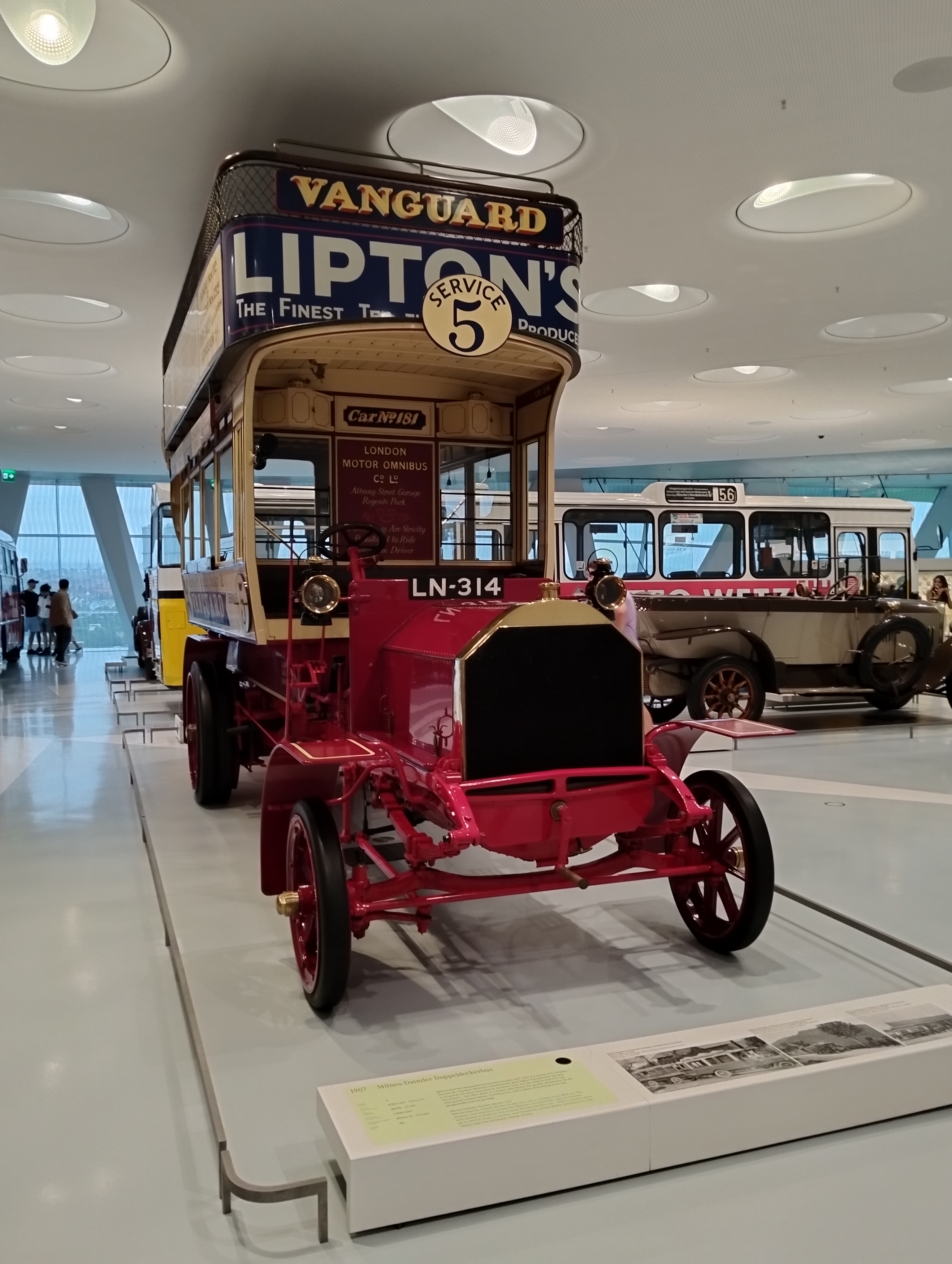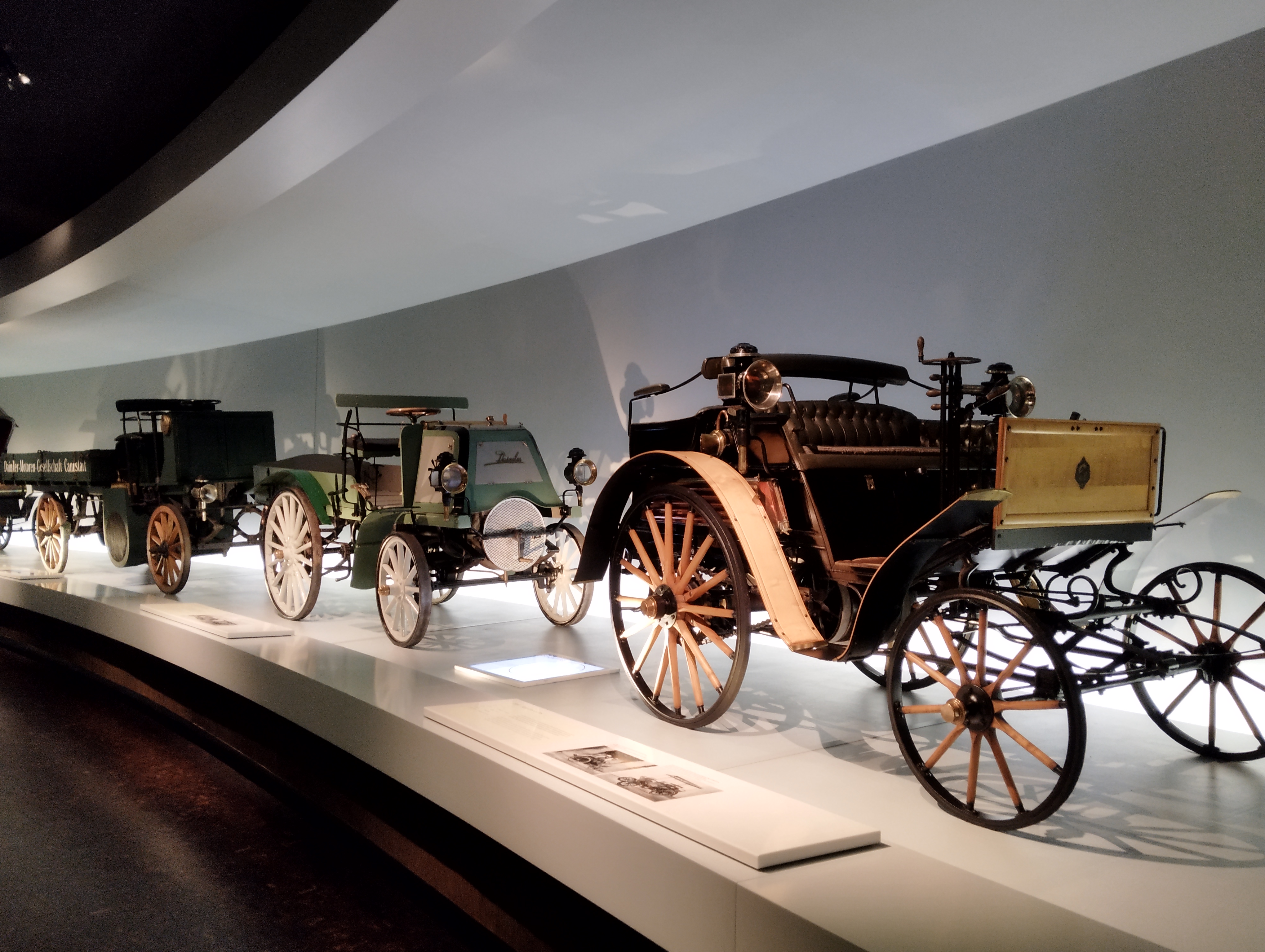 無料エリアやショップを足早に見学して、チケットが必要な有料エリアに向かった。空港のようなゲートを抜けてエレベーターでエリアに向かうことに。このエレベーターもメルセデス・ベンツ製。中はキラキラ光って華やかだった。満員電車状態だったので写真は撮れず。降りて直ぐに目に入ってきた白馬さん。何故に馬さんが?と思ったがメルセデス・ベンツも最初は馬車からスタートしたかららしい。間近で見たら剥製だったので、この白馬さんがメルセデス・ベンツ製馬車を最初に引いたコだったのかも…博物館の最上階までエレベーターで上がり、年代順に建物を降って行くのが見学ルートのようだ。始まりは1886年。当時の車体が展示されている。ちなみにこちら、ゆっくり回転していて全体を見やすくなっていて面白い。乗れそうだが駄目らしい。触れようとしている人が係員に注意されていた。ベンツが船まで作っていたのを初めて知った映画に出てきそうな車等がズラリ!年代順に並んでいるので見ているだけで楽しい!ジブリ作品で見たような車体。ワンちゃんが擬人化したホームズ作品にも出てきそう!乗っても良い車体があれば良かったなーと思ったり。