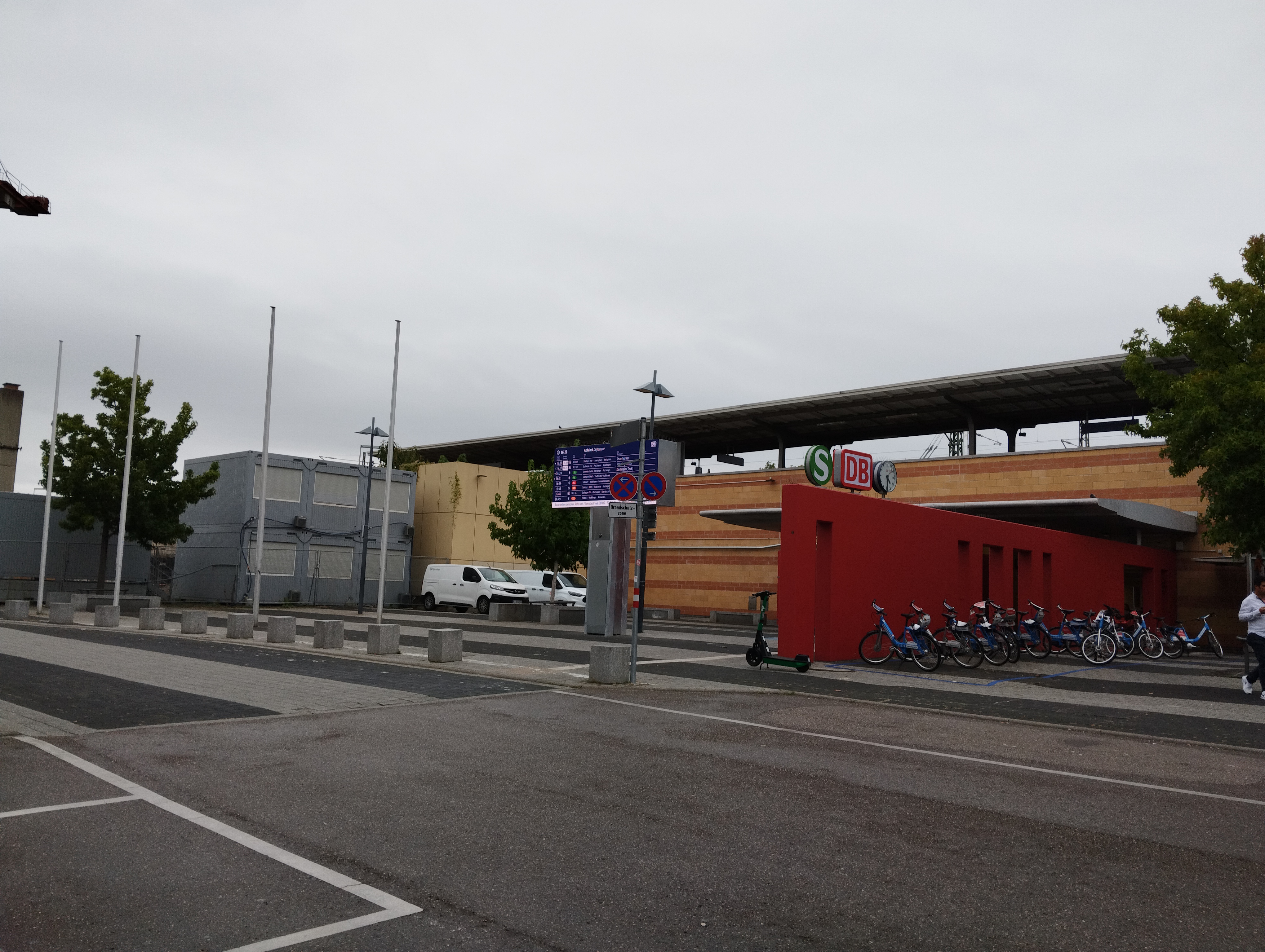 アウクスブルクからシュトゥットガルトへの移動はドイツ鉄道、DBを利用。途中停車した駅もドイツらしい雰囲気満点。駅を通過すると途端に畑や森。途中幾つか街を通り過ぎていく。トウモロコシ畑や牧場もかなり見かけた。どことなく北海道を思い出す風景だった。DBが停車する駅とその周辺はそこそこ大きな街が多い。そして駅から見える範囲に大きな教会があるのも印象的。ドイツでは電車に自転車をそのまま乗せられるので便利そう。自転車を置けそうなスペースも用意されているので利用者も安心。経由したのはおそらく「ウルム」という駅だったかと。利用したDBの座席。進行方向と逆に予約してしまったので酔わないようにかなり体勢に気を使った。確実に座るために指定車を利用したので通路に立つ人もおらず、車内移動が楽だったのとスーツケースを置くのが比較的楽だった。まもなくシュトゥットガルト中央駅に到着…というときにスーツケースを荷物棚に固定していた防犯ロックが外れずかなり焦った危うく降りそこねるところだったが何とか間に合ってよかった…車内の床は絨毯のようなタイプだったが、コーヒーか何かのシミが掃除されずそのまんま。