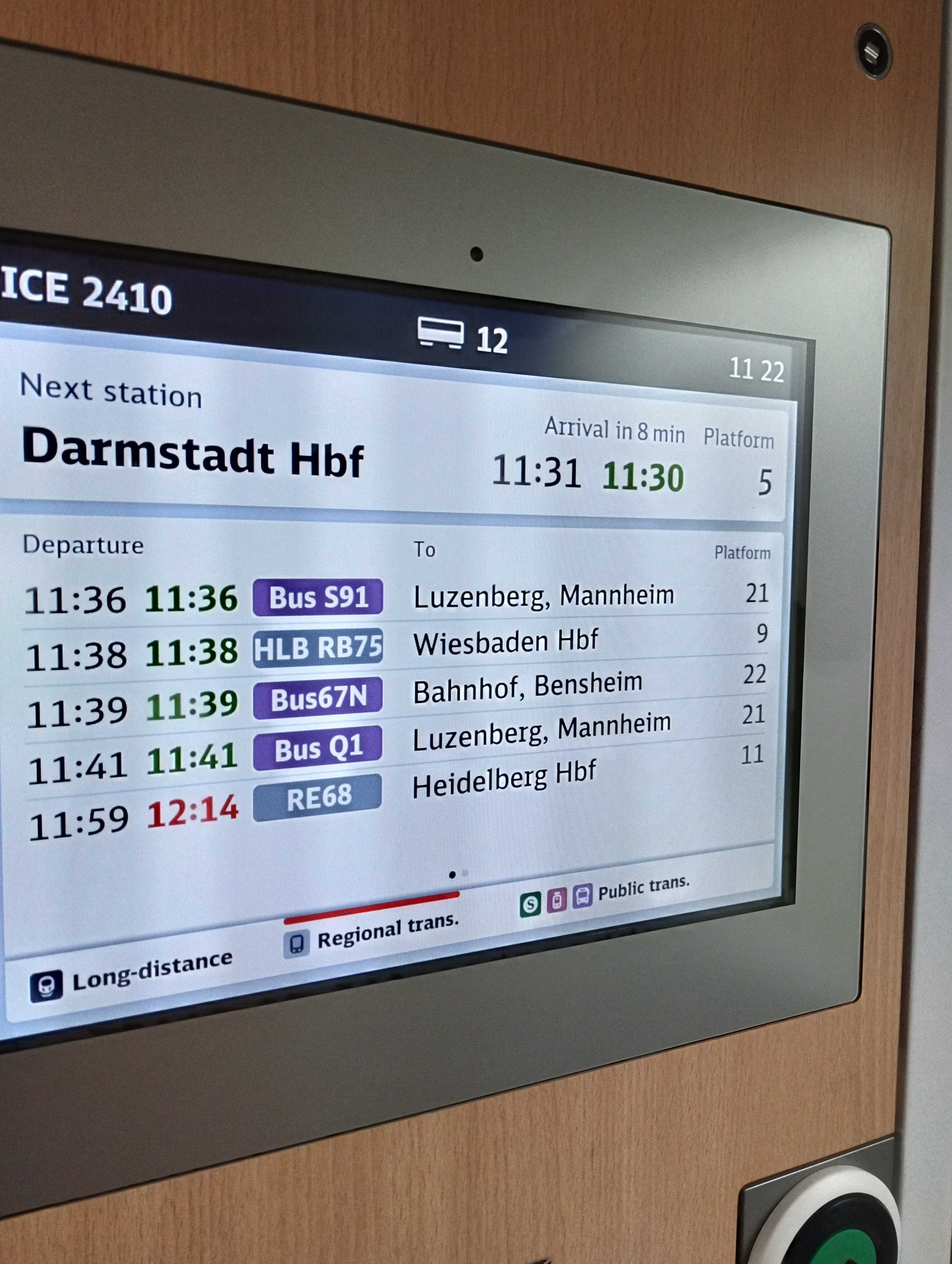 2024年9月11日(水)この日は10:46発「ICE2410」にてハイデルベルクからケルンへの移動日。5時には起床。朝食を用意しつつスーツケースの整理を行う。洗濯物が完全には乾いていなかったので困ったが、ビチャビチャではないので袋に入れてスーツケースへ。思ったより時間がかかって整理が完了したのは7:58頃。朝のお出かけも考えたが、ホテル周辺にはお店もないしあったとしても流石にまだ開いていないので止めておいた。家族とライン電話をしたりして過ごして10:00くらいにはホテルをチェックアウト。チェックイン時のトラブルスタッフがいなくてホッとした。ホテルから徒歩1,2分の中央駅へ。この日も切符売り場には行列が。事前に買っておいて本当に良かった…電光掲示板でなくて紙媒体で時刻とホームをチェック。10:15くらいには電車到着予定の3番ホームへ。乗車するのは12号車。移動しておきたいが、万が一出発ホームが変わっては困るので移動しやすい辺りで待機することに。ホーム内に売店はなかったが自販機はあった。カード払い対応機種だった。まさかのJCBカードまで使用可の機種でちょっとビックリ。現金は硬貨のみ使用可だそうだ。ホームから利用した駅前アパートホテルが見えた。ホテルの部屋から見えたのだから当然か…利用した部屋を眺めつつパチリ📷️万が一を考えて早めにホームへ着いていたので時間に余裕がある。残っていたパン(前日のカリーブルストについていたもの)を鳩さんへお裾分けしたりして電車の待ち時間を過ごすことに。