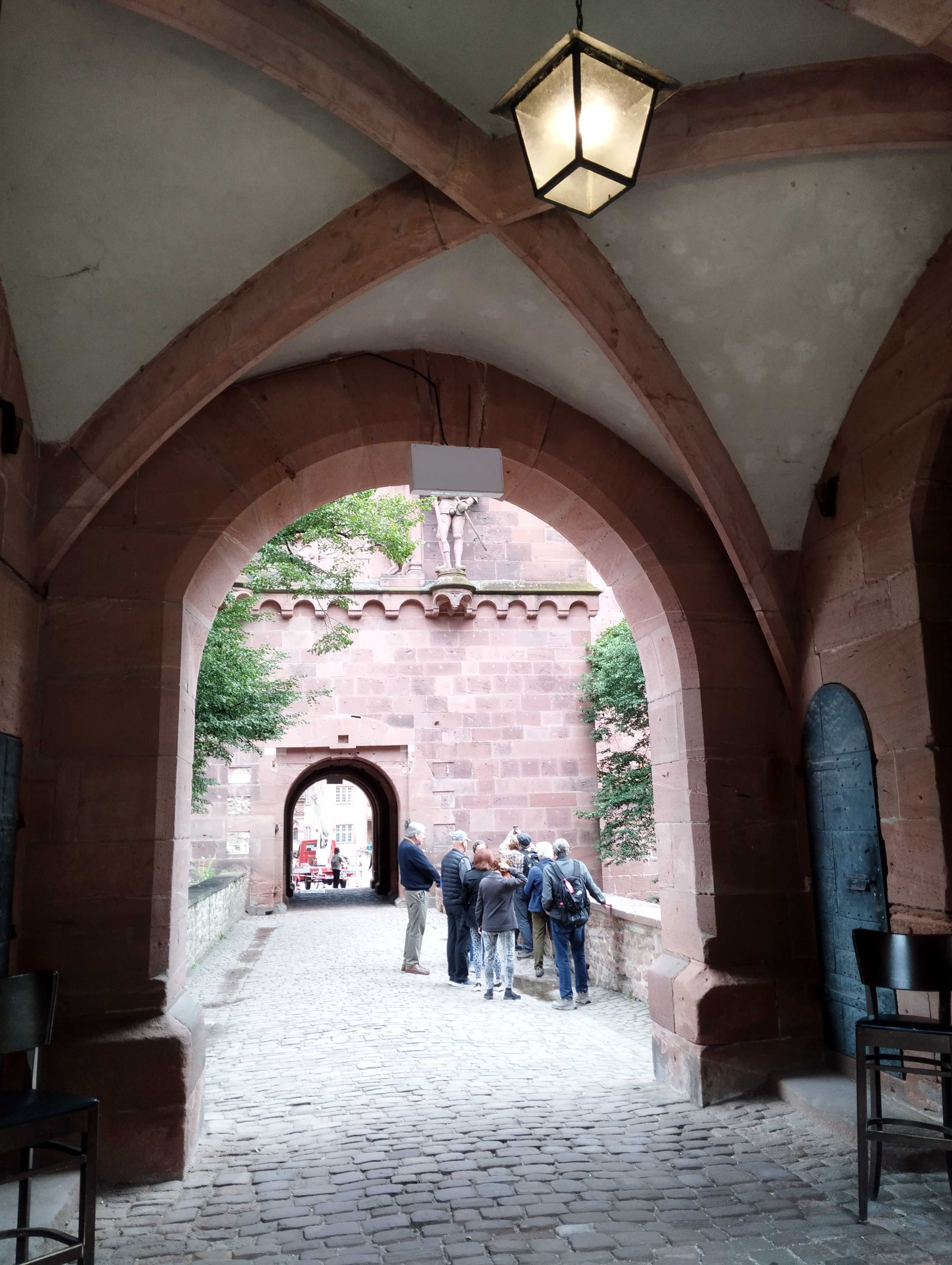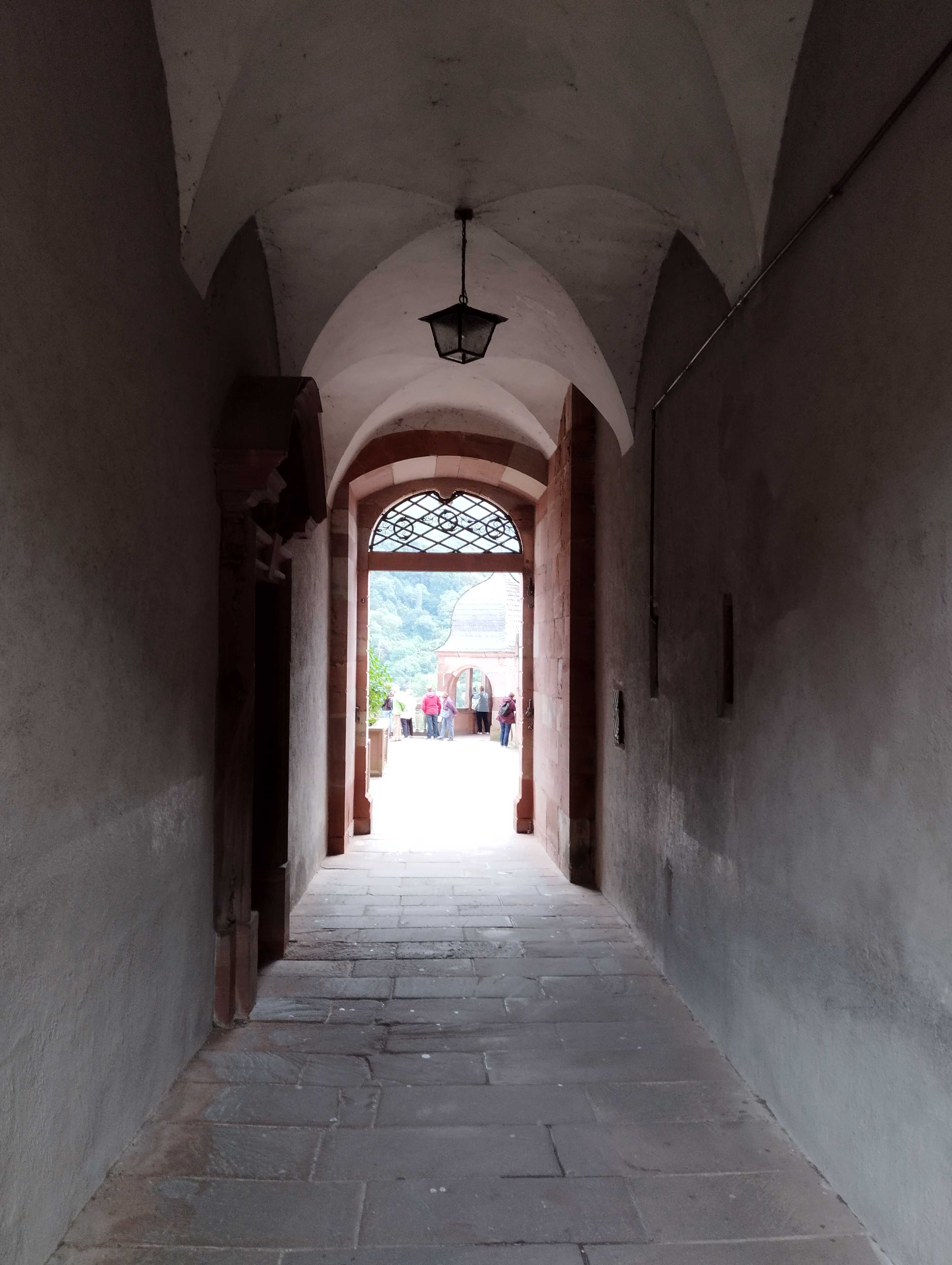 ハイデルベルグ城の無料エリアを見学後、有料エリアに向かう。この入口手前で係員さんによりチケットチェックが行われた。あのレシートのようなチケットがここで登場。QRコードを読み取ってチェック完了。有料エリアまでの橋からは深いお堀を見ることができる。修復工事中で工事用品がお堀にいっぱいおいてあってちょっと雰囲気にかけたのが残念。橋より出入り口付近をパチリ先程までの人手が嘘のようにがらんどう…入り口手前に塔があった。ジブリ映画やRPGの世界観を思い出す雰囲気。最近ハマっているゲームのアトリエシリーズを思い出すな~…入って左手にディッカー塔がチラ見え。ここだけ見ていたらいつの時代かわからなくなる雰囲気だ。歩いて直ぐにお城の中庭が見えてきた!この写真の右手に昔使われていたらしい井戸があった。編みで蓋がしてあって何故か小銭がその上に沢山投げ込まれている。お城を正面にしたこの画面右手にドイツ料理をだす高級レストランがある。テラス席もあって雰囲気はとても良い、が、高級すぎて手が出せない(;´∀`)一人でドリンクやサービス料込みで100€前後はちょっと……この通路を向けるとハイデルベルグの街を見渡せる広いテラスがある。この時、団体さんがいくつも重なり非常に大変賑やかだったのでこちらの観光はあとに回すことに。ここを入る前に左に進むと階段があり、その先に「大樽棟」があるのでそちらを先に見学することにした。入って直ぐの内部様子。ハイデルベルグ城内にあったレストラン。メニューはドイツ語と英語表記。レストランと言うか、バーのような印象だった。ワインやお酒とおつまみを楽しむのがメインかな?この時には団体さんがいて賑やかだったが、一般の人はおらず団体さんの貸切状態だった。扉一つ一つに良い意味の古さがあって見ていてワクワクする。見かけた扉は少し小さい感じのものが多かった。店内の隅っこに酒樽があった。これがガイドブックによく乗っている大樽かと思ったら違った。見ようと思っていた大樽では無かったが、これはこれで立派な樽。ちょっと年季も入っていそうな感じ。