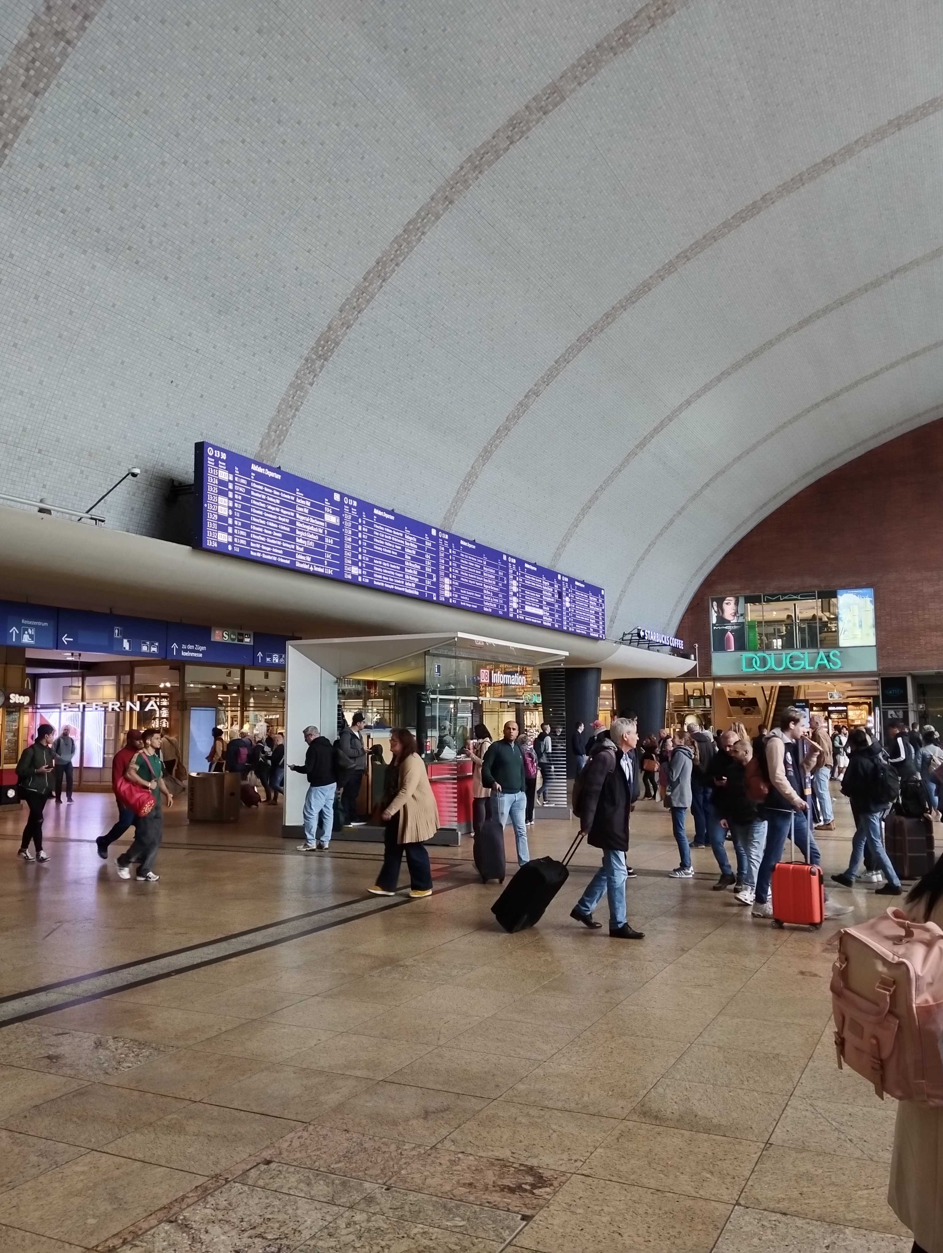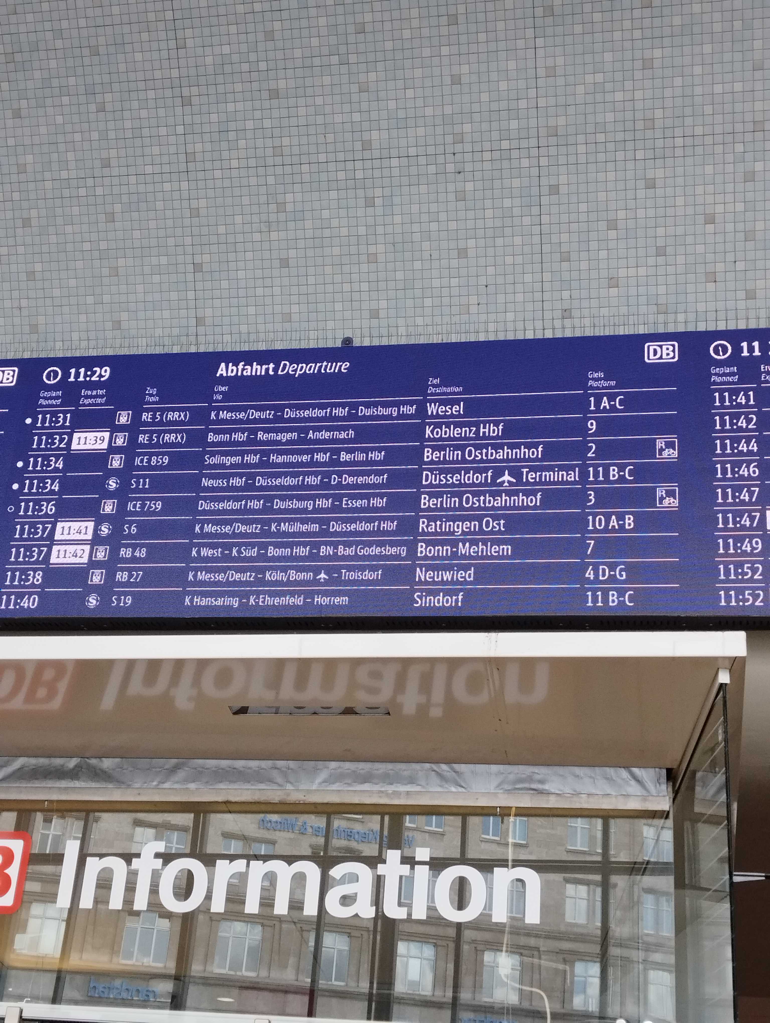 それほど遅れることもなくハイデルベルク中央駅からICE2410に無事乗車。またまたまた進行方向と逆という…^^;スーツケースを棚にしまったりしていたら10:50頃には既に動き始めていた。確実に座れるのと、静かな環境を求めて1等車へ。利用者が多いのか荷物棚も座席もほぼ埋まっている。盛大な落書きをそのままにした車両が普通に走っている。11:32頃ダルムシュタット中央駅へ。11:35には出発した。他の駅より停車時間が短くてやや慌ただしい雰囲気だった。またまたまた進行方向と逆の席だが快適なシートだ。「フランクフルト・アム・マイン」空港の最寄り駅。人が一気に降りていったがホームは混んでいない。皆さん足早に空港の方へ向かっているようだ。ハイデルベルクを出発して約2時間でこの辺り。順調に…とか思っていたら徐々に到着時刻が遅れ気味に💦何もないところで突然停止して暫く動かなくなったときにはやや焦る…ケルン中央駅まであと少し。このあたりまで来るとやや落書きが目立つ。「ホーエンツォレルン橋」を通過していく。愛を表現する南京錠が大量につけられていることで有名らしい。車内からでもその南京錠がよく見えた。10~15分遅れの13:19頃にケルン中央駅へ到着した。ここまで停まったり動き出したりを繰り返していたがこれくらいの遅れですんで良かった良かった1等車はホームの端っこに停車する羽目になり、改札までかなり歩く羽目になったのが予想外だった。