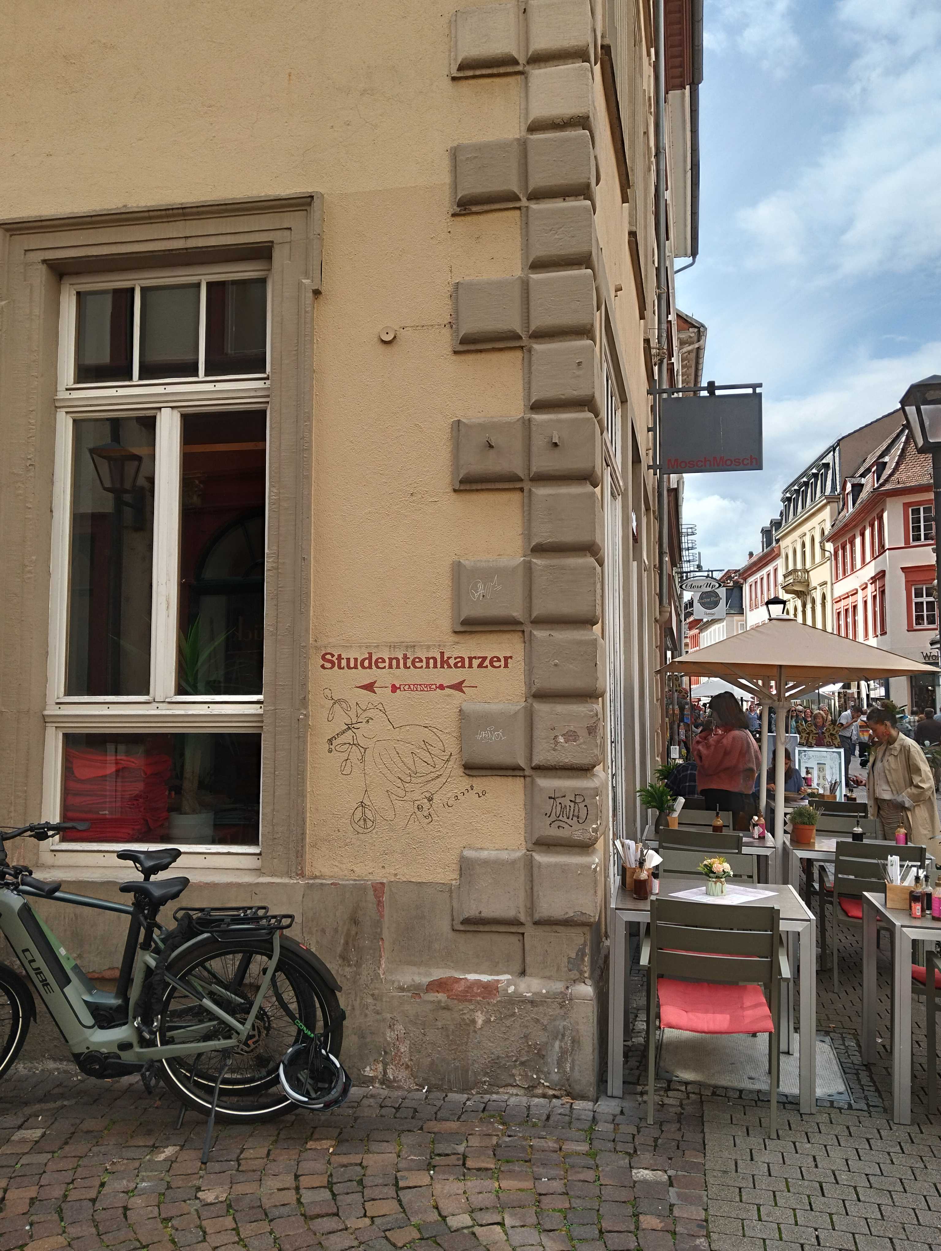 ハイデルベルク旧市街の「ハウプト通り」を進み、「アウグスティーナーガッセ通り」に入るとハイデルベルク大学が見えてくる。午後の部再開とほぼ同時に中へ。建物の壁にあるこの文字が目印。少し進むと大学の博物館入口があります。外観はこんな感じ。見落とししそうなので注意。こちらで荷物を全て預けるように言われた。スマホとメモ帳だけ持って観光ゾーンへ。小さなカバンも駄目なので持ち物に注意だ。因みにこのコインロッカーは確か2€だったかな?コインのみで使用後お金が返ってくるので忘れないように注意!中庭を通って「学生牢」へ向かう。入って直ぐ壁にでかでかと文字が書かれていた。この「学生牢」はハイデルベルク大学で1778から1914年まで利用されていたそう。問題を起こした学生を閉じ込めていたそう。閉じ込められた学生たちがそこら中に落書きをしていたのが観光資源になっているのが面白い。いついつ閉じ込められた~と日付と名前までしっかり書かれている。この牢に閉じ込められるのが一種のステータスになっていたそうで、入るためにわざと問題を起こしていた学生もいたのだとか。階段にまで落書きが…階段がすり減って変形している。ギシギシ凄い音がした。「牢」なのにおしゃれなストーブだ…ベッドはボロボロ。日当たりはあまり良くない。ライトが無ければ真っ暗だ。1778年当時は照明がろうそくとかだっただろうからもっと暗かったんじゃないかな。※当時と建物が違うかもしれないからあくまで私の想像ですこれが……トイレ!?扉がなくてビックリだった。落書きがなければ良さげな部屋もあった。そこそこ日当たりも良い。当時の学生さんたちの写真まで飾られていた。学生さんたちもまさか観光客に見物されるとは思っても見なかっただろうな。この人の顔は落書きした本人さんの似顔絵だそうだ。この鉄の扉から「牢」とそれ以外に別れているようだ。「学生牢」内部は懲罰的要素があるので薄暗くて換気もいまいちなのは当然かもしれない。もし自分が当時の学生だったとしても入りたいとは思わないな~見ているだけなら楽しいけれど、数週間ここから出られないのはキツそうだ。