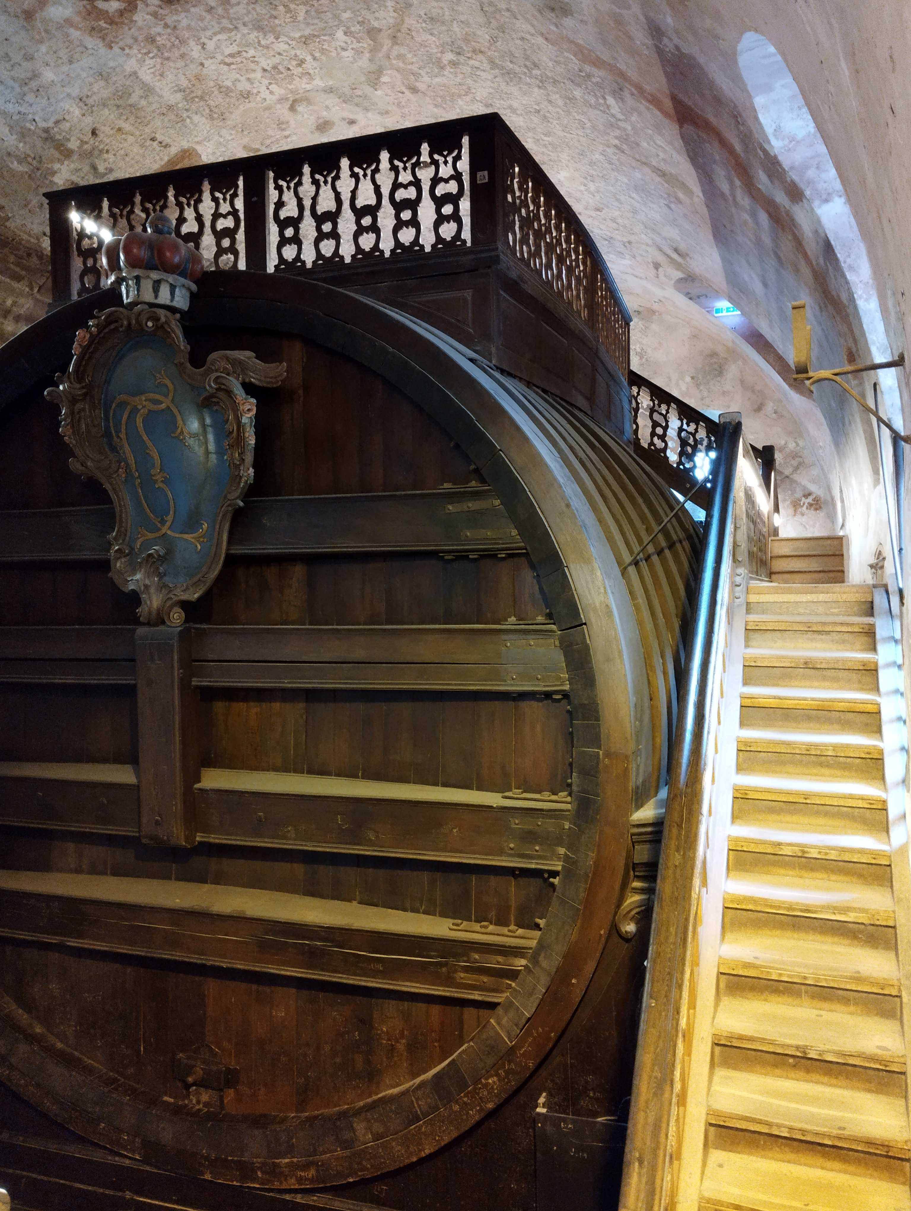 ハイデルベルグ場内にある「大樽棟」旅行記やガイドブックで見かけて行けたらいいなーと思っていたところです。なんと奇跡的なことに殆ど人がいません。じっくり見学できて写真も撮りまくりです。世界最大のワイン樽で22万リットルも入るらしい。伝説の酒豪、ペルケオ氏の像が設置されていた。埃は積み上がったまんま。布で磨くだけでツヤツヤになりそう…貴重な歴史的建造物に何たる仕打ち…油性ペンで書かれたものだけでなく、傷をつけてらきがきだなんて寂しいな大樽の上に上がれる階段も有り。勿論登ります。見下ろした大樽。22万リットルも入るだけあってかなりデカイな。まさかこれだけ誰もいない写真を撮れるとは!思ったより広い大樽の上のテラス(的なところ)築200年以上の母方の実家の天井や梁を思い出す色合いの大樽やその周辺。経年によるこの木材の色が個人的に大好きです。大樽の左からの眺め。大きすぎて全体をカメラに収めるのは無理そうだ。それにしても巨大なワイン樽…ワイン樽から降りる階段まで木製、更になんだか楽しい螺旋階段風。修復されたところなのか明るい色合いだ。ペルケオ氏の像が大樽を見守っている。昔はお水を飲むよりビールやワインといったアルコール飲料のほうが安全と言われていたらしい。そんな時代でも酒豪と言われていたから余程飲みまくっていたんだろうな…とか思ったり。これ以上下がって写真を撮ろうとすると壁にぶつかるのでこれが限界。この後写真を撮らずにもう一周して大樽をじっくり見学した。その見学を終えかけたところにゾロゾロ団体さんのご登場!途端に室内は賑やかになったのだった。大樽のある部屋から出て直ぐの眺め。ワインを堪能していた団体さんがいなくなっていた。大樽の部屋に入ってきた団体さんはこの団体さんだったのかも。営業していないみたい。予約必要なのかな?こちらがハイデルベルグ城中庭と大樽棟を結ぶ通路。一応木製の扉はついているようだ。