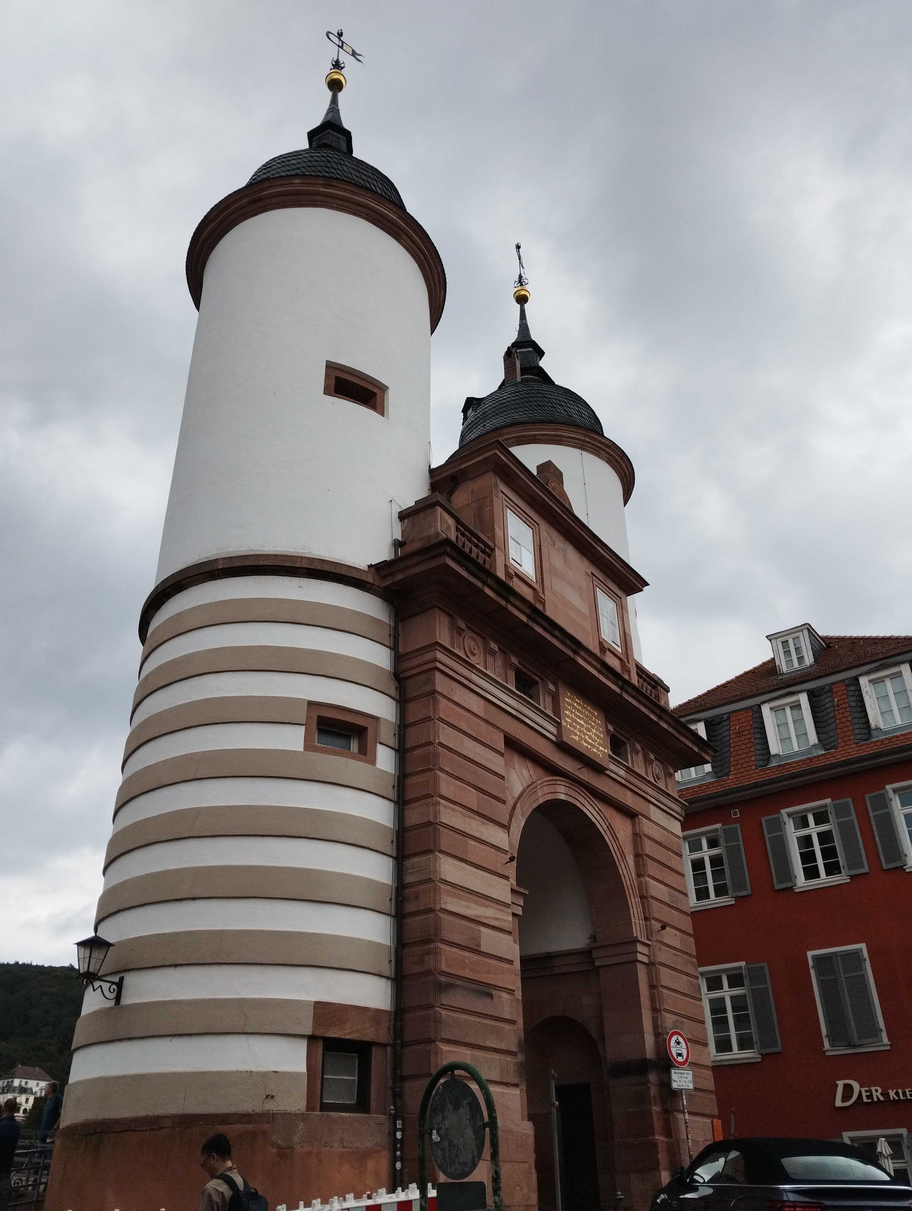 ハイデルベルグ城の大樽棟を見学後、お城の敷地内見学を再開。雨が降ったり止んだり困った空模様。大樽棟を出て少し進んで左手にある通路。そこを進んでいくとハイデルベルグの町並みを見渡せるテラス(的なところ)があるのでそちらへ。通路の途中にあった扉が木製でアジがあったのでパチリ入ってきた出入り口とはまた違う出入り口を横目に進む。通路を出て建物を振り返るとハイデルベルグ城の建物が目に入る。「Friedrichsbau」という史跡のようだ。最初に来たときはもっと人がいっぱいだったが少し減っていたので見学できそう。絶景が視界に入ってくる。ネッカー川と町並みが目に入ってきた!写真では解りにくいけれど、視界全体に川と町並み、空に山が入ってきて何とも言えない素晴らしい眺め!!中世からあまり変わらないであろう街並みを見ていると今時分がいつの時代にいるのか解らなくなりそうだ。テラスの隅の方にあった東屋のようなところ。見張り台かな?殆どの人がここに入って記念写真を撮っていたので少し順番待ちしてから中へ入る。この後10分くらい誰も来なくて貸切状態で見学できた。貸切状態後、またまた団体さんのご登場。そこに紛れるようにしてハイデルベルグの街並みとネッカー川を見学。何枚か写真を撮った後は只々景色を眺め続けた。これがまた何だか気持ちが良くてスッキリした気分に。聖霊教会がよく見える。「Karlsplatz」という、ハイデルベルグ城がよく見えるという広場もこちらからよく見えた。その広場からこちらに向かって手をふる人がいて、楽しくなってこちら側からも振り返す。暫く「交流」が続いた。暫くテラスでのんびりしていたら続々と団体さん、個人旅行客さんで辺りが一杯になってきた。そろそろ移動しよう。