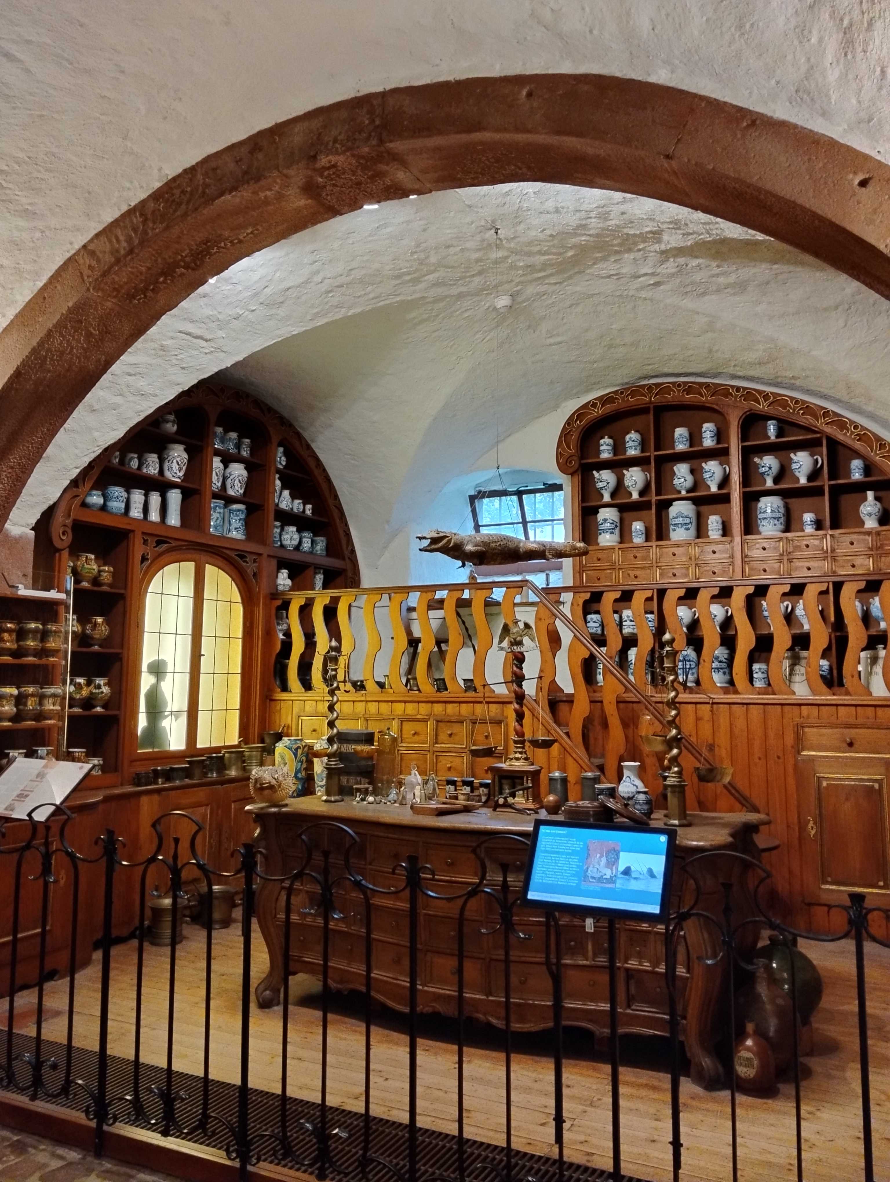 ※今まで1日最大10枚程しかダウンロード出来なかった写真が(少ない時は6枚ほどだった)、何故かここのところ30~40枚ほどアップできるようになり嬉しい次第です。楽天ブログさんありがとうございます!!2024年9月10日㈫、ハイデルベルグ城内にある「ドイツ薬学博物館」の続きです。見学に夢中で殆どメモを撮っておらず、コメント殆どありません。写真ばかりです。薬局コーナーを出て直ぐにシカさんのお出迎え。剥製なのかどうかは解らないがキラッキラのゴールド仕様だった。昔使われていた薬入れやケース、手紙等々がガラスケースにたくさん展示されていた。窓の前にも圧縮機を発見。油を抽出するために利用したのかなと思いつつパチリ📷️螺旋階段は関係者以外立入禁止でちょっと残念。薬入れがズラリ。手紙らしきものは今で言う処方箋だろうか?昔の顕微鏡。精度はどれくらいだったのだろう…ほぼ見学が終わったと思ったら地下にも見学スペースが有るようなので向かいます。人が出てきて初めて気がつくという…危うく見過ごすところだった。ガラス製や木製のフラスコらしきものが大量に展示されていた。薬用の調合器具なのに、初見で昔のかき氷の機械とコーヒーミルに見えてしまった…何故かこんなところにまでワニさんが!気が付かない人もいるのか、地下展示エリアに来る人はまばらだったのでゆっくり見られたのがありがたい。