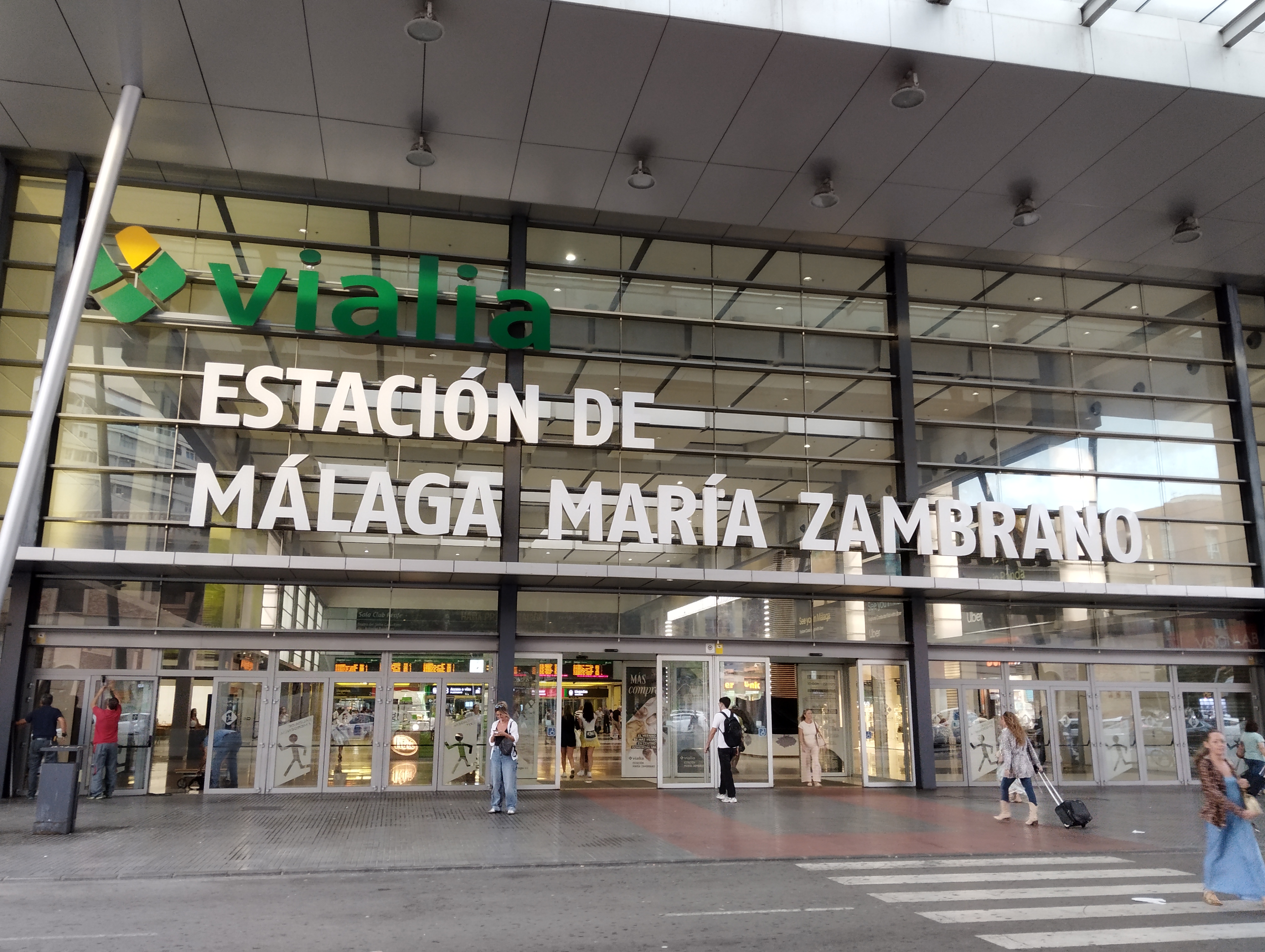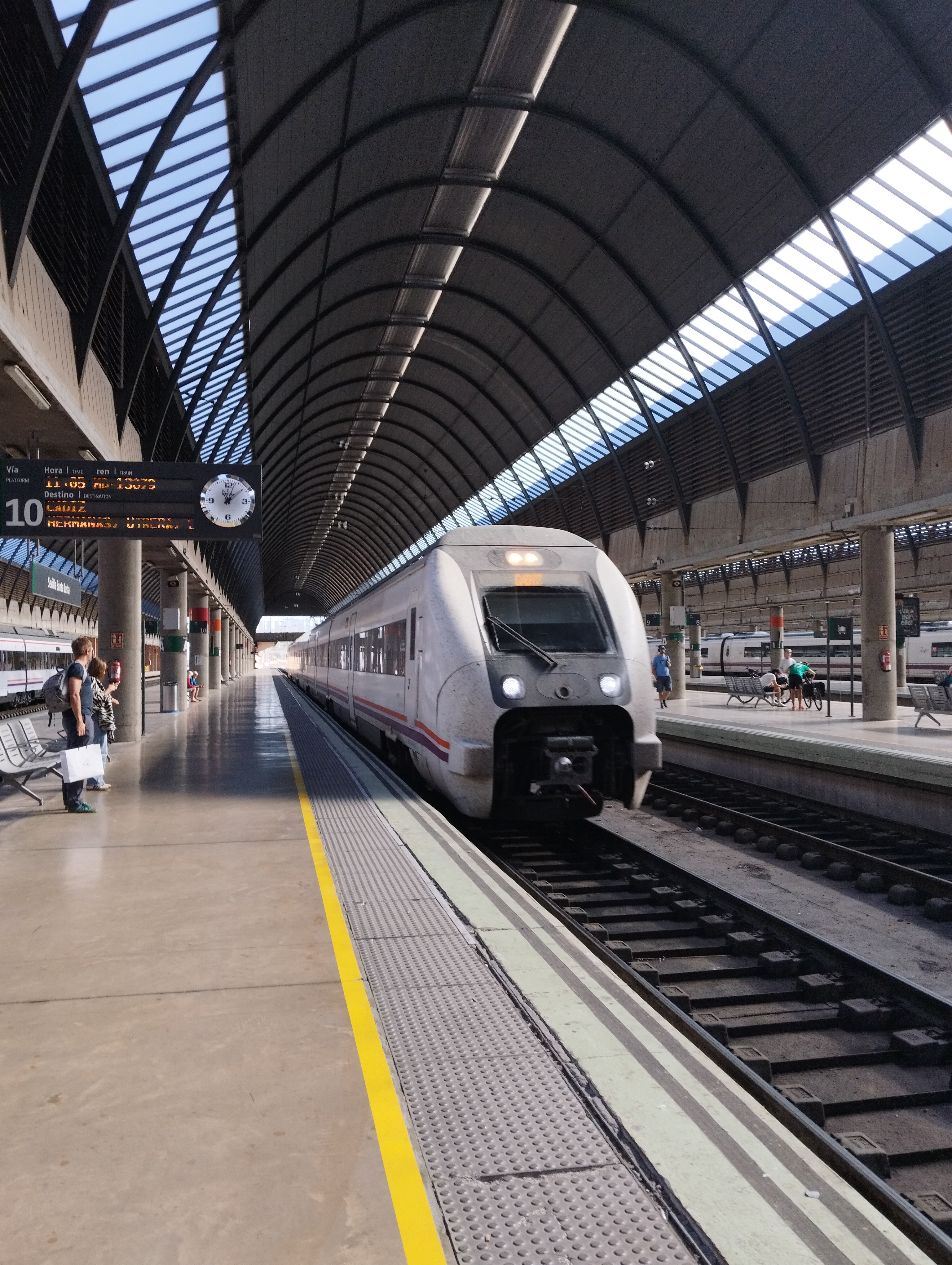 あまりにスーツケースが重いのでアパート近くから中央駅までタクシーに乗車。時間と移動の手間を考えると明らかにタクシーが楽でした。10分ほどで駅に到着。荷物の積み込み、降ろすまでしてくれたのでチップ込みで5€を渡す。チップ無しだと4.50€ほどで時短で駅に着けて荷物の移動まで楽で申し分無し!ホームへ入るのに空港のような手荷物検査がありちょっとビックリ!これだけ厳しいとよろしくない輩が入りにくいから日本でも取り入れて欲しいシステムだなー。出発ギリギリ乗車は出来なくなりそうですが。中々出発ホームが決まらないのはスペインあるあるだろうか…やっと決まったらモニター前に待機していた人たちが一斉に移動。あっという間にホーム前には行列が発生。ここでは切符のチェックがあり、ない人はこの先には進めません。マラガからグラナダまでお世話になるスペインの電車、雑巾で拭きたくなるくらい汚れていました。グラナダまでの道中、木が殆ど生えていない乾燥した大地を進んでいくのをみると車体が汚れるのも仕方がないかもと思えてきます。