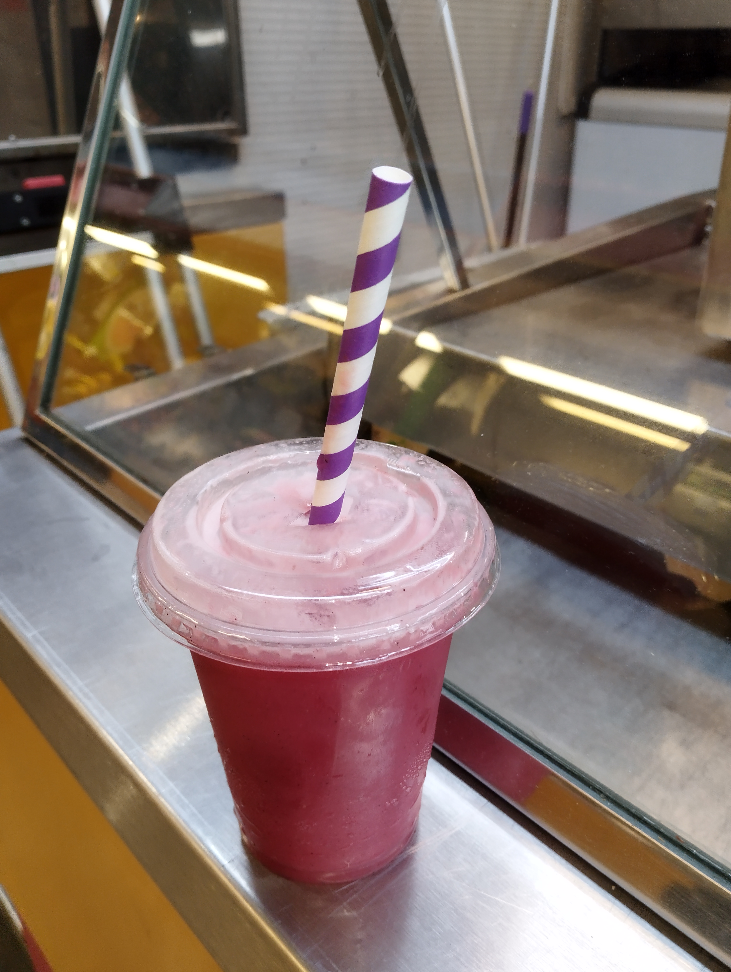 マラガの市場で買ったスムージー。実は2日連続で同じお店で買っています。ビオ製品だったのと氷でかさ増ししていないので。歩き疲れた身体に染み渡る美味しさ🥰マラガ砦の中にあった自販機で買ったお水。一本1€。この自販機が中途半端に壊れていて、買ったはいいが出てこない^^;近くにいたお兄さんが手伝ってくれたものの中々出てこないので悪戦苦闘してようやく引っ張り出すことができました!スペインの自販機でのお買い物は要注意行動です。市場で1度目に買ったスムージー。マンゴーやバナナ、ベリー系の入ったもの。このお店はどれでも3.50€なのでわかりやすい。ちょ〜っとお高いですが。