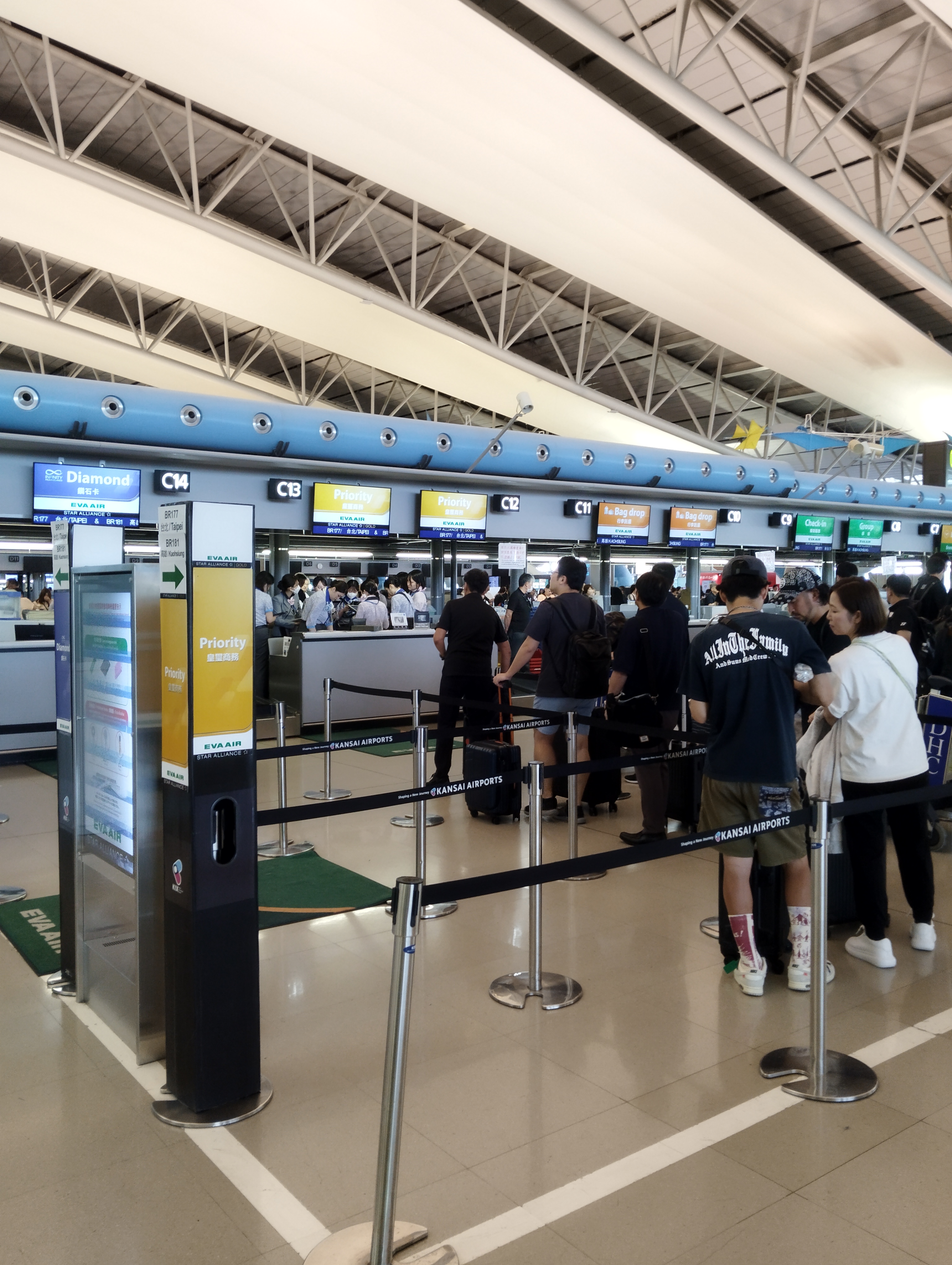 予定していた時間よりかなり早く5:30くらいに目が覚めるも流石に早すぎ(^o^;)6:00くらいまでゴロゴロして過ごす。日航ホテルさんではフロントに連絡すると空港で見かける荷物運び用のカートを部屋まで持ってきてもらえるとのこと。ホテルの廊下が絨毯なのでスーツケースの移動がしにくいので連絡をしてカートを持ってきてもらう。そこらじゅうから外国語が聞こえる。これから日本の観光を始める人、帰国する人で大変賑やか。今までカートを使うことはあまりなかったけれどスーツケース2個、リュック、機内持ち込みバッグと一度に運べるので便利だなと実感。関西国際空港から出発するのは2010年のマルタ島ツアー以来。到着便は2018年に利用したけれど当時と随分変わっている。様々な動画や旅行記で予習していたのでさほど迷わず。人のこと言えないけれど重たそうなスーツケースをゴロゴロさせている人、いくつもの段ボールをカートに積んで運ぶ人が結構いる。ワクワクしすぎて妙なテンションが続いている。とにかくアレコレとパチリ📸利用予定のエバー航空のチェックインカウンターやゲートの位置を確認。いつでも確認できるように写真に納めておく。自分で荷物タグを付けるタイプのチェックインカウンターが増えているなーという印象。チェックインカウンターの受付までまだ時間があるのに既に行列ができています。エコノミークラスは勿論、ビジネスクラスのカウンター前もそこそこの行列。8:30くらいだったかな?事前にウェブチェックインすると時間短縮できるみたいなので次回利用時は利用してみようかな?受付が始まったのは8:38くらいからで予定より2.3分早くスタートした。