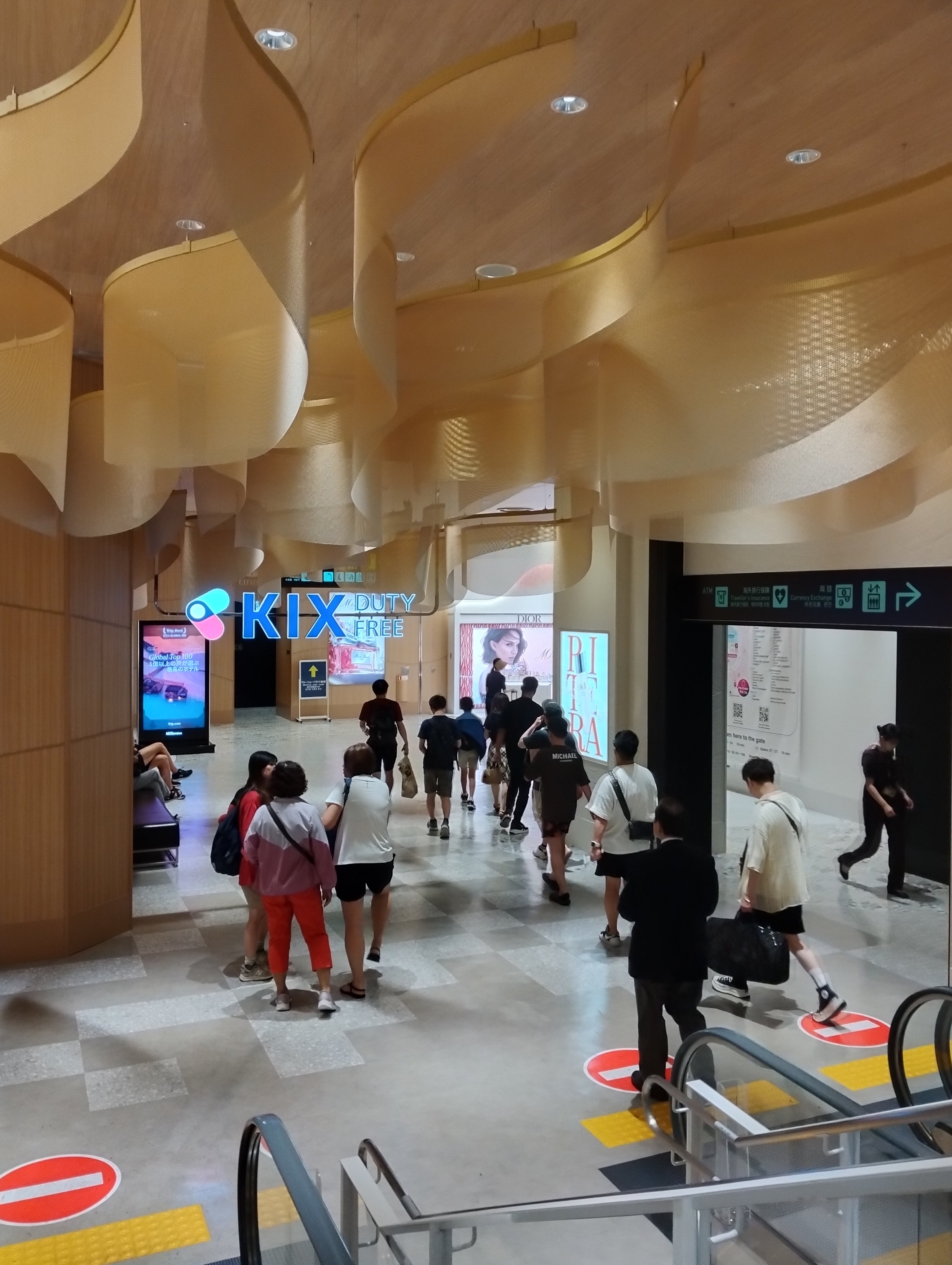 9:10頃には自動化ゲートを抜けて出国。「ゲート監視所」で出国のスタンプをもらう。9:12にはゲートの外へ。エスカレーターを降りてすぐくらいから免税品店エリアがスタート!とある動画サイトで「強制物販ゾーン」と命名されていましたが実際に来てみると確かにそうかも。言いえて妙!免税品店を通らないとゲートに行けないようになっています。ドイツのフランクフルトもこんな感じだったなー…一つ一つは良い香りですが、様々な香水やコロンやら諸々の香りが入り混じって随分と個性的な香りになっていました💦きつい香りが苦手な人は早めに通り抜けるか、マスクを二重にするかしておいたほうが良いかも。頭が痛くなりそうでした。電子タバコや普通のタバコを売っている免税品店が結構な規模。日本のたばこや外国産のたばこがズラーッ!日本国内では5800円のたばこが免税品店では3900円。1900円もお得。つまり1900円も税金がかかっているということ。乗り継ぎがなければお土産に買っていたかも。日本国内で売っているものと免税品店で売っているものはデザインが違うし取り扱いルートも違う。心からのお願い!免税品店で買ったタバコを日本国内のタバコ屋さんに「間違えて買った」とか言って返品?してお金をせしめたりしてはだめだよ!(3900円で買ったものを渡して5800円もらう、つまり1900円のもうけだーとか言って)タバコ屋さんはメーカーへ返品することも通常タバコへの交換もできないし大損するからね!※被害経験者は語る愚痴はこれくらいにして…引き続き免税品エリアをぶらつきます。レジが混雑して行列が出来ているので結局何も買わずじまい。事前に支払いをしてから別のカウンターで品物を受け取るシステムらしい。そこらじゅうから外国語の会話が聞こえてくる。高級ブランド品のお店はそこまで混雑していない。それにしても免税品店だけでなく休憩できるスペースも随分と様変わりしている。以前は出国審査の後にちょこっと免税品店がある感じでカフェやレストランはなかったような…10年以上前の話なので当然か^^;そこら中で万博の宣伝やっている。ユニクロが有ると聞いていましたが見当たらず。それでも見ごたえの有りそうなお店がたくさん。逆光で見にくいですがおしゃれなカフェがある。広々としたベンチが有るにはありますが写真のようにベッドとして利用している人をそこそこ見かけた。朝が早くて疲れているのだろうか?横になりたい気持ちはわからんでもない・・・