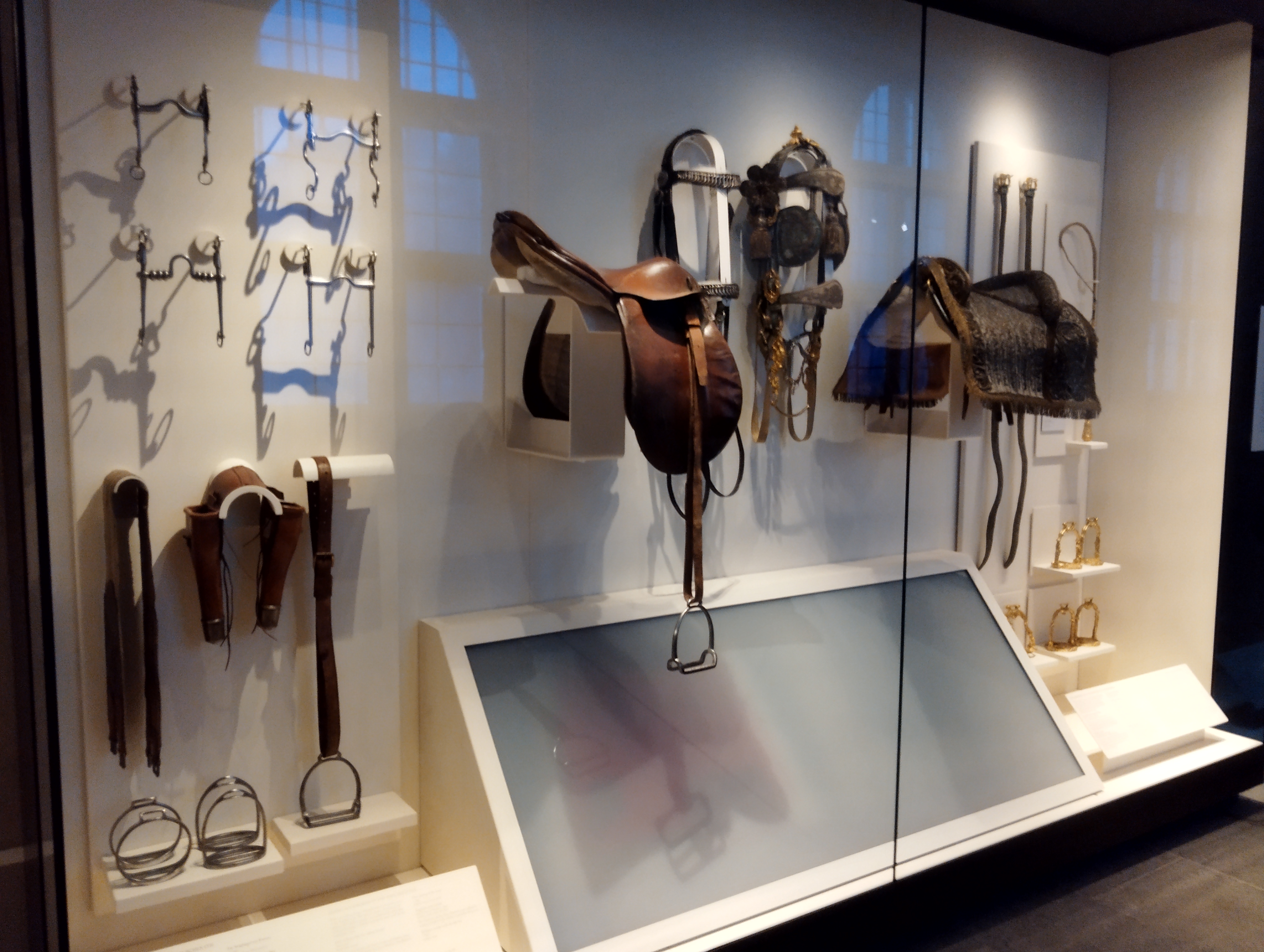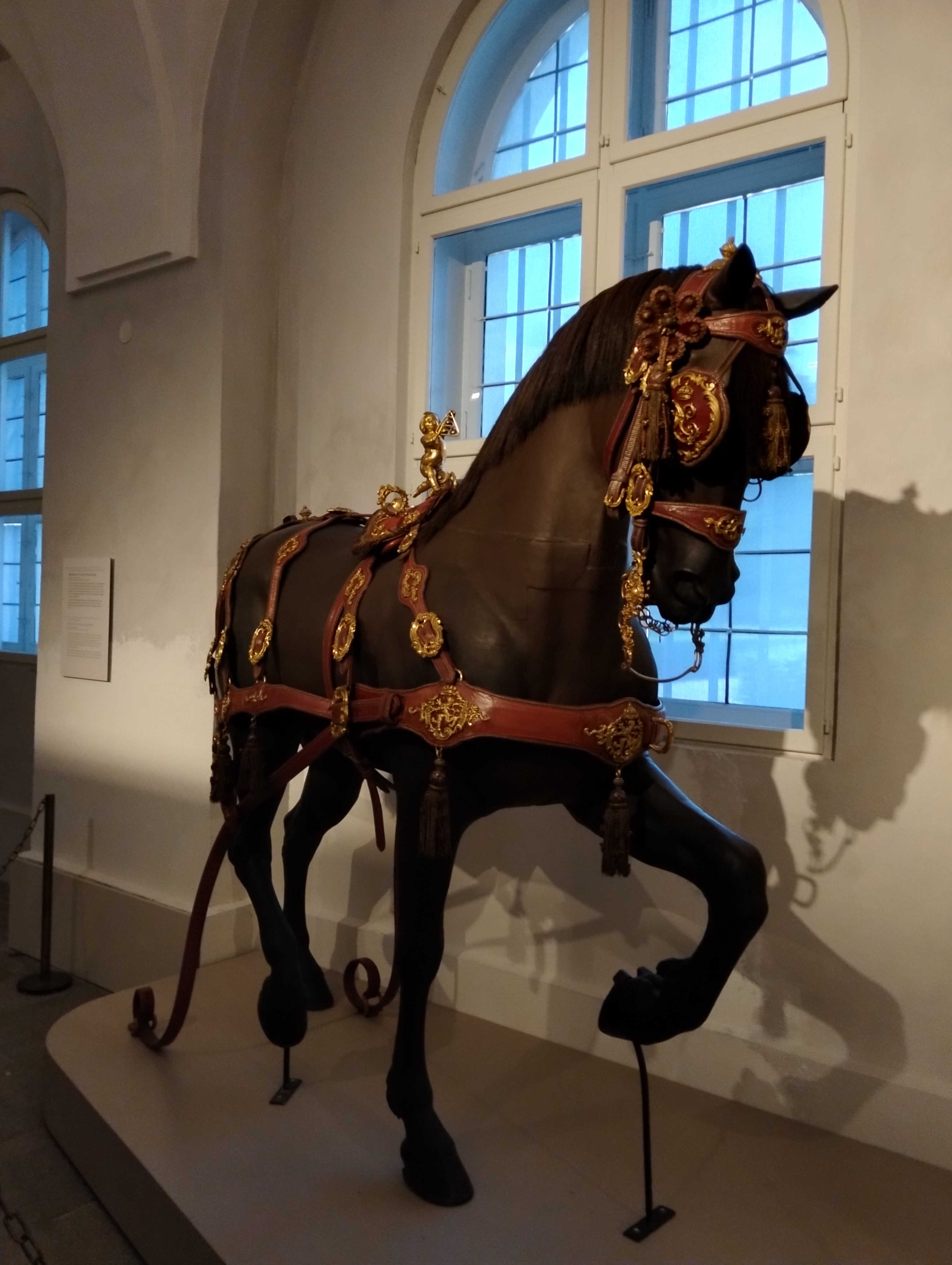 本物かと見紛うくらいリアルな馬さん人形が馬具を背負って展示されている。