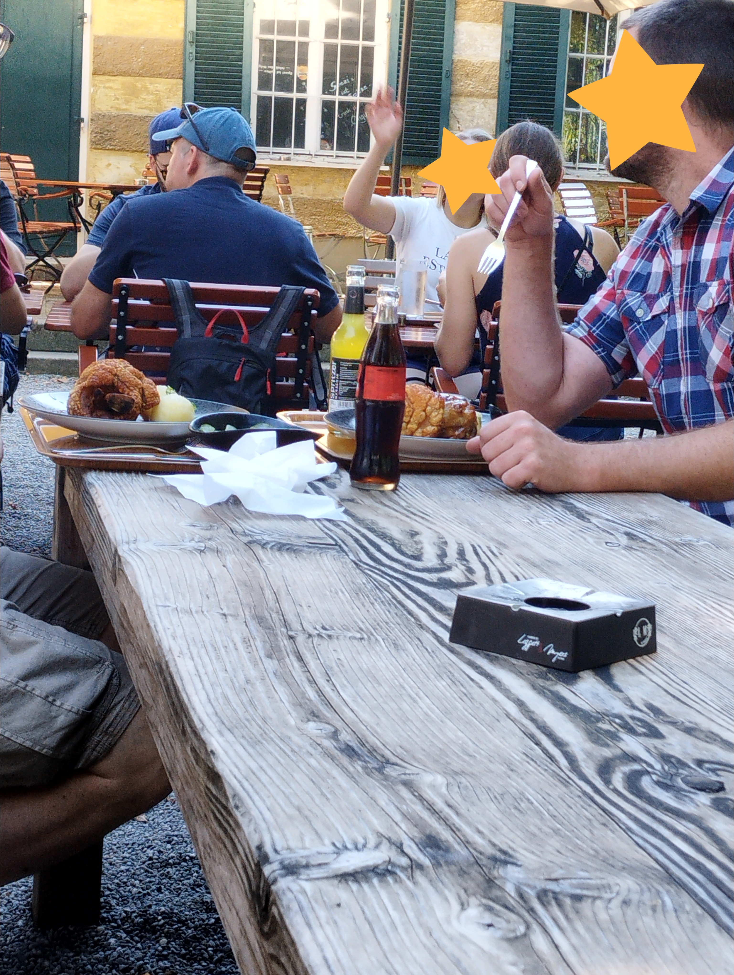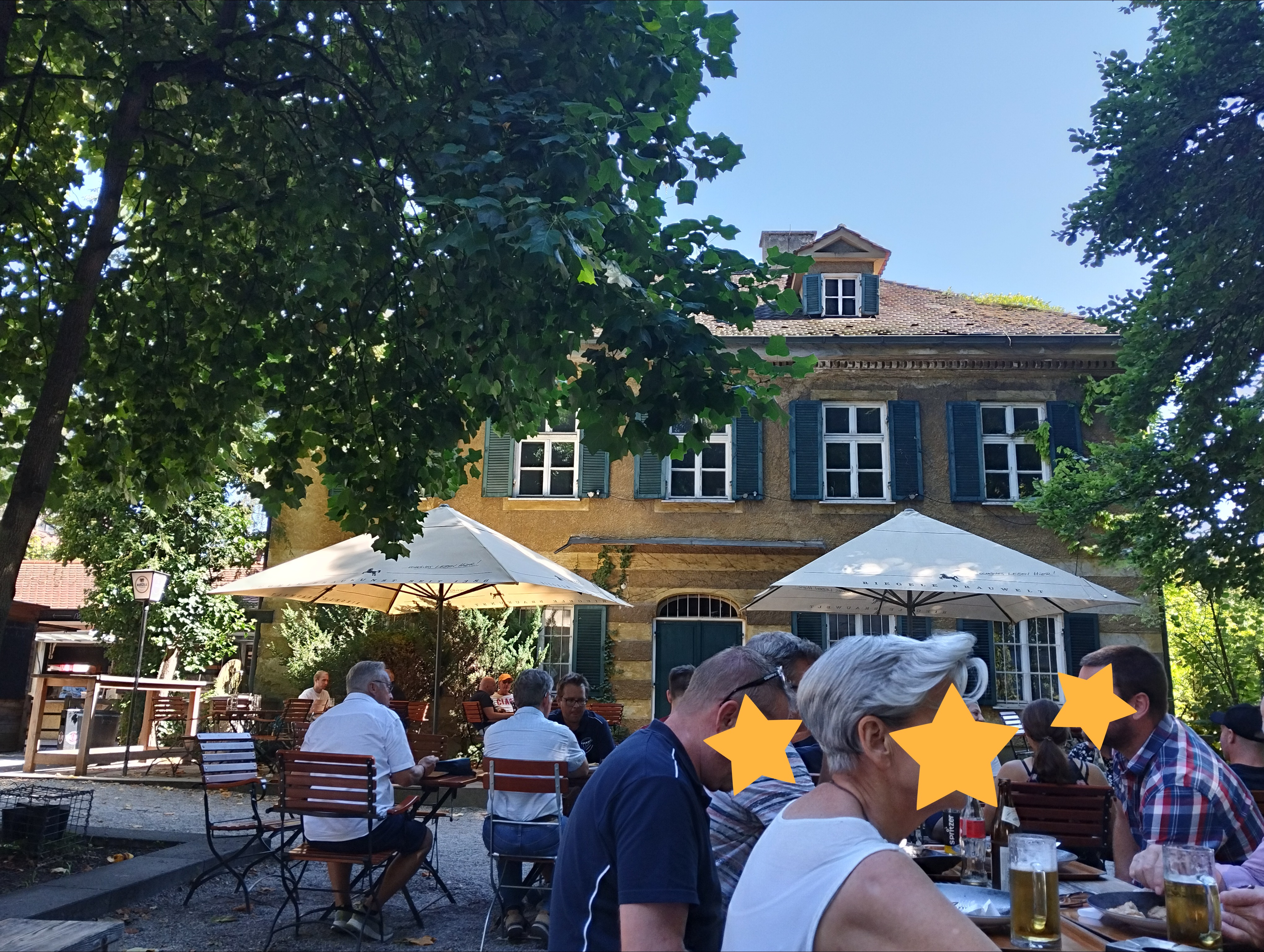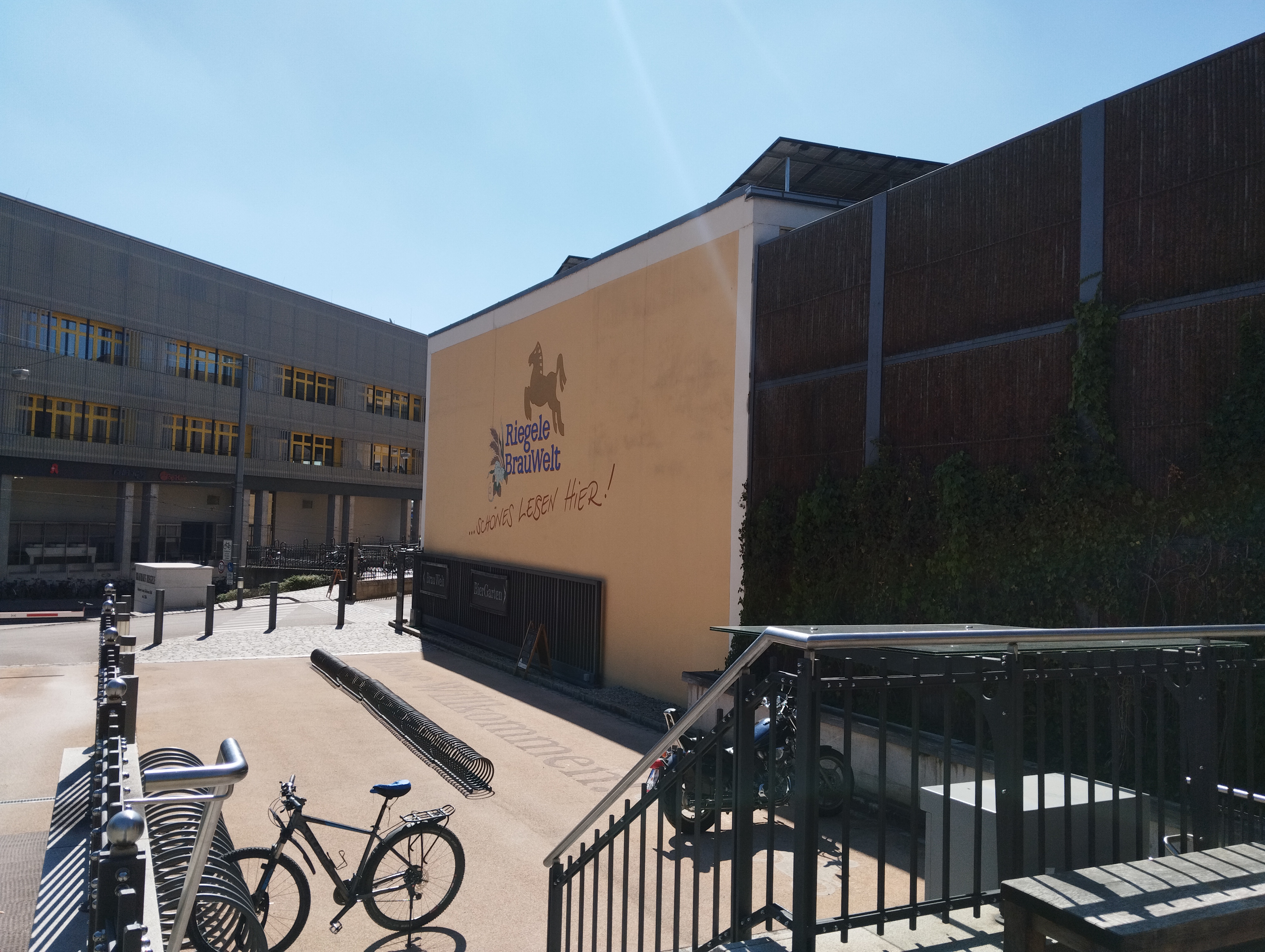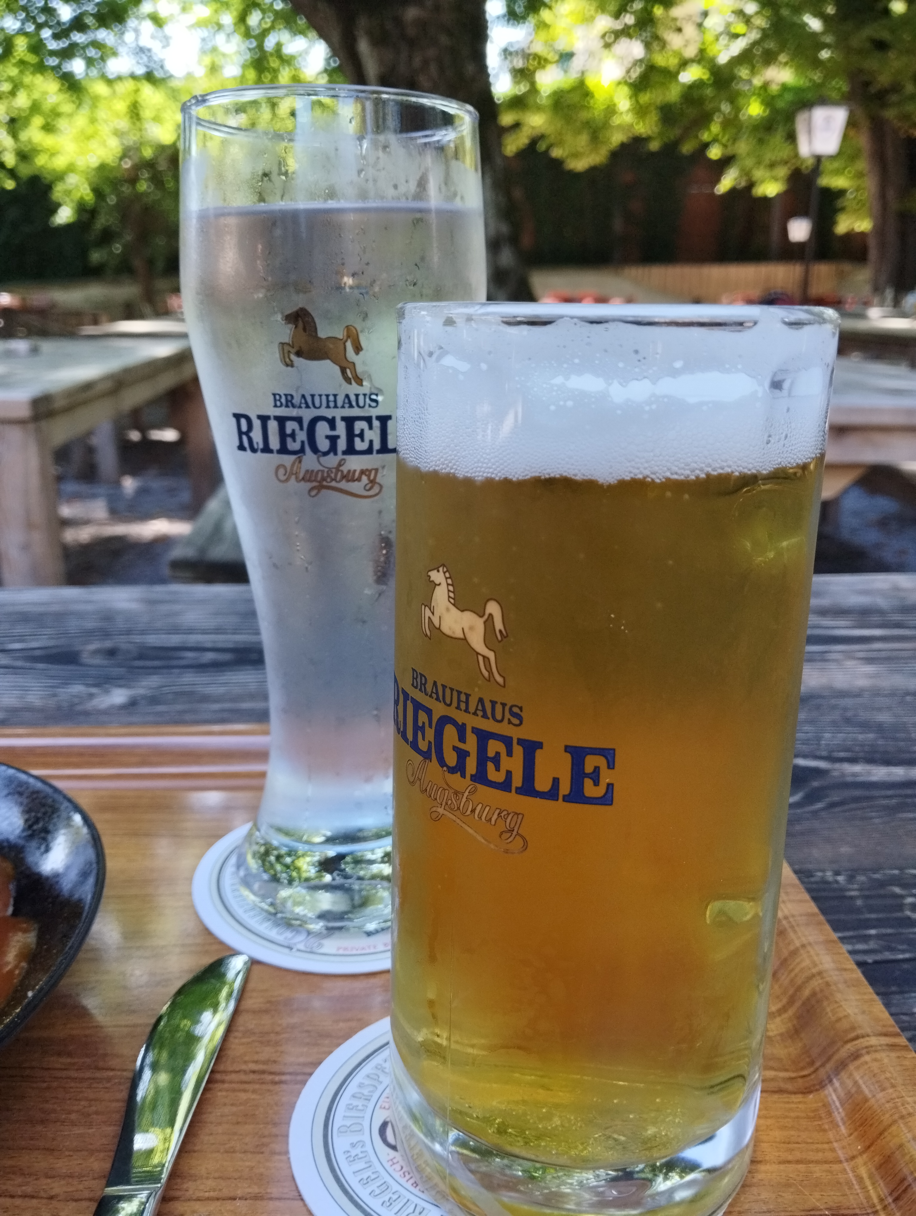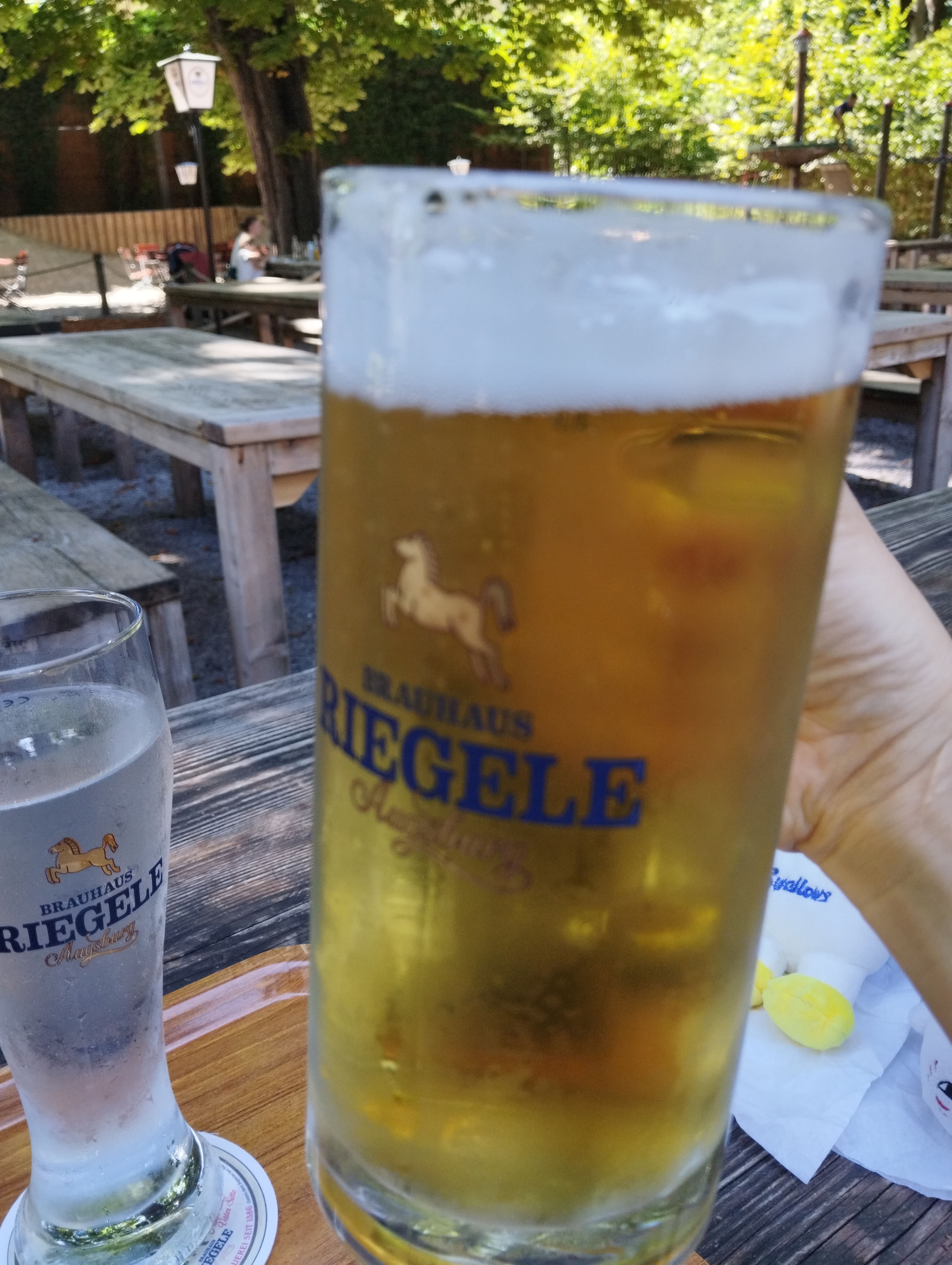 「Riegele WirtsHaus」という地元ビール醸造所併設のレストランというかビアガーデンに徒歩にて向かった。