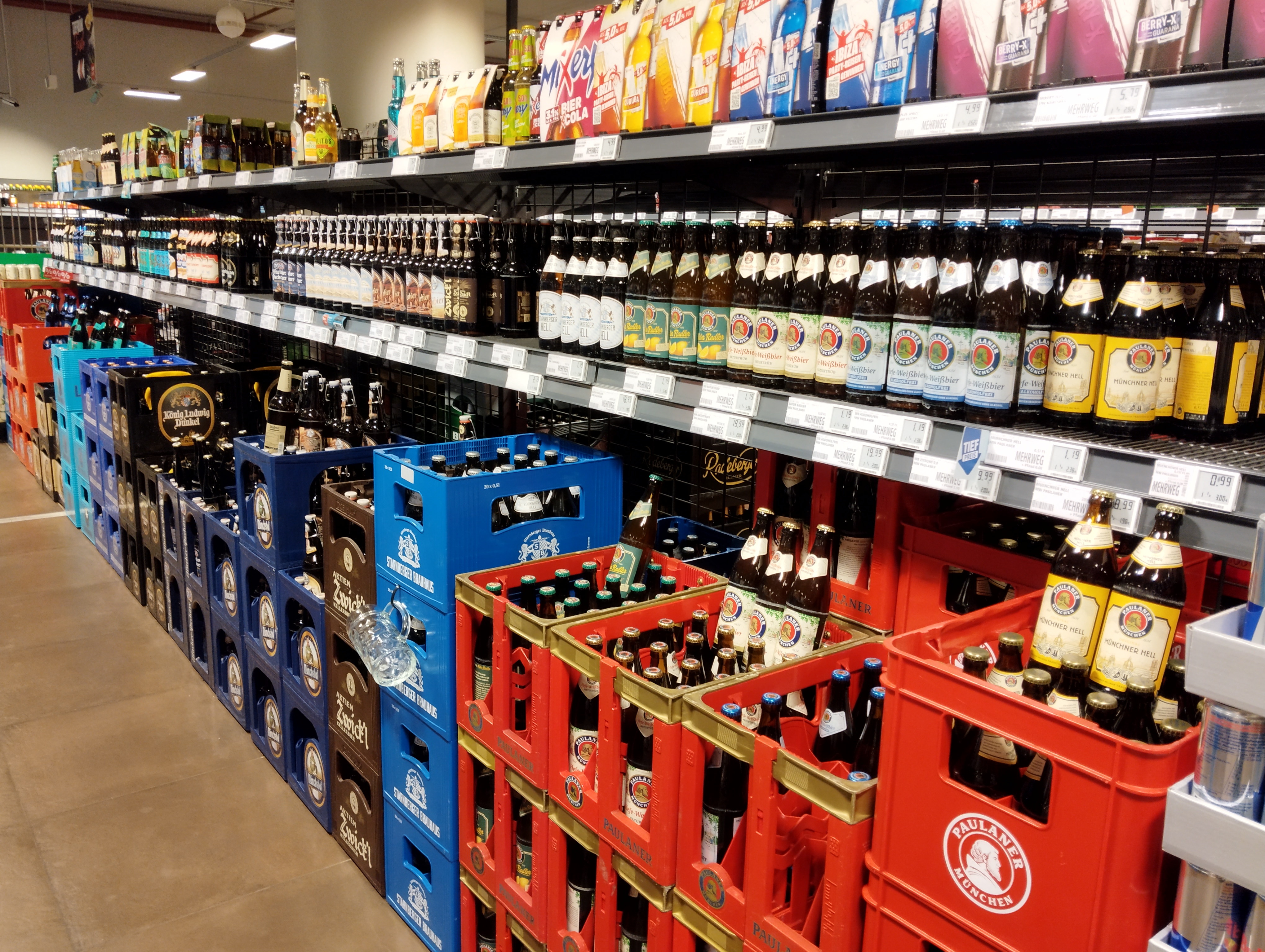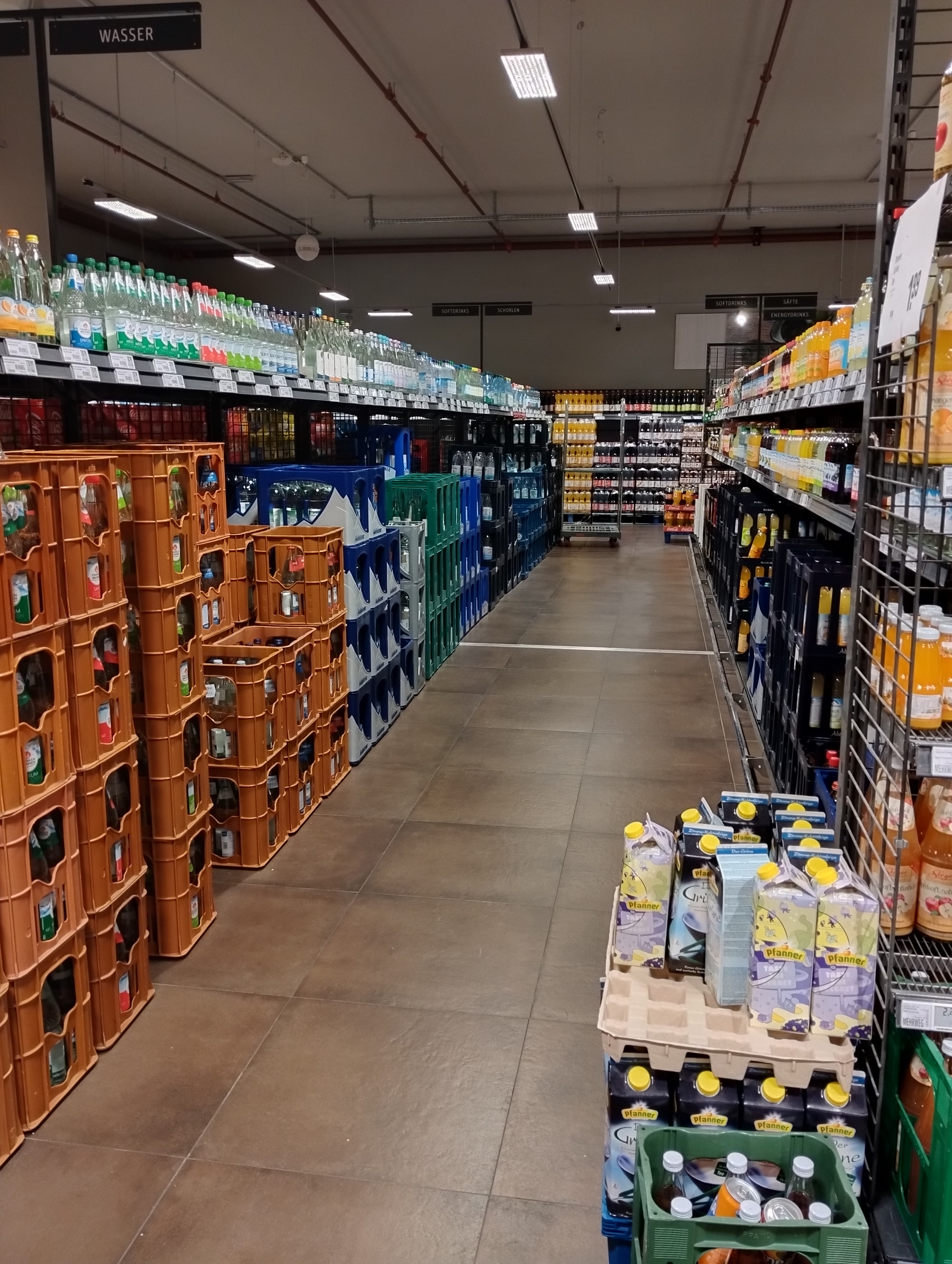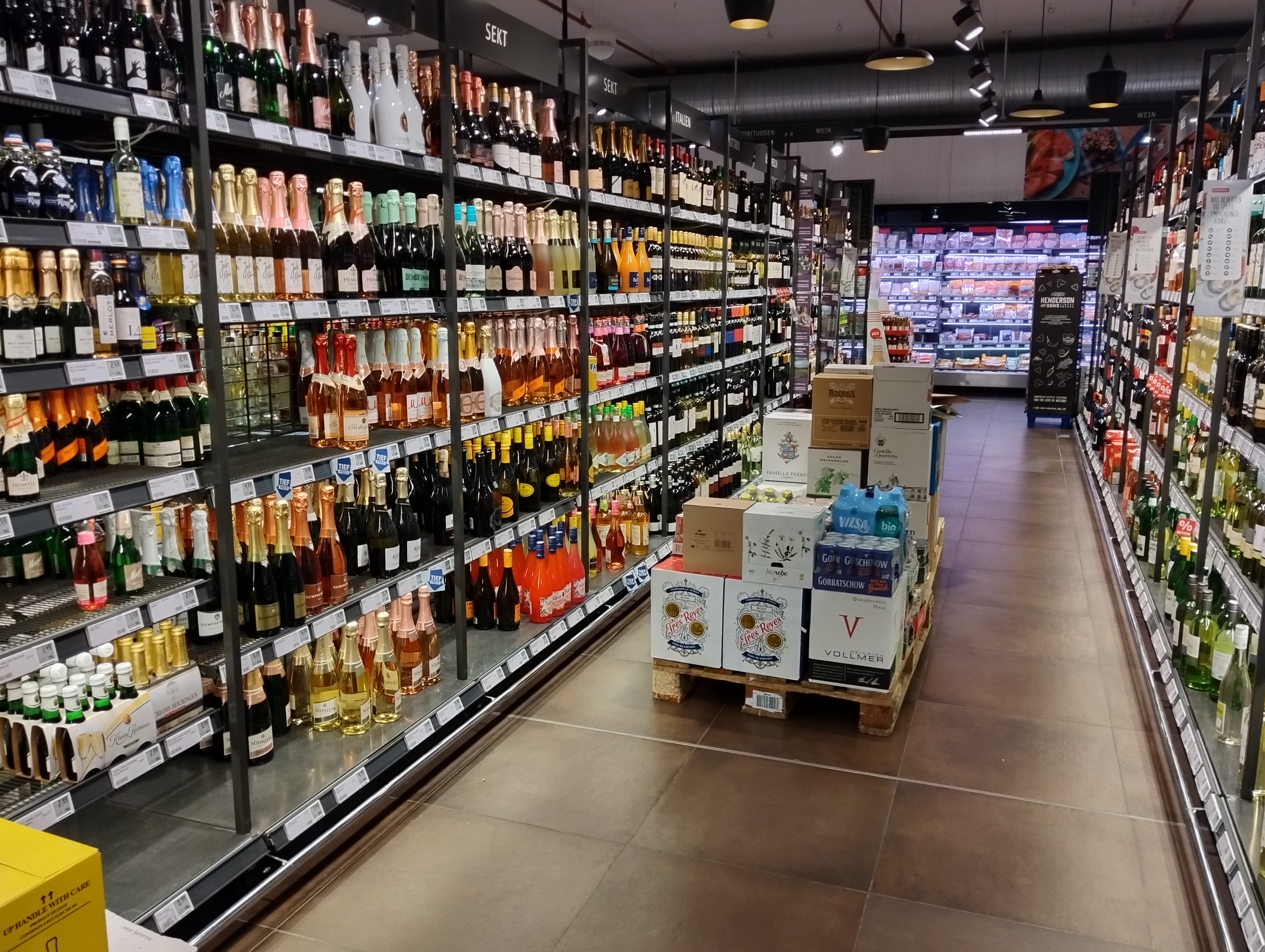 業者さんの倉庫みたいだがここはあくまでもスーパーのお酒コーナー。