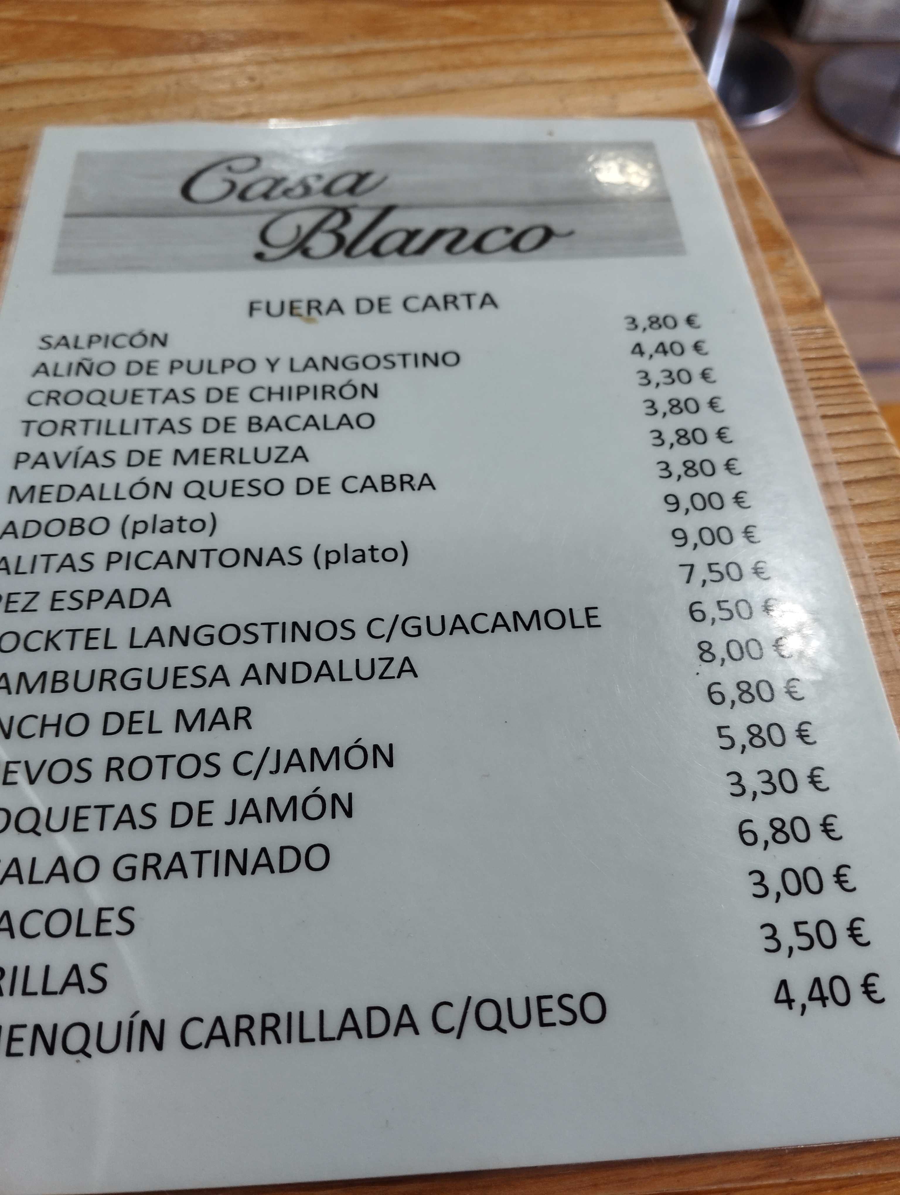 支倉常長氏の像を見たり、公園を見たり、街歩きを堪能後13:00頃に惹かれたレストランへ・「Casa Blanco」さんへ。全般にお手頃価格帯。小皿タイプの「タパス」と一皿タイプの2種類あって◎!何故かそこまでお腹が空いていないので何にしようか…悩んだ末にお店の方のおすすめの品を注文することにしました。まずレモン入り炭酸水。オリーブはサービスで。店内の様子。歩き疲れたのもあってより一層美味しく感じた炭酸水(+レモン)13:02頃到着。カウンター席は常連さんらしき人が常に座っていました。店員さんとも仲が良さそうな雰囲気です。常連になるくらい通えるお店があるって良いな…お店の前にあるオープン席も常連さんっぽい。こちらがおすすめされた「Pan Casa Blanco」(パン・カサ・ブランコ)13:23頃に到着。店員さん1人でやっていたようで出てくるまで若干時間がかかりました。カットされて焼かれたパンの上に生ハム、うずらの卵(焼いたもの)、玉ねぎ、ツナサラダみたいなものが乗っています。付け合せはパタタスフリータス(フライドポテト)生ハムの塩味と玉ねぎ、卵のバランスが良くて美味しゅうございました。炭酸系のお酒によく合いそうです。この街での宿泊を入れていたらお酒を飲めたのにな~とちょっと後悔…思ったより大きくて食べ応えしっかりあります。ハンバーガーのバンズより大きい。美味しくてペロッと完食!食べ終わってお皿を見るとモザイク画のようで青が基調となっていて好みのデザイン。欲しくなりましたわ~炭酸水とお料理、チップ込みで「6.50€」こちらのお店、全体的にお値段がお手頃で一皿の量もそれなりにあり、更にサービスも良くておすすめです!!もっとゆっくりしていたかったですがバスの時間もあるので13:45頃にはお店を後にしました。後こちらのお店、トイレすごく綺麗でしたよ。