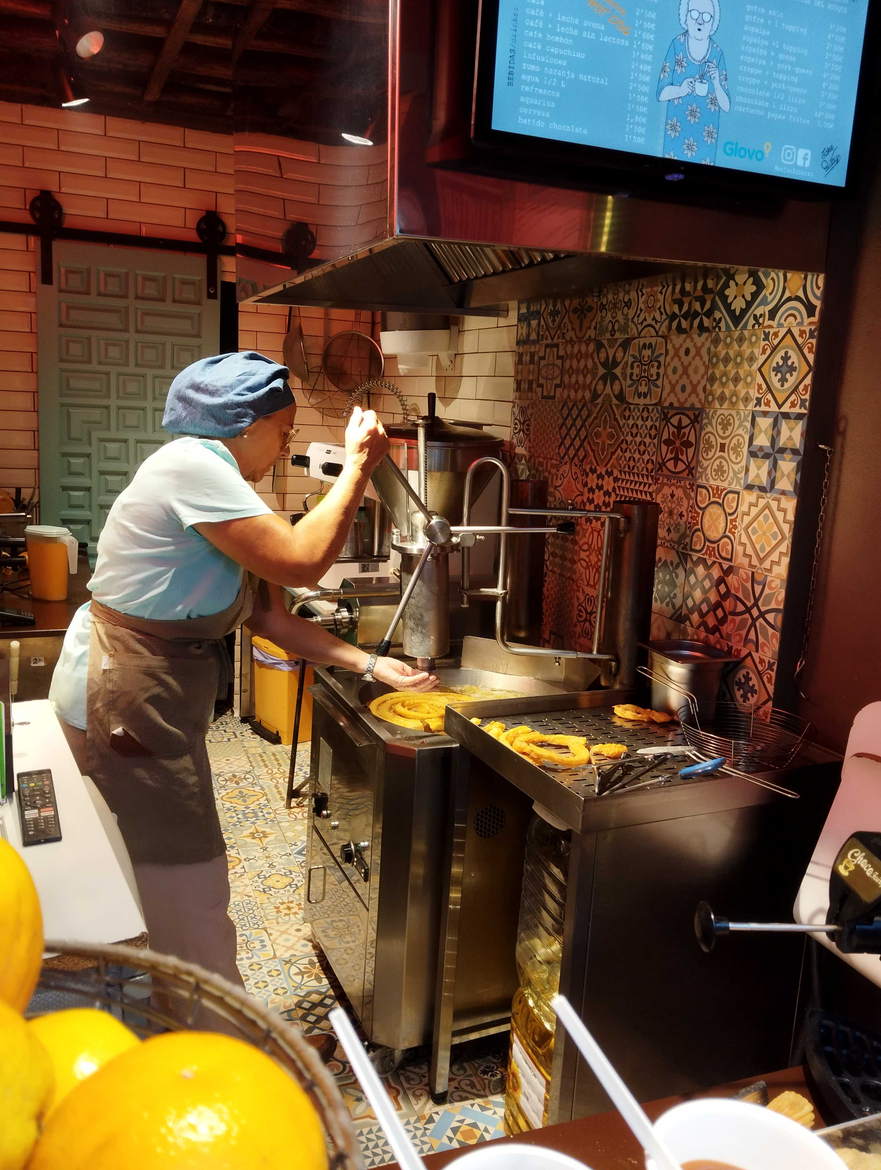 2024年9月25日(水)は久々に朝8:00前というのんびりとした起床。とはいえ、この日は「メスキータ」早朝の無料で見学できる時間帯を狙っているのでそこまでダラダラのんびりはできません。※「メスキータ」は㈪~㈯の8:30~9:30のみですが無料で入場観光できました(2024年9月25日(水)の時点で)身支度をして直ぐにアパートから徒歩一分あるかないかの距離にあるチュロス屋さん「Mojqelchurro」へ出発!8:00くらい、開店直後でしたが既に何人か並んでいてしばし順番を待ちます。店先に飾ってあるのはサンプル。多少時間はかかりますが実物は揚げたてでアッツアツ!チュロス5個で「3.00€」(2024年9月時点)確か現金払いのみだったような…既に8:00過ぎているのに辺りは薄暗く、早朝5:00くらいのような雰囲気ですが人通りはそこそこ。こちらのチュロス屋さん人気店のようでひっきりなしにお客さんがご来店。最初はおばさま1人で作業をしていましたが、途中でお姉さんが参戦。回転率がアップ!普通の紙袋に揚げたてアッツアツのチュロスを入れてもらって足早にアパートへ戻ります。袋が破れかねないもので…熱すぎてその場で食べられませんでした💦砂糖がかかっておらず「チュロス」そのもの。本当ならホットチョコに浸して食べるようですがチュロス単体で買いましたのでそのまんま。熱すぎて手で持てなかったのでお箸の出番。1つは何もつけずに食べました。甘くないけれど、揚げたて熱々で外はパリッとして中はもっちりだったのでこれはこれで大変美味しゅうございました♡テラス席でコルドバの町並みを見ながらチュロスをバクバク。お皿に砂糖をとってチュロスにつけながら追加で2本ほどいただきました。(後2本は残しておいて夜に食べましたが油が回ってイマイチな状態に・・・^^;)こちらは24日の夜に食べたお野菜をブチブチ手でちぎって作った即席サラダ。スーパーで売っていたスペインの焼きそば。何だか…こう…おた◯くソースやそれ系ソースを追加して鰹節や青のり追加して味の調整をしたくなる独特の甘みのある、個性的な焼きそばでした^^;