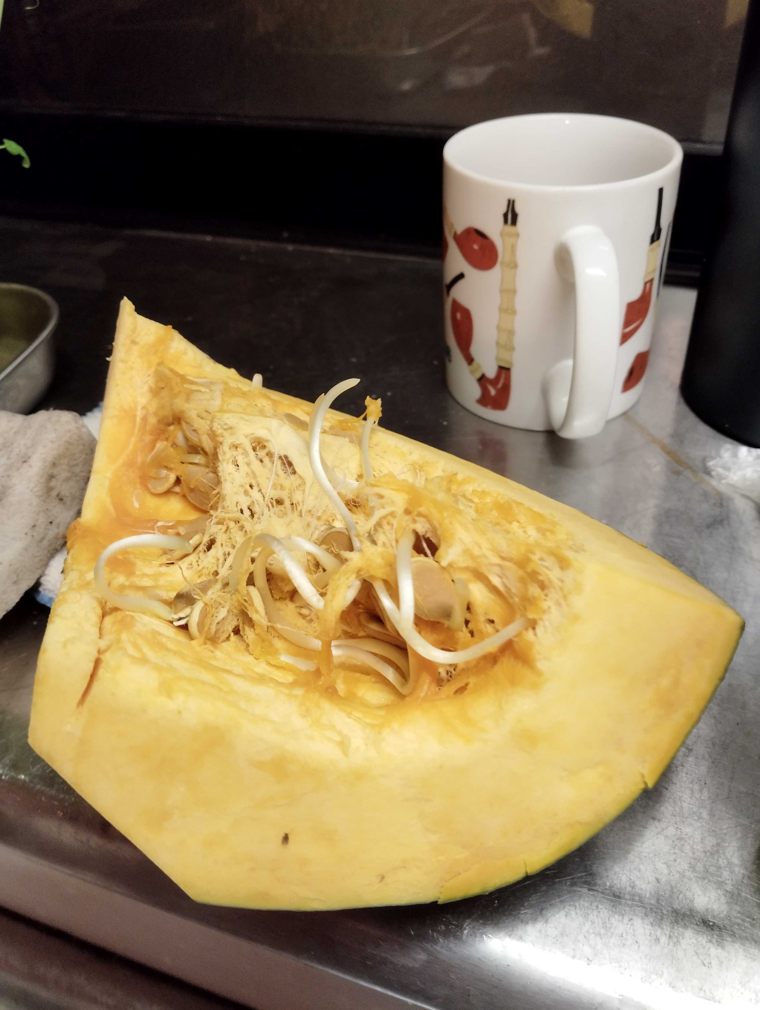 カボチャの煮物を作ろうとして、何とか割ったら中にもやしっぽいものが…何とカボチャの中で種が発芽していたのです!今まで国内外問わず、数多くのカボチャに出会いましたがこのような状態は初めて😳思わずパチリ📸この後、煮物とサラダに変身させました。発芽した種が残っているので家庭菜園で育ててみようかしら?