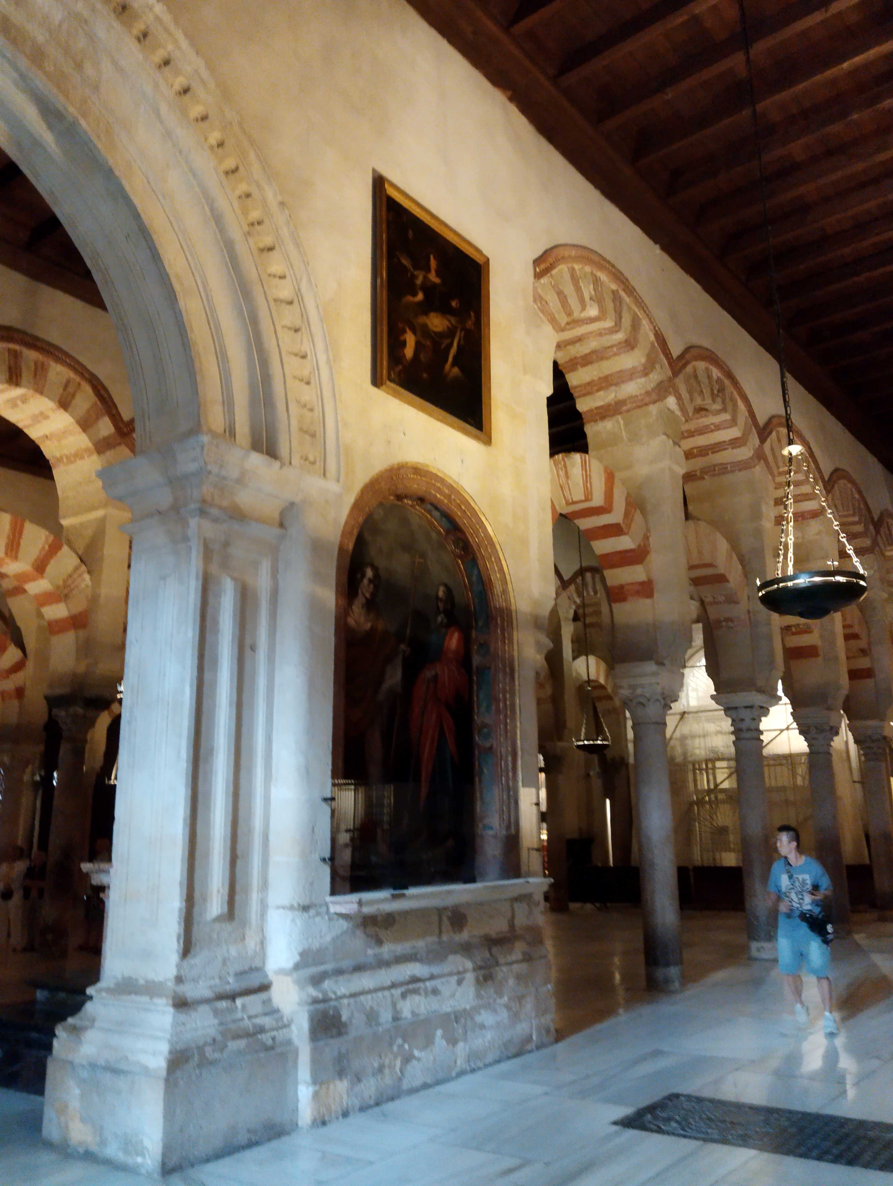 2024年9月25日(水)のメイン・イベントであるコルドバの「メスキータ」入場観光です!月曜日から土曜日、朝8:30~9:30限定で無料入場ができると聞いて行ってみました。15分くらい前で結構な人が入場待ちしています。有料入場の時と入口が違うとのことで注意が必要。寝過ごしたり、何らかの事情で無料入場が出来なくて観光できなかったら悲しいので一応有料の時間帯のチケットは手に入れてあります。※先にネタバレしておきますが、有料観光の時間帯にはメスキータ内にある大聖堂部分が閉鎖されて入ることが出来ませんでした。この日だけのことかどうかは解りませんが、念の為ご注意ください私の後にも人がどんどん並んで大変賑やかに。8:30に開門して入場。皆さん、入ってすぐのメスキータ内全体が撮れる辺りで立ち止まり写真撮影しているので入口付近に人がたまります。旅行本や旅行記で見ていて、いつか実物を見てみたいと思っていた場所に立っているんだ、私!と感動見とれつつも先に進み、人が少ない間に内部をウロウロ見学です。修復部分と当時の部分があちこちにあって宝探しのような感覚で楽しめます。通り過ぎて振り返るとそういった部分があるので面白い。何かが召喚できそうな装飾の本が展示されていて見とれたり^^;ぐはっ!ぼやけてしまっていますが…折角の部分なのでアップします。赤いレンガと白いものを交互に使っている部分と、赤と白で塗っているだけの部分があるらしい。実物だとわかりやすいのですが写真だと「どれがその写真だっけ?」となってしまって…すみません💦人が少ないうちに先に進んだおかげで展示物も見やすかった!ただ、この後チケットを使って再入場しますのでそこまで展示物に時間をかけず先に進みました。有料時間ではまず見られないであろう、ほぼ無人の状態で写真が撮れましたよ!イスラム建築の中に別宗教の施設があるというのも不思議な感じ。大聖堂部分とイスラム建築部分の境目あたりは写真撮影スポットらしく皆さん入れ替わり立ち替わりパチリ📷️大聖堂部分に入ってまずご挨拶をば。写真撮影もたくさんさせていただきました。※この時に大聖堂エリアに入っていて、写真も撮っていて大正解という結果にここだけ見ていると、「メスキータ」内部ではないような錯覚に…大聖堂部分を囲むように大量の椅子が並べられていたので、この後何か宗教的な儀式でも行われたのかな?