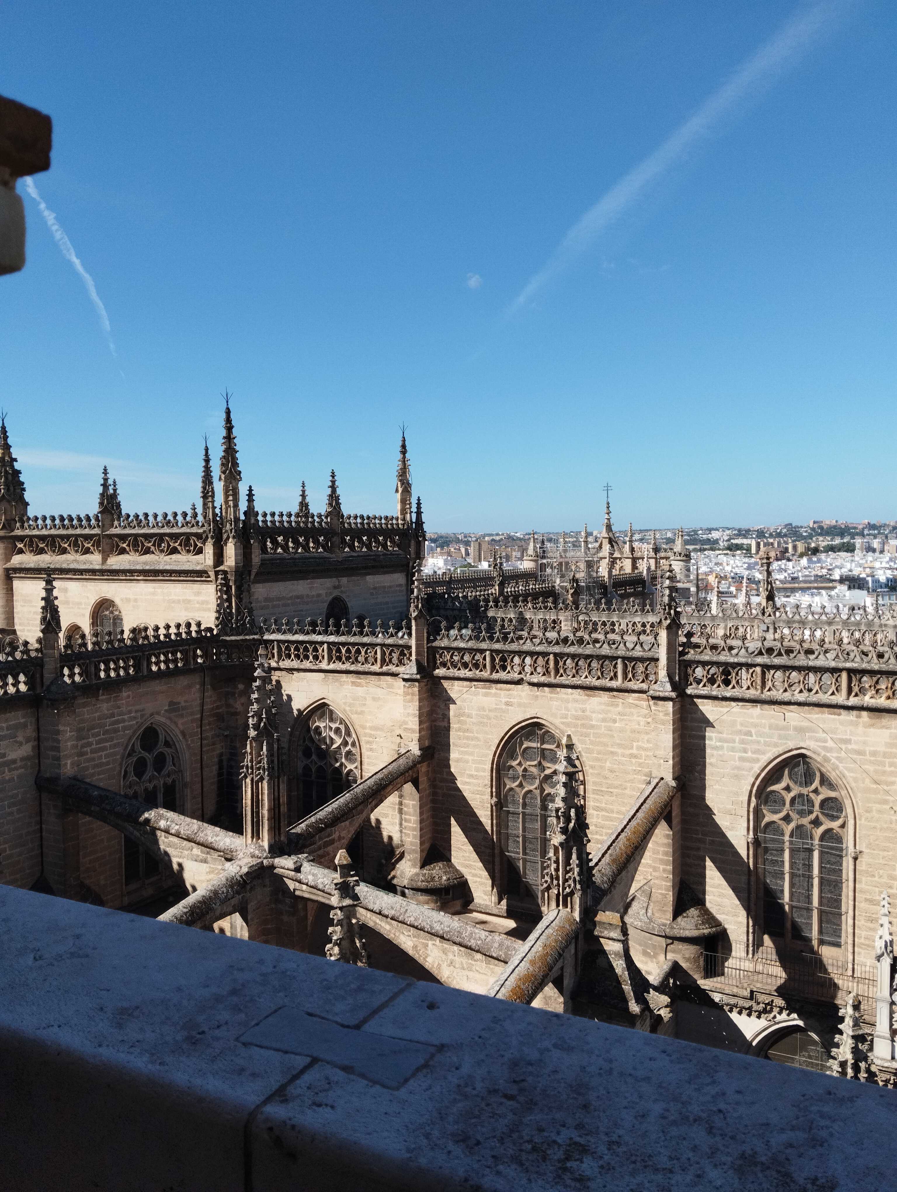 10:30頃に大聖堂の入場列に並びました。がなんと、その列はデジタルチケット専用の入口だったらしく入場直前に「ここからは入れないよー」とスタッフさんから言われてしまいまして・・・全力ダッシュですよ^^;ギリギリ紙媒体でも大丈夫な入口にたどり着き、内部へ入ることが出来ましたセビージャ大聖堂の入口は「デジタルチケット専用」「その他」の2箇所にわかれているようなので訪問の際には十分にご注意を!入って直ぐの辺りの様子です。まだ息切れしていたので落ち着くまでゆっくり動きました。落ち着いてさあ、見学開始ですよ。歩き始めてすぐに「ヒラルダの塔」の入口側を通りました。この時、偶々殆ど人が並んでおらず更に塔の上も今なら人が少ないとのことで先に入ることに!階段は無くとも微妙にキツイ緩やかな坂道が続きます(;・∀・)所々修復前の壁がそのままの状態で見学できるようになっています。かつてはモスクの塔だったらしい。「ヒラルダの塔」頂上部分前の階段が弛んでいるように見える。こうなるまでたくさんの人が昇り降りしていてここまで削れたかと思うと歴史を感じるな・・・大聖堂のてっぺんに到着!壁らしい壁がないので凄まじい風が時折通り抜けていきます。セビージャの町並みがかなり遠くまで見えるので登ったかいがありましたよー!闘牛場かな?馬車も人も小さく見える。大聖堂に来る前に行った元タバコ工場やスペイン広場らしき場所も見えます。「Puente del Centenario」らしき橋もよく見える!まだ上があるらしいが扉には鍵がかかっていて入れず…残念塔からの眺めを堪能してから地上を目指しますが…階段の下りはちょっと怖い(汗)滑りやすいのでお気をつけください。行きは緩やかな上り坂でかなり疲れたが下りは楽…これはあきまへんでー日本語がなかっただけちょっとホッとした。
