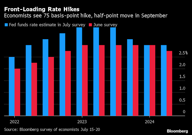 FRB今月0.75Point利上げ後はペース落とす-👔Economist予想✒️Steve Matthews✒️Sarina Yoo🗓2022年7月22日⏰20:00 JST➡️引き上げ幅は➡️9月0.5Point➡️11月と12月は➡️0.25Pointを見込む➡️FF金利目標➡️®️ange上限は➡️23年・初めに➡️3.75%に➡️其の後➡️⛔️停止し➡️利下げへ🎉パウエル🇺🇸米・連邦準備制度理事会FRB)議長率いる金融当局は26・27両日の連邦・公開市場・委員会FOMC)会合で2会合・連続の0.75ポイント利上げを決めた後金利引き上げのペースを落とす公算が大きい◆Bloombergがエコノミスト44人を対象に15-20日に実施した最新調査で此の様な予想が示された其れに因ればFOMCは9月20・21両日の会合では利上げ幅を0.5ポイント利上げすると、見込まれて居るその場合フェデラルファンドFF)金利の誘導目標レンジ※現行1.5-1.75%)の上限は🎄年末までに3.5%と2008年・初頭以来の🗻高水準に引き上げられるコトに成る💢◆Economist更に金融当局が23年の早い時期に0.25ポイントの追加利上げに踏み切って同・目標のレンジ上限は3.75%に達する⚡️と、🙄予想💭その後は引き上げを⛔️停止し🎄同・年末までに📉利下げに転じる⚡️と、見込んで居る金利先物市場も今月のFOMC会合での0.75ポイント利上げを想定して居るが9月の会合に就いては市場が現時点で織り込んで居る0.75ポイント利上げの確率は50%を上回って居りエコノミストの予想は稍(やや)🕊ハト派的と、云える只、エコノミストが予想する一段と広範な道筋は市場が織り込んで居るモノよりも稍(やや)🦅タカ派的だ◆FOMC6月の会合で決めた0.75ポイント利上げは1994年以来の大きさでパウエル議長は会合後の記者会見で、7月には0.5ポイント乃至(ないし)0.75ポイントの利上げが検討される可能性に言及その後の他の当局者の発言を見ると多くが0.75ポイントに集中して居るオックスフォード・エコノミクス🇺🇸米国担当チーフエコノミストキャスリーン・ボストジャンシク氏は調査への回答で、「労働市場は引き続き力強く個人消費は堅調であることから、金融当局には急ピッチでの政策金利引き上げを続ける自由裁量の余地がある」と指摘した7月会合での0.75ポイント利上げ見通しには圧倒的なコンセンサスがあるが、野村証券の米経済チームは唯一、1ポイント利上げ予想を示した原題:Moron Powell...原題:Seen Slowing Fed’s Hikes...原題:After 75 Basis Points Next Week(抜粋)🌟超📰黒星★承認💮