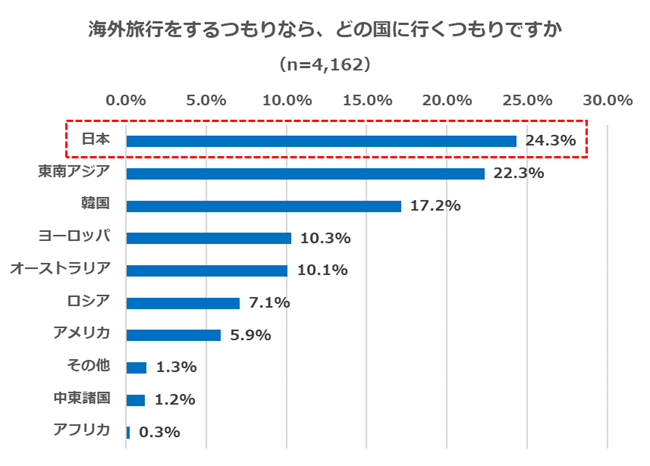 インバウンドニュース宿泊統計🐍2025年🌸春節の🇨🇳🀄️国人旅行動向を調査🇯🇵日本が1位一番人気の場所は?2025.01.27やまとごころ編集部インタセクト・コミュニケーションズ株式会社は、1月28日〜2月4日の春節期間における中国人の日本旅行の最新動向を探るため、調査を実施し、その結果を発表した。同調査は「WeChat」のアンケート機能を使い、6383人の中国在住者(男性2700名、女性3683名)を対象に、2024年12月6日〜13日の間に実施された。春節旅行先、日本がトップ。北海道が7割弱で圧倒的な人気2025年春節期間に海外旅行を予定している人は全体の約3分の2を占める4162人で、そのうち日本が1013人(24.3%)で1位となった。次いで東南アジア(22.3%)、韓国(17.2%)、ヨーロッパ(10.3%)、オーストラリア(10.1%)と続く。日本、東南アジア、韓国の1位〜3位を合わせると2657人(63.8%)となり、アジア地域の人気が高いことがわかる旅行先に日本を選択した1013人に、複数回答で訪問予定の都道府県を聞くと「北海道」が695人(68.6%)でトップになった。中国でブームとなっているウィンタースポーツができ、雪景色や温泉を楽しめることが理由として挙がっている。2位は「東京」(46.2%)、3位は「大阪」(26.9%)で、4位の「京都」(16.1%)を大きくリードしている。大阪、京都、奈良を合わせると54.3%となり、「関西エリア」の人気が高い◆3~5泊が主流◇訪日旅行を計画する上で重視していることとは?誰と一緒に訪日するか、という問いに「カップル」と答えた人は1013人のうち388人(38.3%)で最多となった。次に「クラスメート、友達など」(24.2%)、「複数世代の家族」(13.8%)と続く。今回の調査では回答者全体の6割が30代以下のため、カップルもしくは友人同士の回答が多い傾向にあると推察された滞在期間は「5泊」が最も多く27.5%、次いで「4泊」(22.3%)、「3泊」(21.7%)と、3〜5泊が全体の7割以上を占めて居る然し「6泊以上」も24.7%と、4人に1人が1週間の長期滞在を予定していることも明らかになった宿泊施設については「伝統的な和風温泉旅館」(44.5%)が最も人気があった。2位以下は「民泊」(22.0%)、「ビジネスホテル」(16.9%)と続き、「星付きホテル」(11.7%)よりも手頃な宿泊施設を望んでいることが分かった◆訪日旅行⚡️計画する上で意識していることを複数回答で聞くと「多様な食や文化習慣を持つ訪日外国人旅行者を含めた全ての人が、快適・安心なインクルーシブ旅行になりそうかどうか」が最多の78.5%だった◆移動や決済⚡️予約やレストランでの注文etc.デジタル/テクノロジーを活用できるか」(47.5%)、「オーバーツーリズムになっていないか」(43.2%)などの回答も、それぞれ4割を超えて居る📰黒星★ULTIMATE☆新聞【🇨🇳春節🧧】