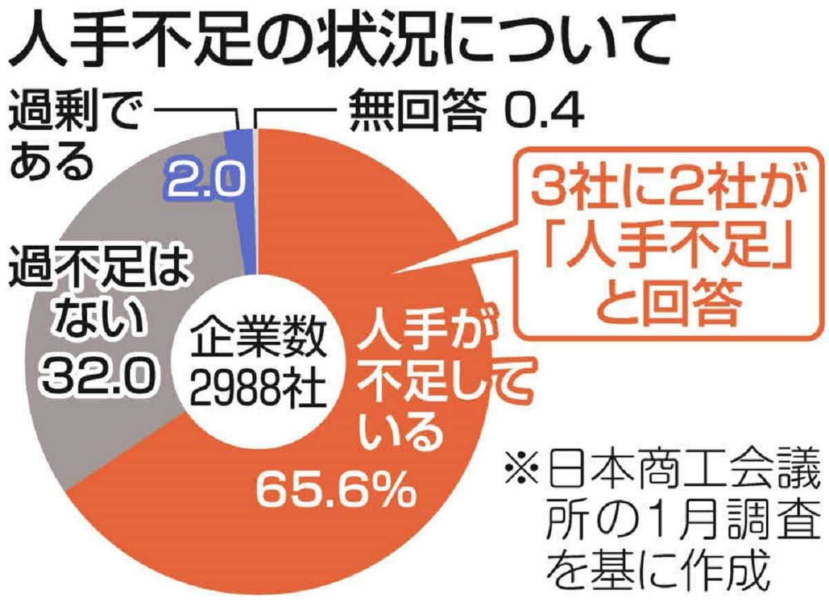 同社が約1万社から回答を得た昨年11月の調査では、景気回復に必要な政策を「人手不足の解消」と答えた割合が、40.7%(複数回答)と最多だった。同社の旭海太郎(かいたろう)さんは「コロナ禍からの経済活動の回復で、人手不足が(経営上の)最重要課題となっている」と話して居る