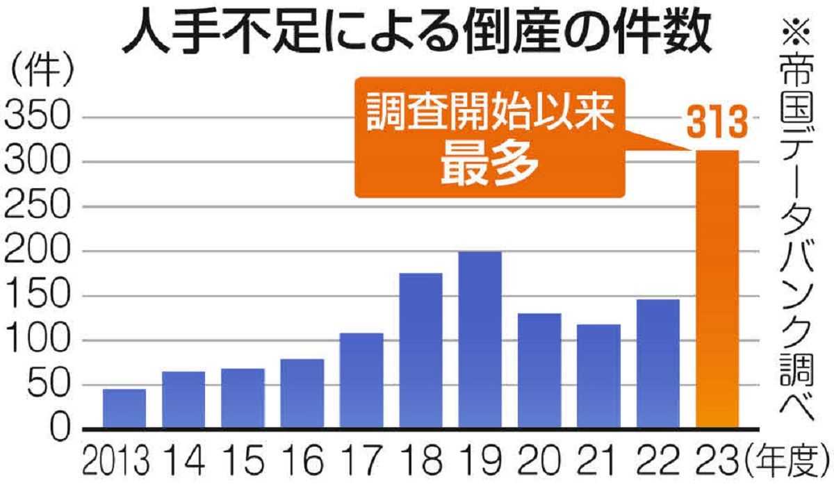 帝国データバンクによると、離職や求人難などによる人手不足倒産は23年度に313件と、これまで最多だった19年度の199件を大幅に更新