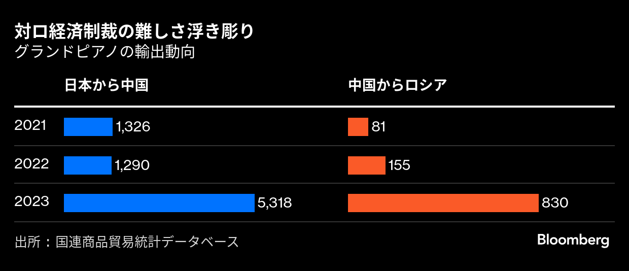 日本からロシアへのピアノ輸出は急減していることが統計で示されている。だが、国際連合のデータによれば、経済の悪化で消費が落ち込んでいた中国へのグランドピアノの輸出が23年に前年比300%増加