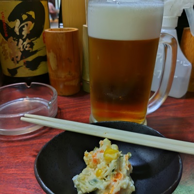 本日は熊本居酒屋一人旅。ホテルで小休止をしてからの19時過ぎの出発です。カウンターに空きがあった「居酒屋瀬戸」さんへ入りましょう。生ビールセットをお願いします。ポテトサラダで美味しくいただきましょう。生ビールから3分ほどでマイターン。お刺身盛り合わせが到着です。ちょうどよいボリュームです。揚げ物も到着です。ベジタブルファーストでお野菜からいただきましょう。キャベツとキュウリが美味しいですね。生ビールが無くなったので焼酎にチェンジです。芋焼酎は三岳でお願いします。美味しいですね。ロックスタイルです。串3本セットがやってまいりました。これで生ビールセットは最後のようです。遅い時間にラーメンを入れてしまったので、このぐらいのおつまみが適量ですね。最後の一杯は麦焼酎でいきましょう。大分の兼八をお願いします。大好きな焼酎です。さて、そろそろバーへと向かいましょう、どうもごちそうさまでした。「居酒屋瀬戸」熊本県熊本市中央区花畑町13-14居酒屋瀬戸 (居酒屋 / 花畑町駅、辛島町駅、熊本城・市役所前駅) 夜総合点★★★☆☆ 3.5