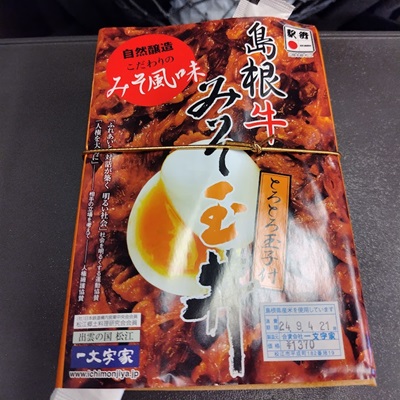 本日のお仕事は松江。午前中の仕事が長引き、ランチタイムにゆっくりいただく時間はありません。次の目的地までの特急電車でお弁当をいただきましょう。松江駅にある「一文字家」さんで島根牛みそ玉丼を購入です。特急電車で事務仕事を終えてからのランチタイム。午後もお仕事ですのでアルコールは我慢です。冷たいお茶でいただきます。濃い目の味付けの牛肉。ビールが欲しくなる味付けです。とろとろのたまごと一緒にいただくと、すき焼き風ですね。箸休めのお漬物も良いコンビです。最後まで美味しくいただきました。「一文字家 松江駅売店」島根県松江市朝日町472-2 JR松江駅 1F06:30 - 19:30一文字家 松江駅売店 (弁当 / 松江駅) 昼総合点★★★☆☆ 3.0