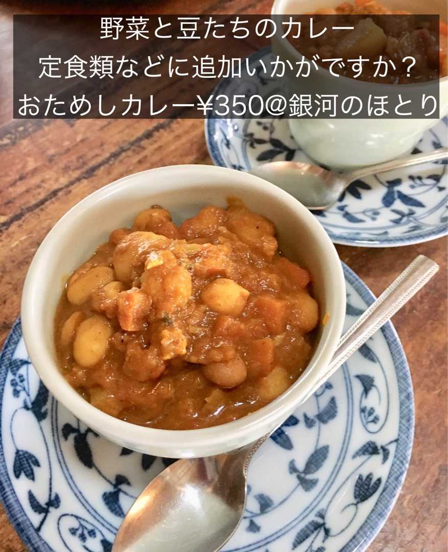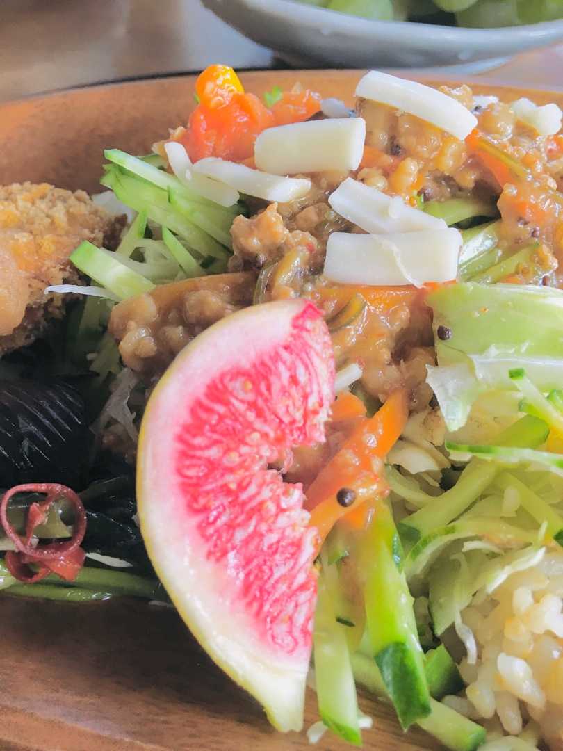暑さと寒さのハザマ この時期は、 雑穀と大豆ミートの肉味噌風をつかった 玄米ごはんにきゅうりサラダたっぷりのせた 【カッパサラダライス¥780】 お豆腐にからめた 【雑穀マーボー豆腐¥800】 どちらもご注文いただけます。 厨房の外の完熟イチジクを 添えてます。 どちらもするりと食べられます。 野菜と豆たちのカレーのお持ち帰り¥680 スパイスも豆たちも 仕込みの都度、調合しています! どうぞご利用くださいませ。