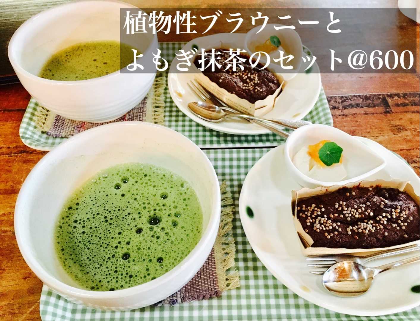 水曜日は定休日ですが 9月28日火曜日も 都合により臨時休業させていただきます。 よもぎ抹茶のケーキセットは、600円 たんぽぽコーヒー、竹すみ入り穀物コーヒーとのセットは550円 植物素材のみの ラム酒につけたプルーン入り ブラウニー または、 ラム酒に着けた干しあんずと 煎り大豆のケーキ どちらかと よもぎでおこした豆乳ヨーグルト添えです。 ひさしの下のお席で 庭でも眺めながらいかがでしょう? ベジタリアンやビーガンのお客様も多いのですが せめてチーズは食べたい!という方も多いので セルロースなどはいっていない ナチュラルチーズと塩のみの 『よつ葉チーズ』をのせています。 チーズ抜きもできます。 チーズ以外は、植物素材です!